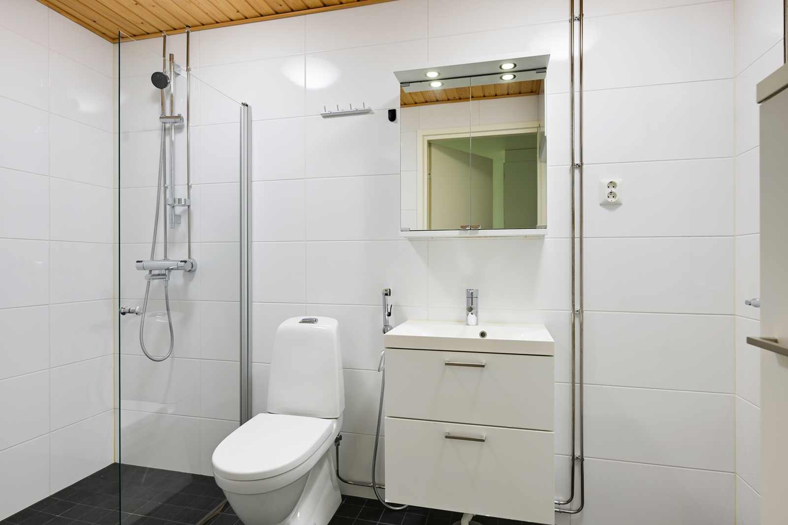 Suihkuseinä, suihku, pesukoneliitäntä, wc-istuin, peilikaappi ja kiinteät valaisimet, seinät (kaakeli), lattiat (laatta) |
