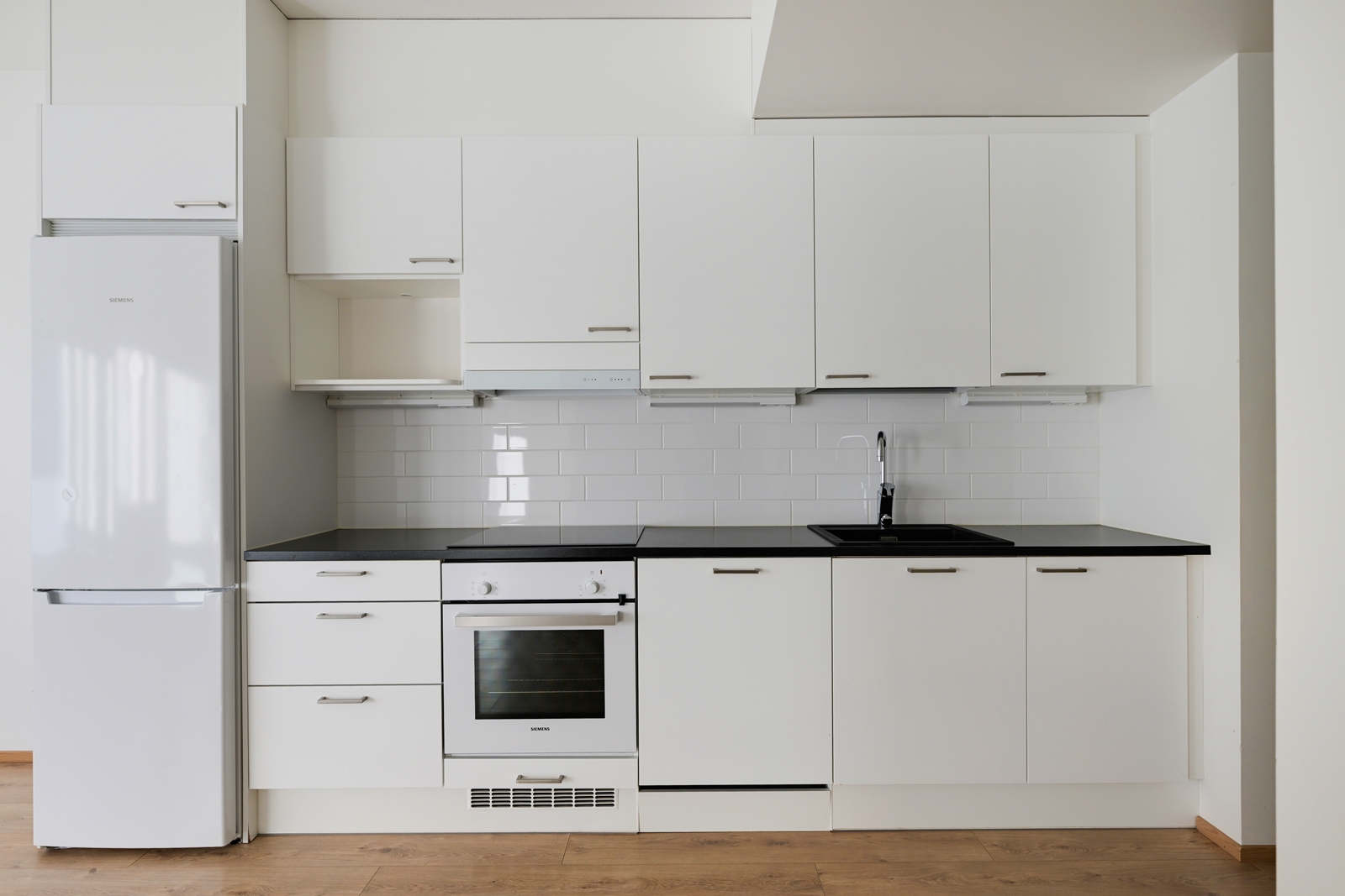 Liesi (liesitaso, erillisuuni), seinät (maali), lattiat (parketti), erillisuuni, liesituuletin, astianpesukone, jääkaappipakastin ja liesitaso |