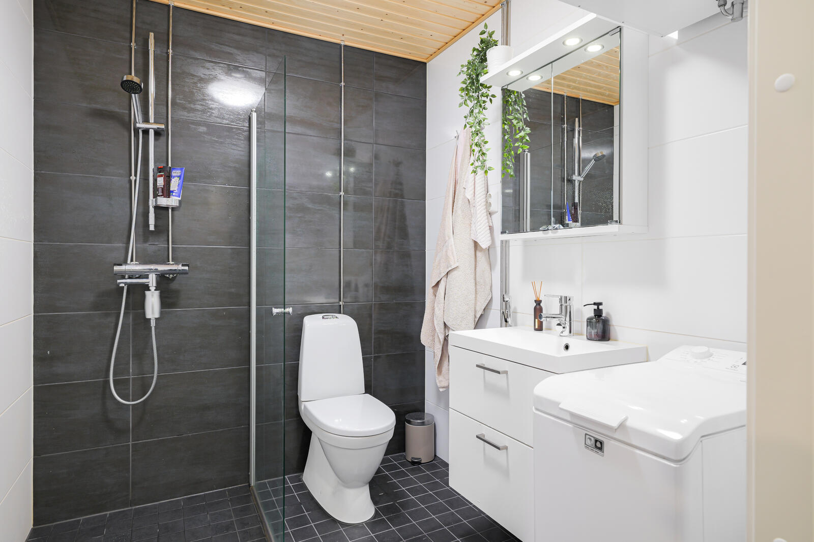 | Kylpyhuoneen kuvaus | Peilikaappi, suihkuseinä, suihku, wc-istuin, allaskaappi, pesukoneliitäntä ja kiinteät valaisimet, seinät (kaakeli), lattiat (laatta) |