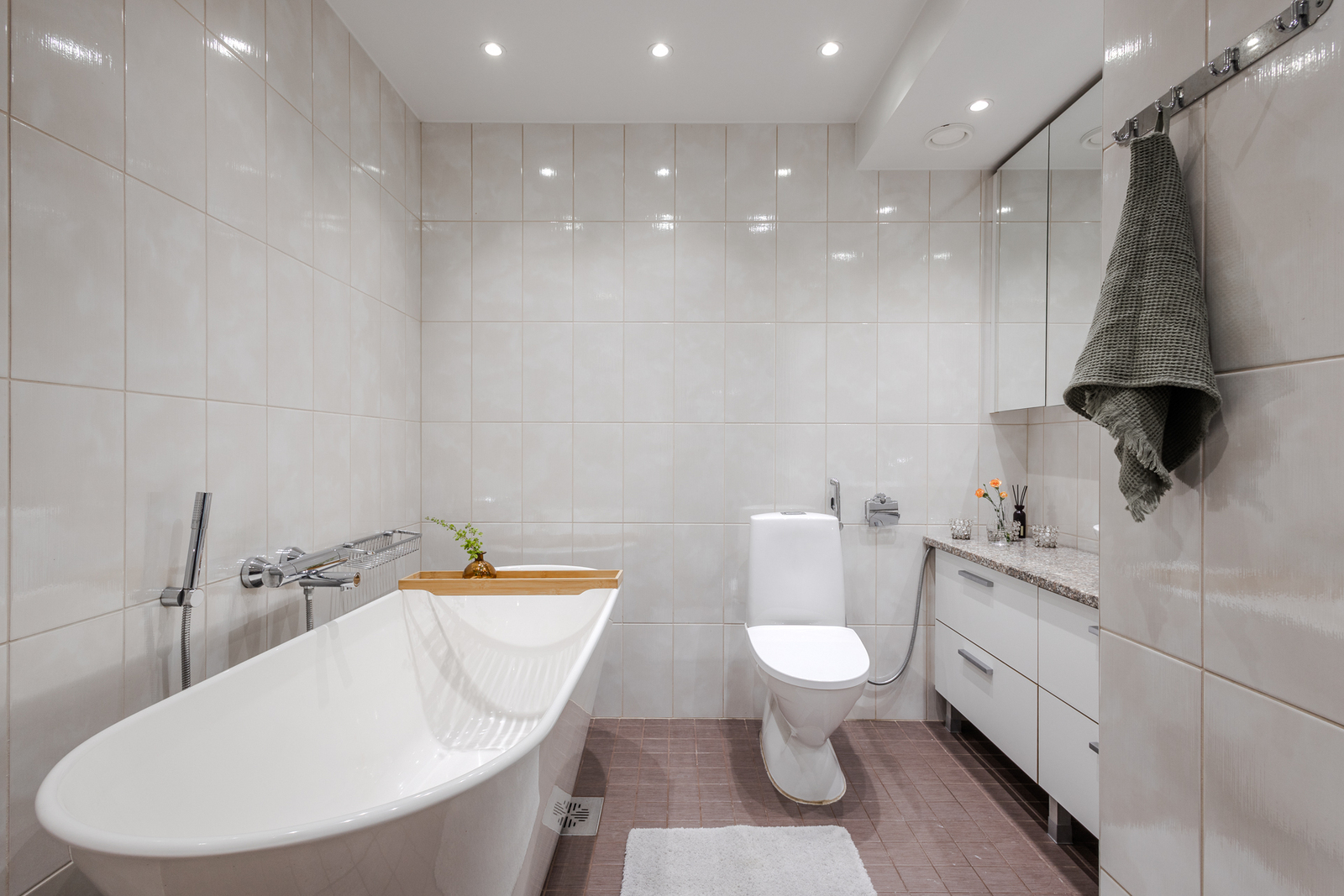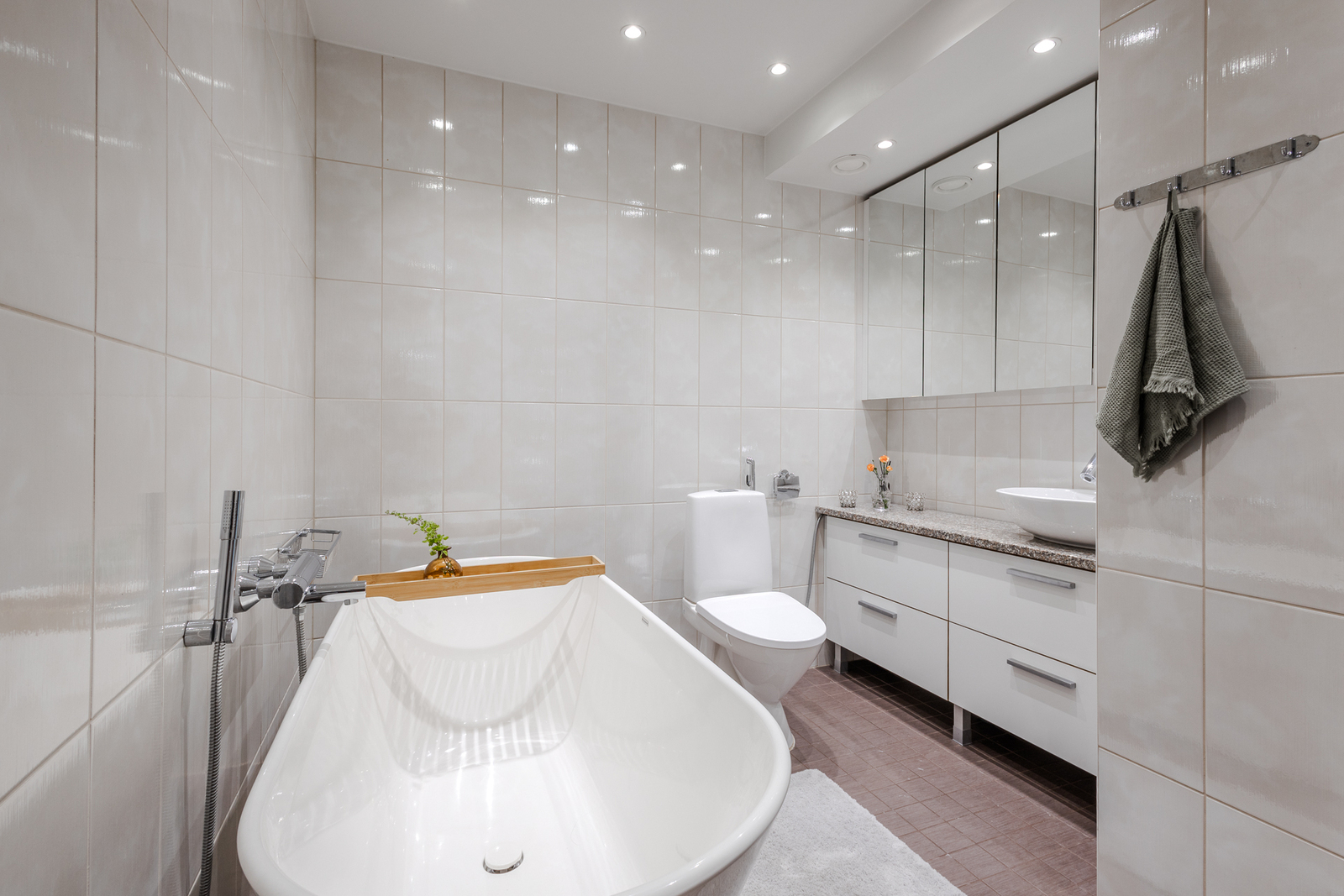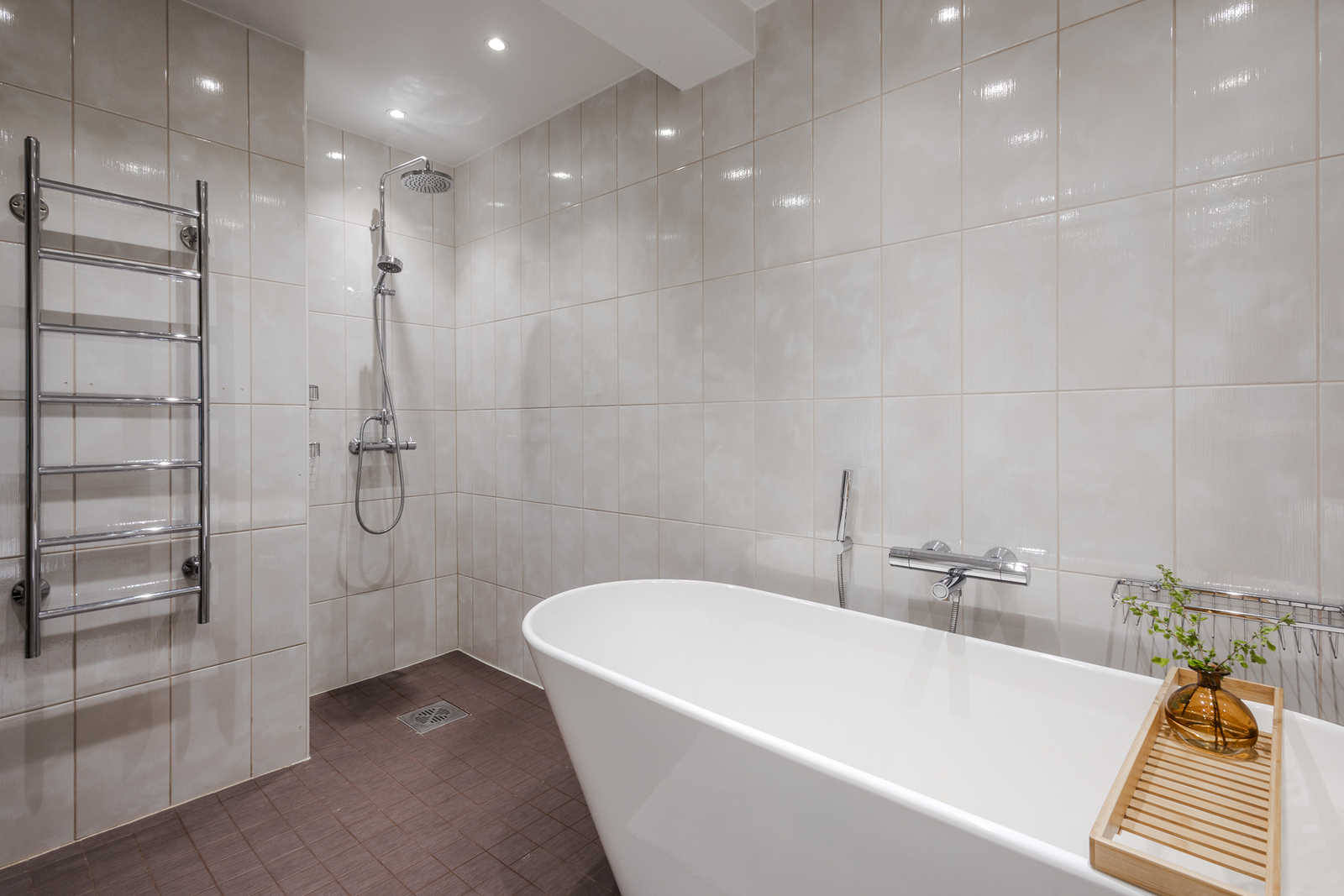 | Kylpyhuoneen kuvaus | Kylpyamme, lattialämmitys, wc-istuin, suihku ja kiinteät valaisimet, seinät (kaakeli), lattiat (laatta) |
