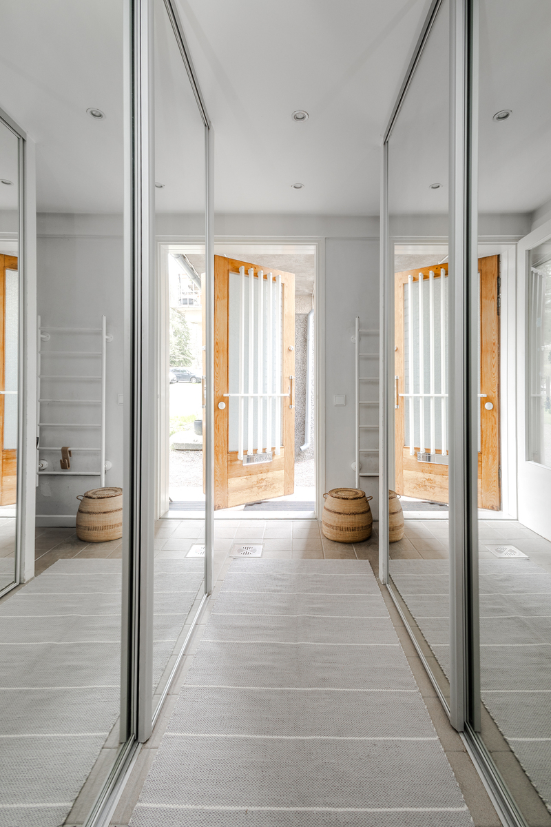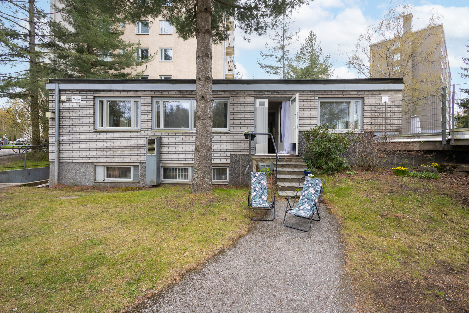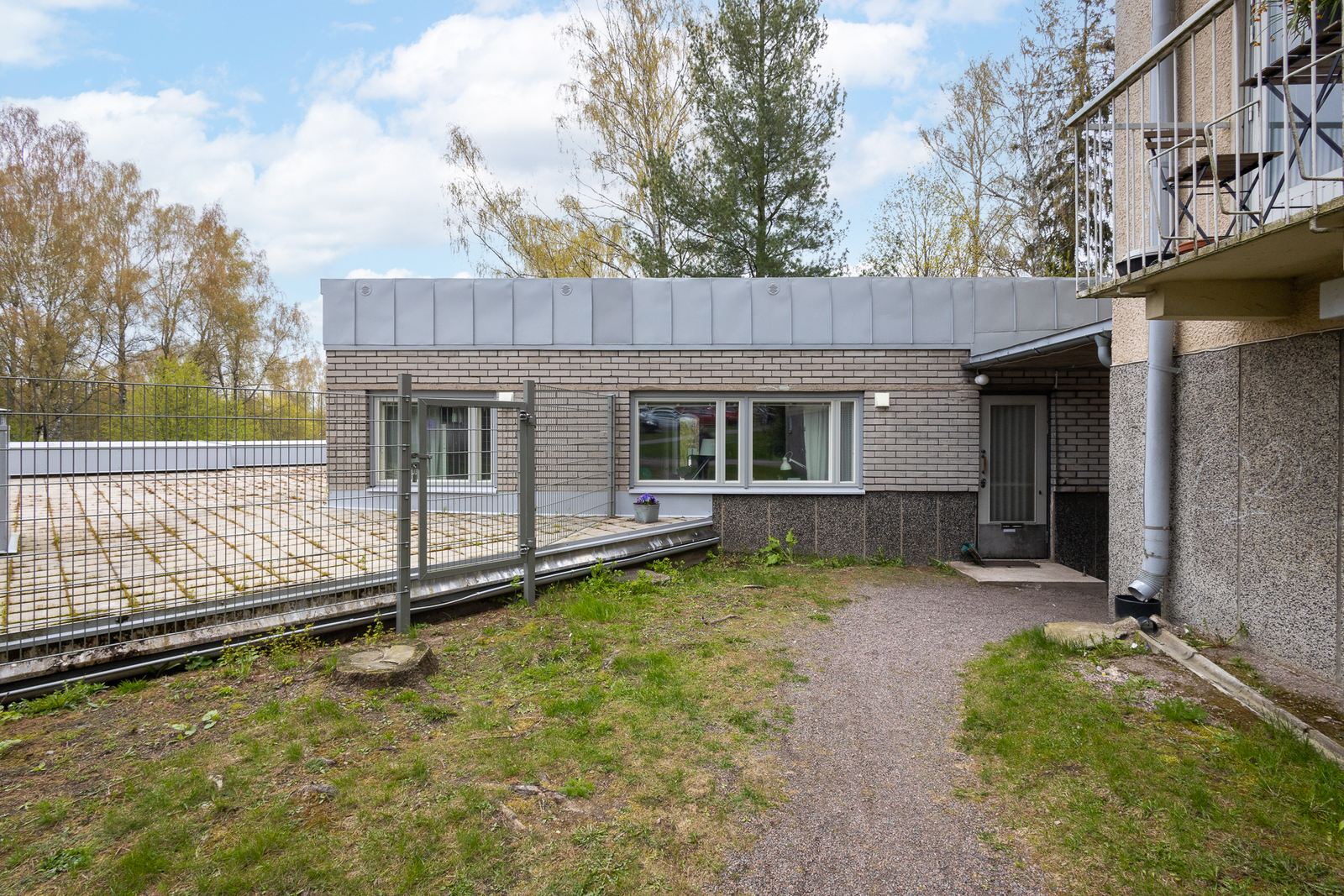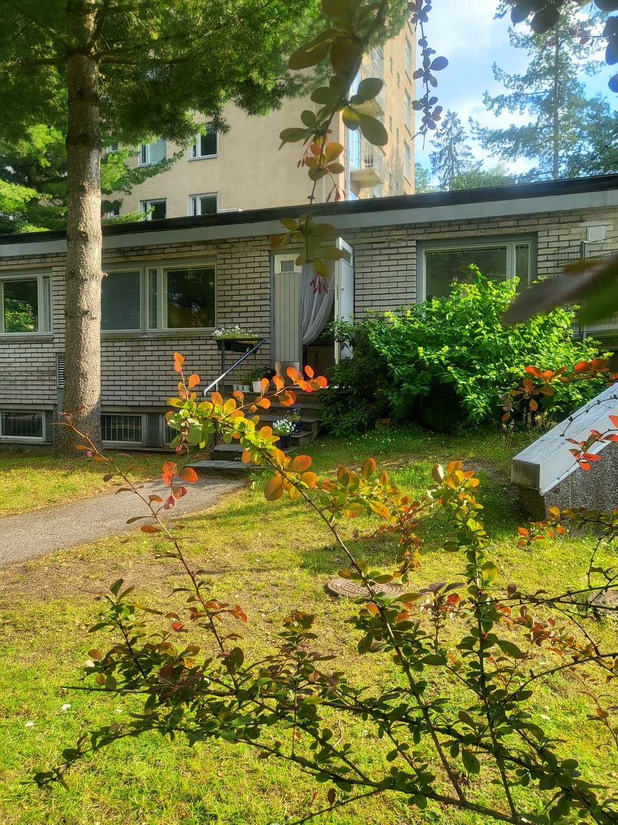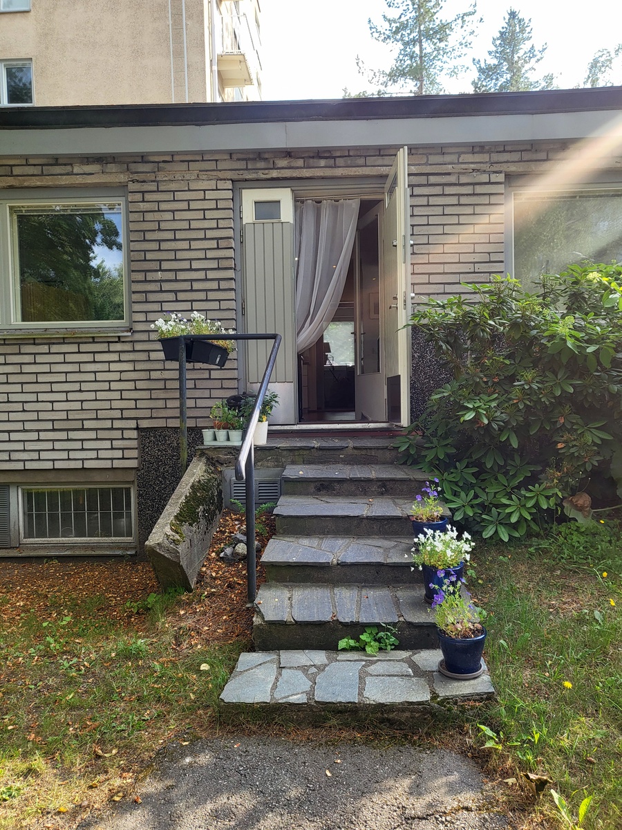 Pääsisäänkäynti on talon takaa ja siinä oleva pieni piha-alue on muodostunut luonnollisella tavalla talon òmaksi pihaksi` vaikka kuuluukin taloyhtiön hallintaan. Sama ajatus on myös toisella puolen taloa jossa puolestaan kivat porrasaskelmat johtavat toiselle sisäänkäynnille.