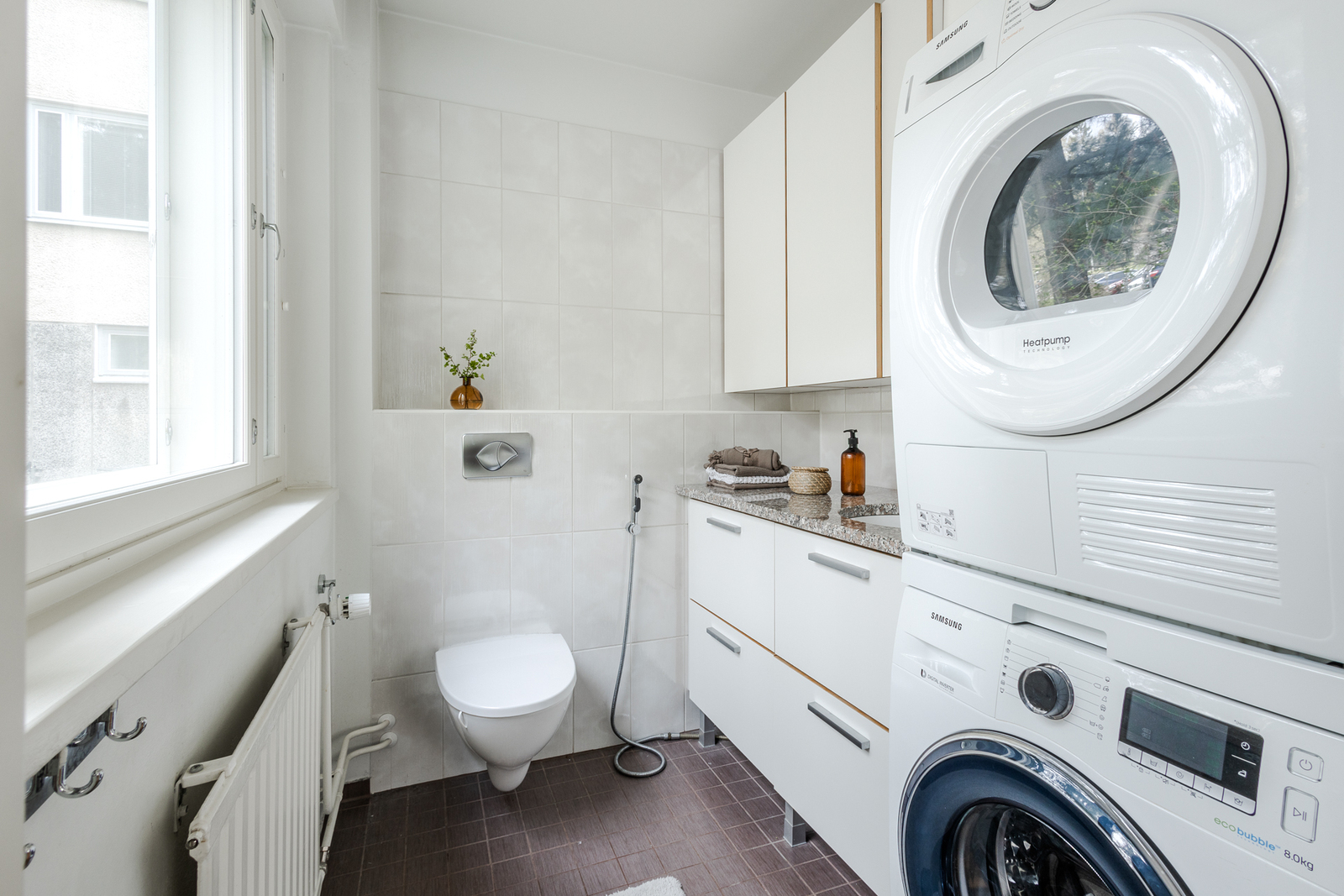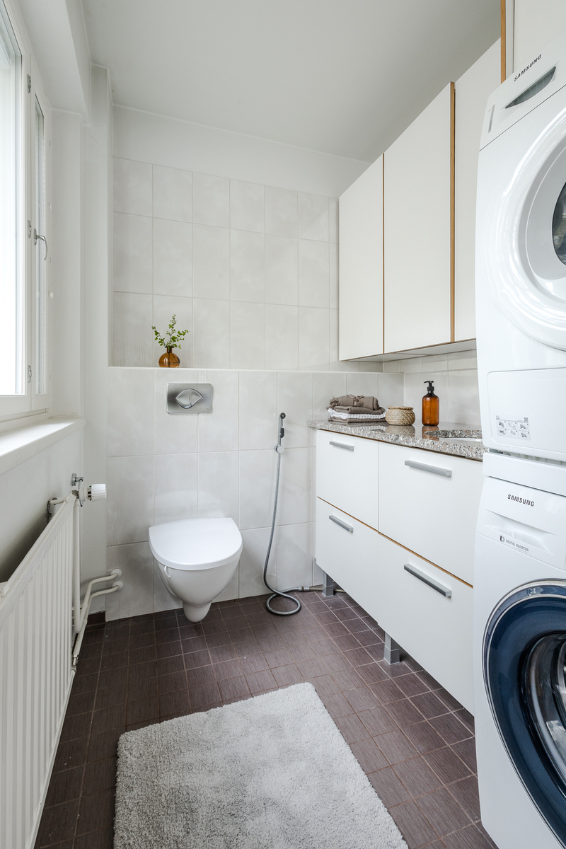 | Kodinhoitohuoneen kuvaus | Kuivausrumpu, pesukoneliitäntä, pöytätaso, lattialämmitys ja pesukone, lattiat (laatta), seinät (kaakeli), Kodinhoitohuone / wc , iso ikkuna, lattialämmitys ,pidee kaapisto, allas |