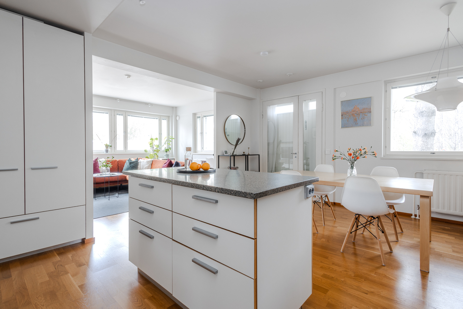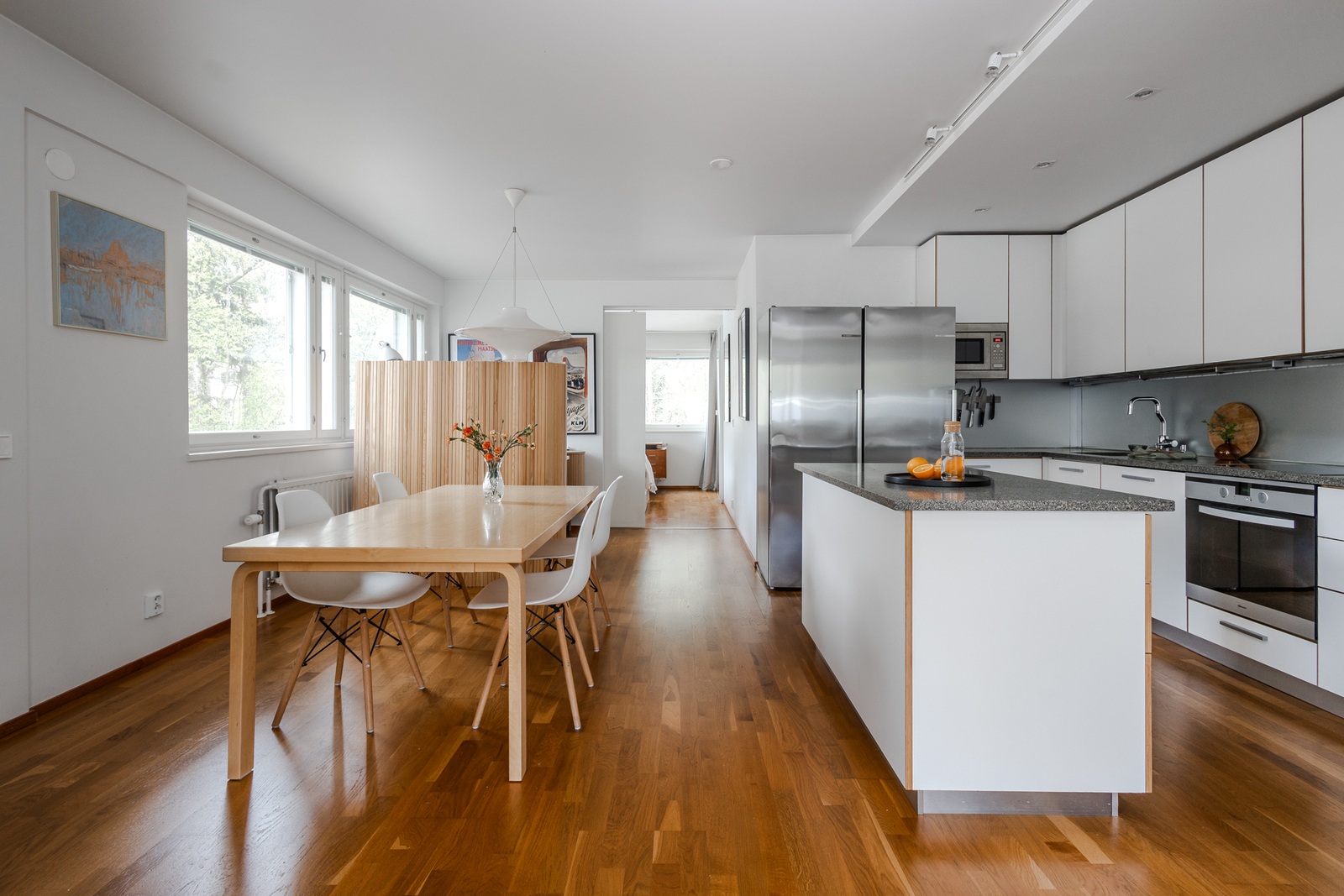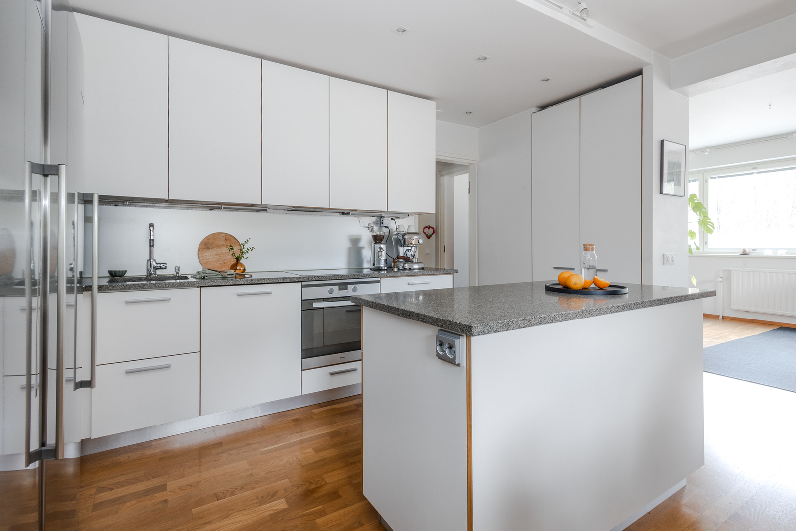 | Keittiön kuvaus | Liesi (integroitu, erillisuuni), seinät (maali), lattiat (parketti), astianpesukone, keittiösaareke, erillisuuni ja kiinteät valaisimet, liesituuletin / hormi |