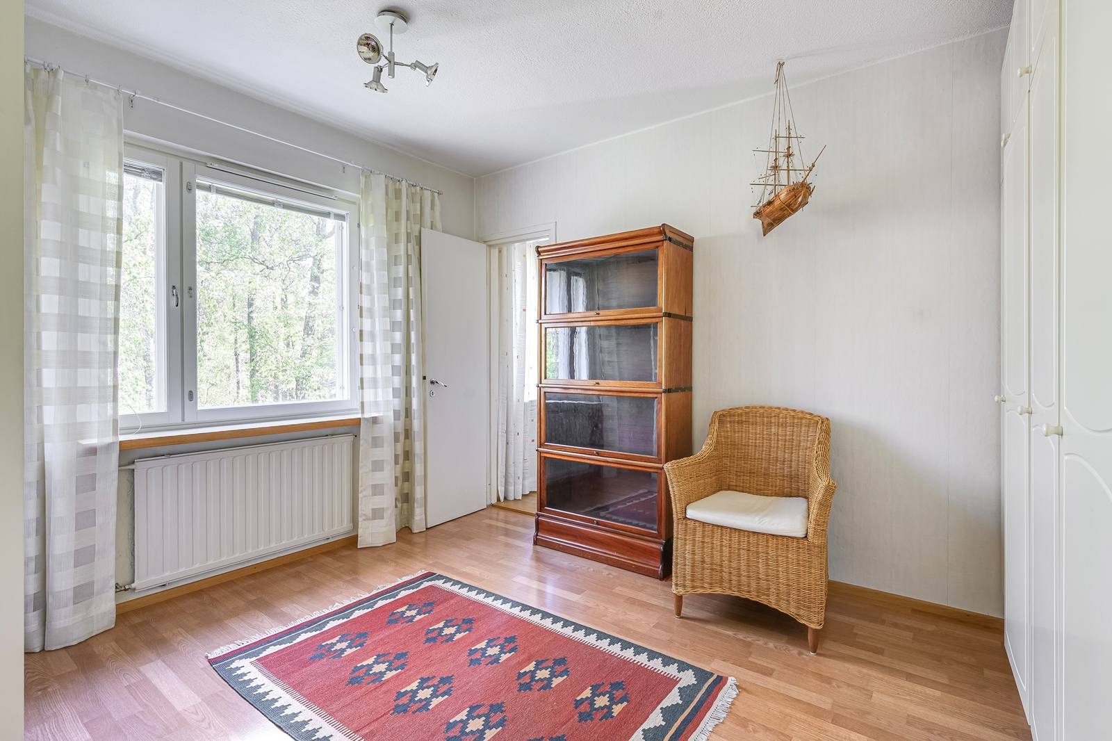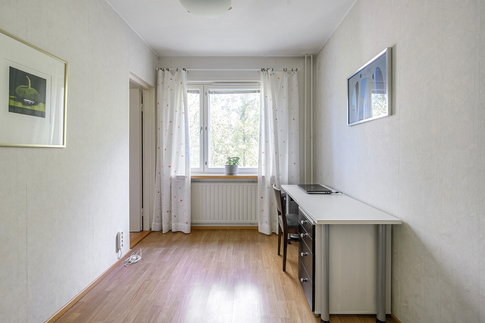 | Makuuhuoneen kuvaus | Lukumäärä: 3, seinät (tapetti), lattiat (parketti ja laminaatti), 2 makuuhuoneessa on laminaatti. |