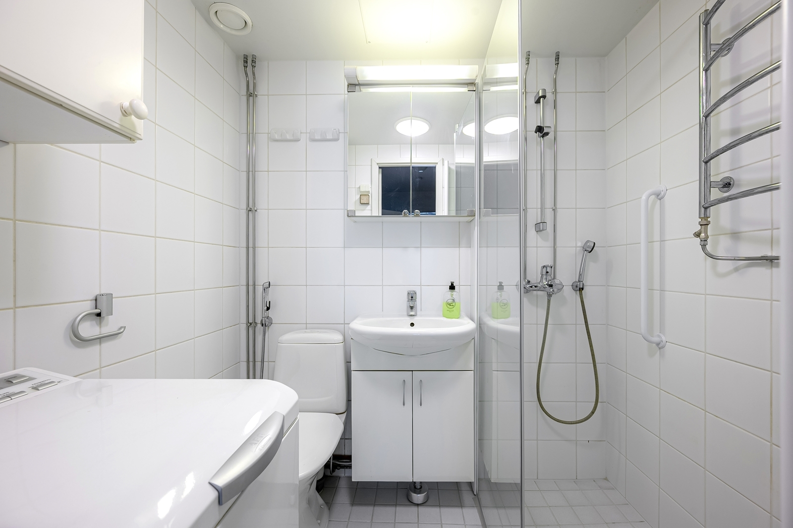 | Kylpyhuoneen kuvaus | Peilikaappi, pesukoneliitäntä, pesukone, suihkuseinä, wc-istuin ja kiinteät valaisimet, lattiat (laatta) |