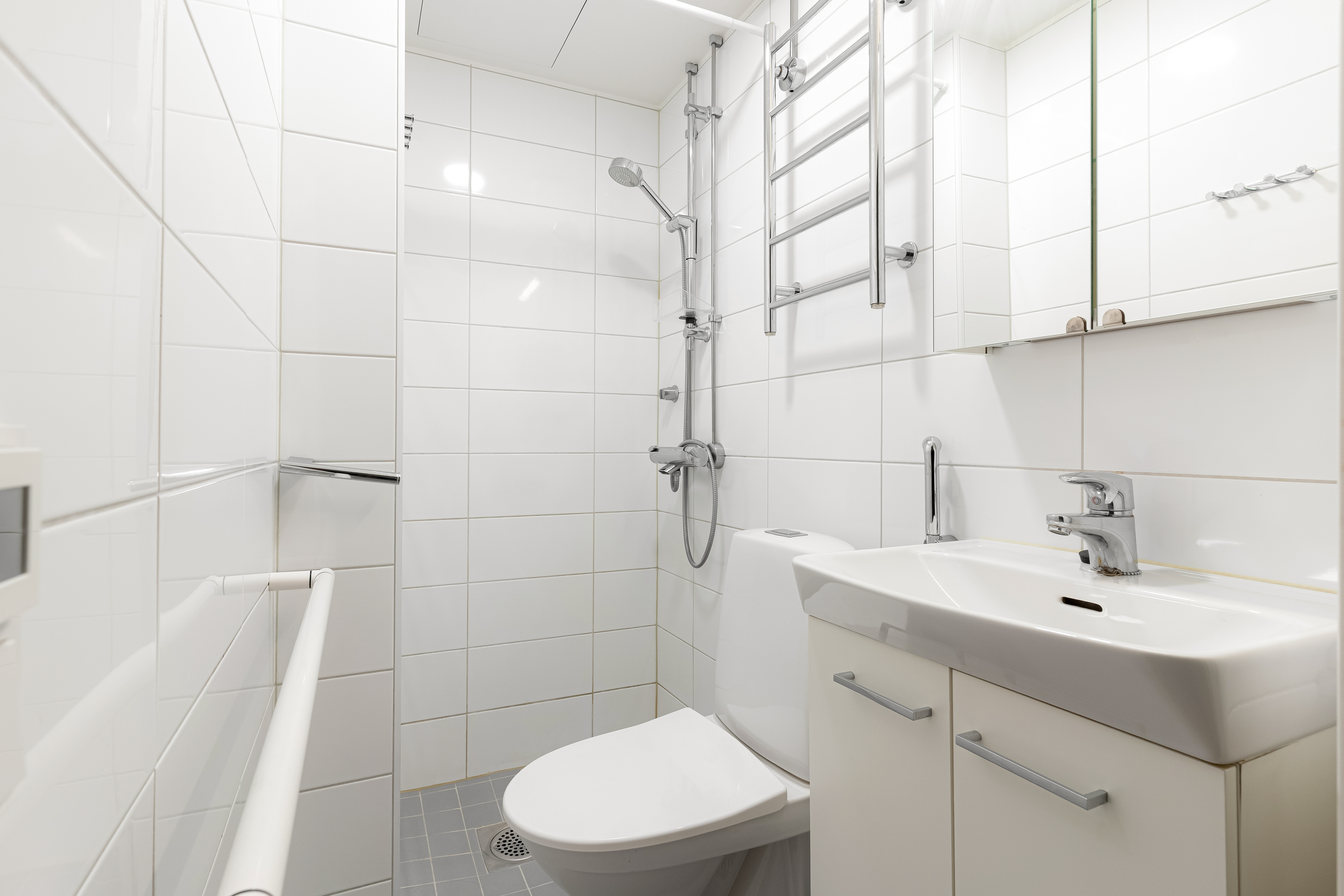 | Kylpyhuoneen kuvaus | WC-istuin, suihku, peilikaappi, allaskaappi ja bidee-suihku, seinät (kaakeli), lattiat (laatta) |
