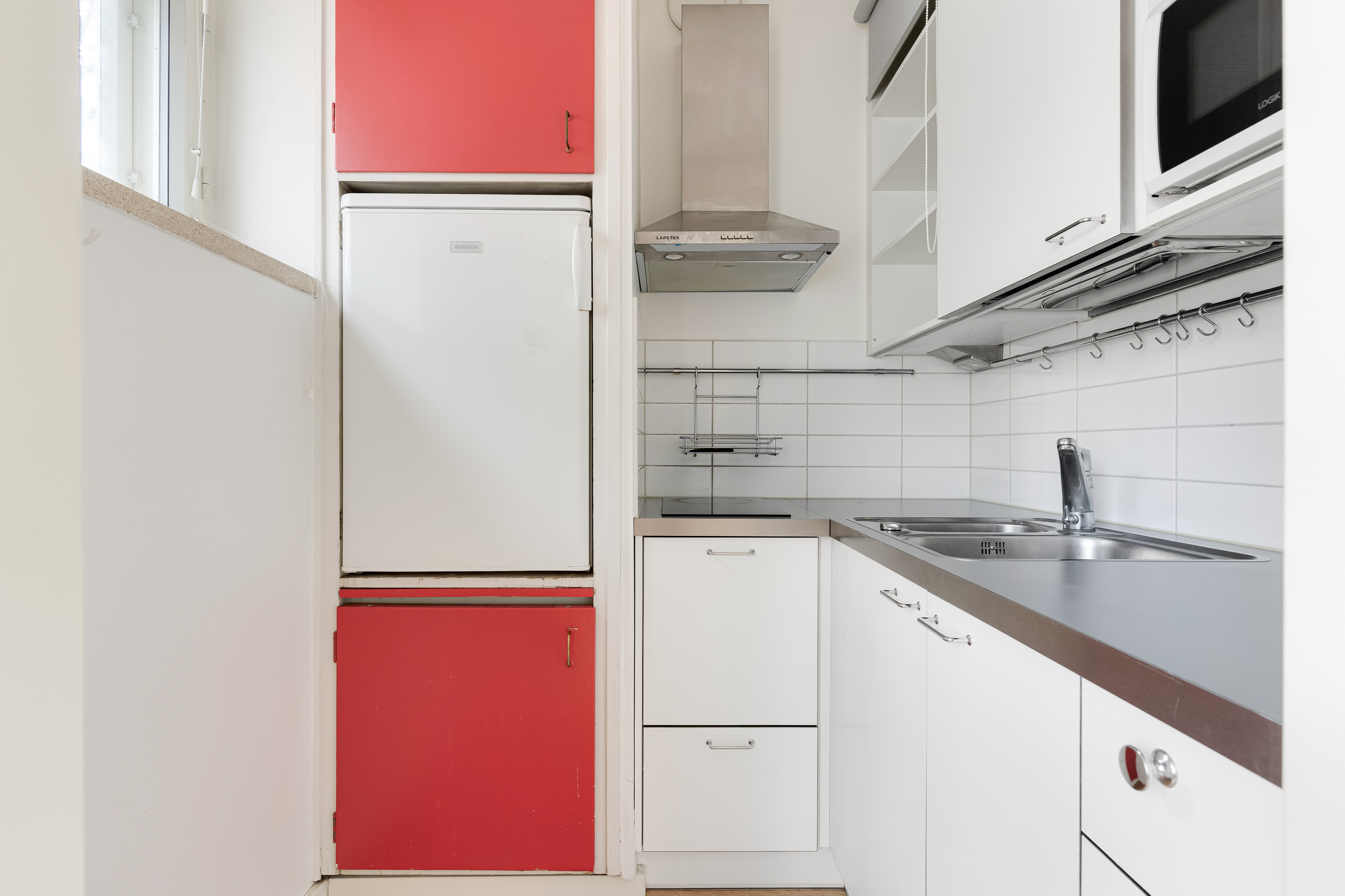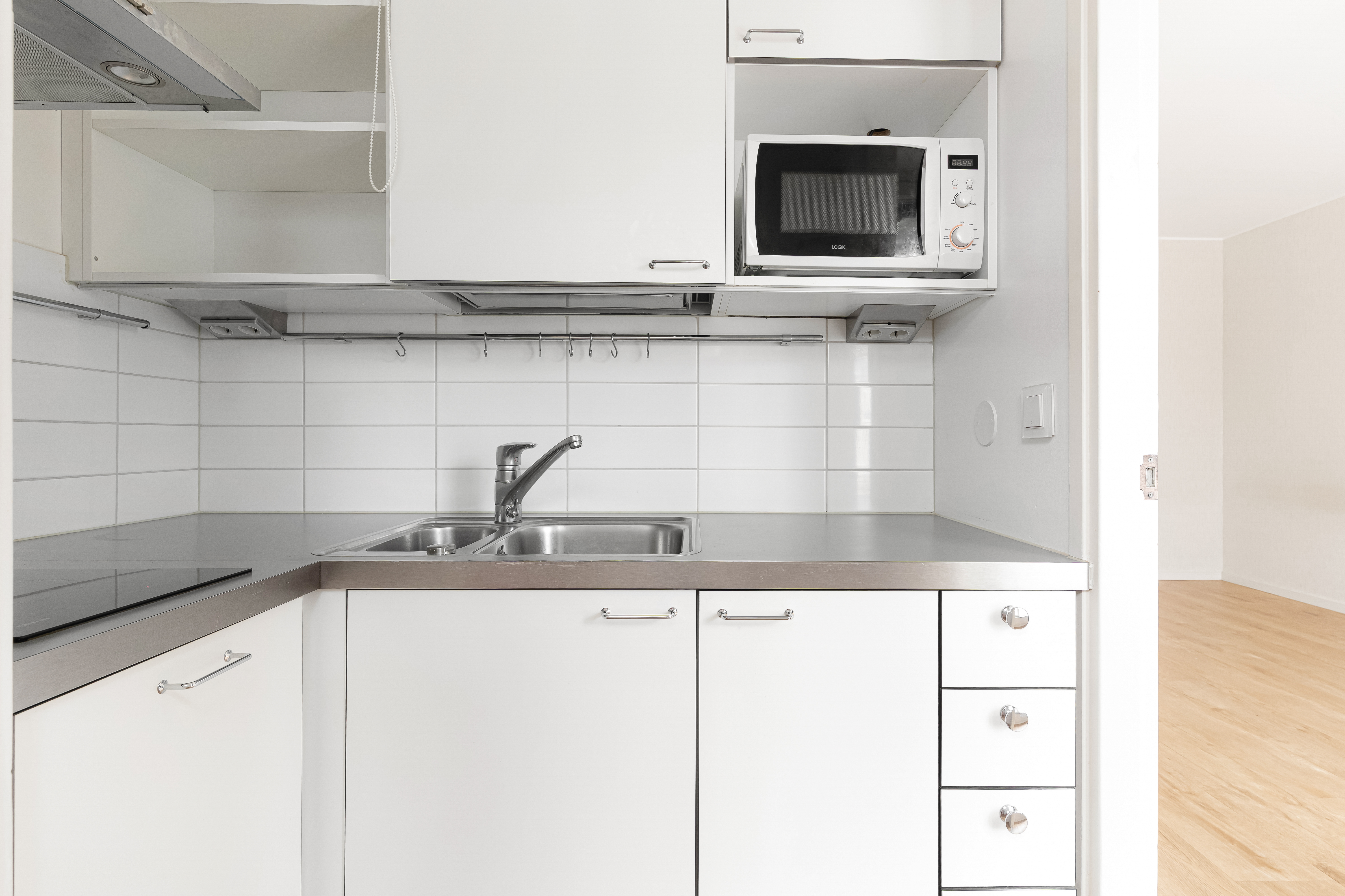 | Keittiön kuvaus | Liesi (Induktioliesi), työtasot (laminaatti), seinät (maali), lattiat (vinyyli), liesi (Liesitaso, ei uunia), jääkaappi, liesituuletin ja mikroaaltouuni |