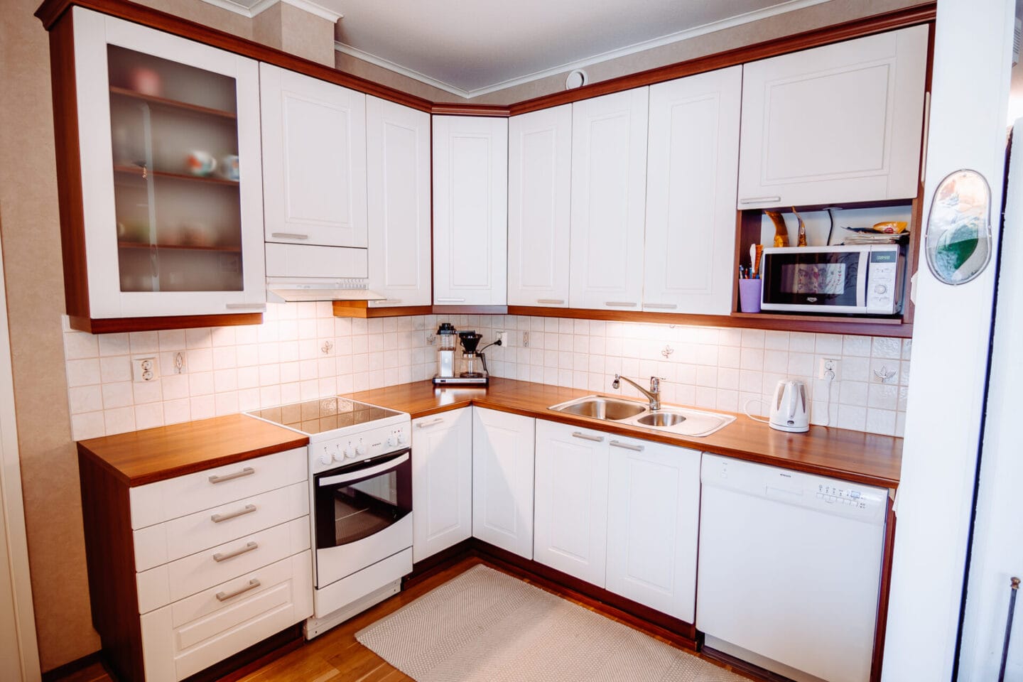 Liesi (Keraaminen liesi), työtasot (laminaatti), seinät (kaakeli ja maali), lattiat (parketti), liesituuletin (Hormiin), erillinen pakastin, jääkaappi, liesi, uuni ja kiinteät valaisimet |