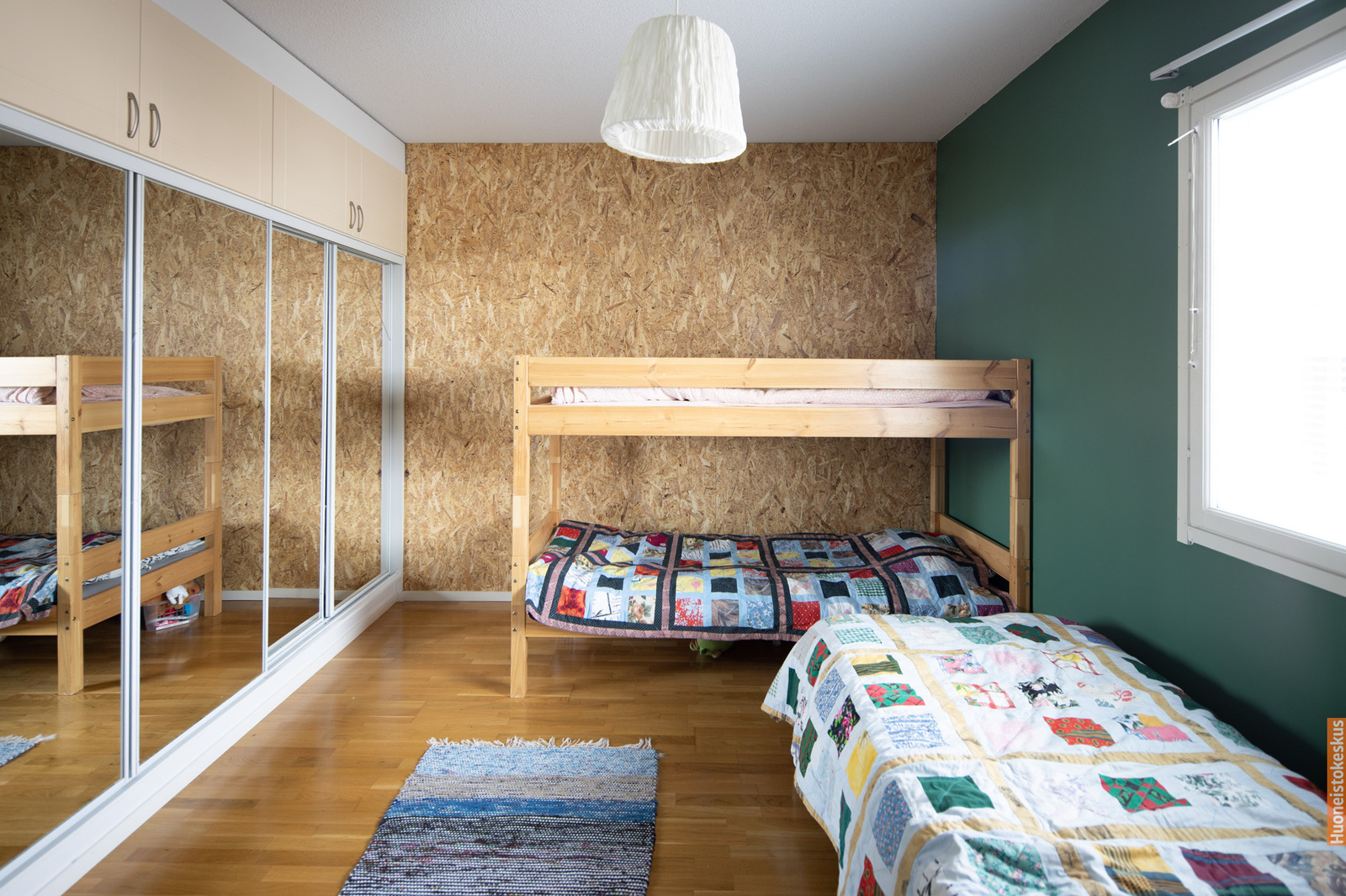 Seinät (tapetti ja maali), lattiat (parketti), Maalatut tapettiseinät ja osb tehosteseinä. |