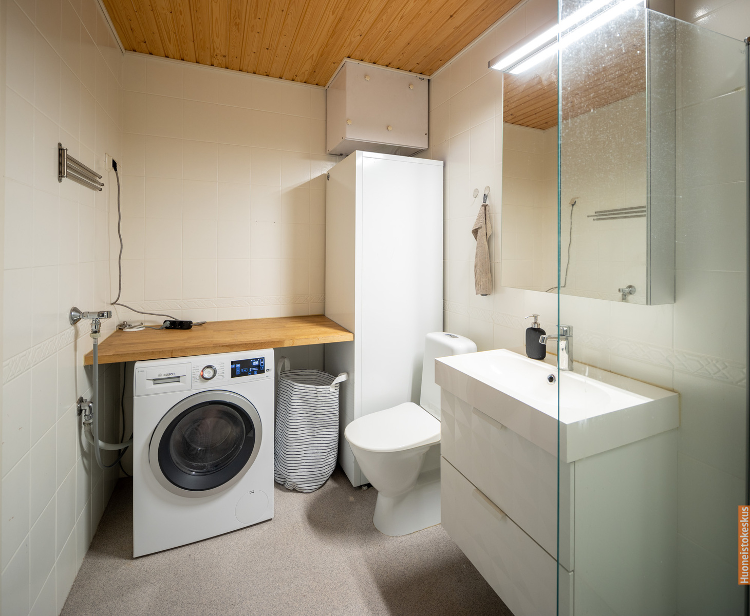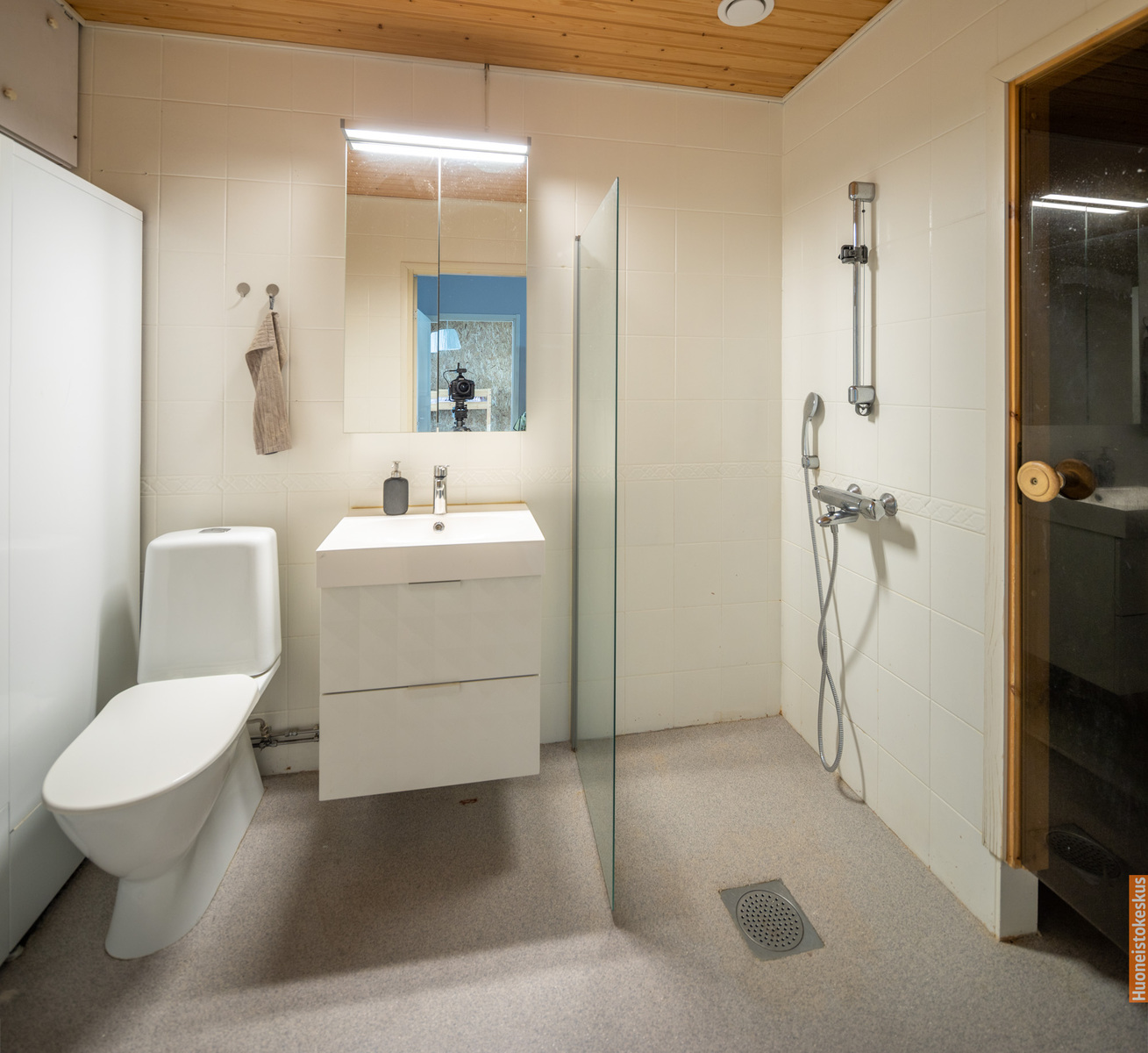Pesukoneliitäntä, lattialämmitys, suihkuseinä, peilikaappi, suihku, wc-istuin ja kiinteät valaisimet, seinät (kaakeli), Lattialaattojen päälle tehty akryylipinnoite 2021 (MK Floors). Seinäkaakelit maalattu. |