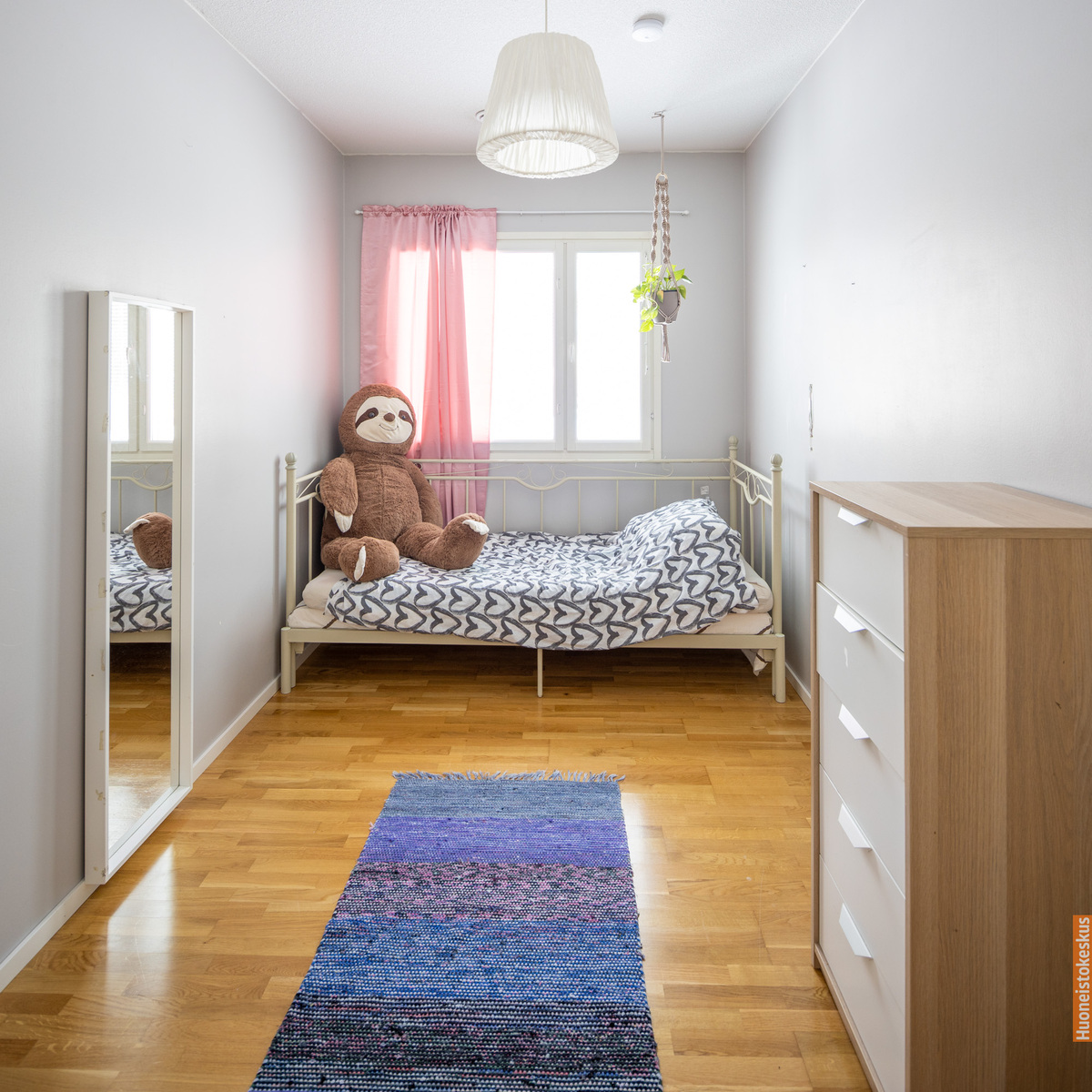 Tilava asunto mukavalla pohjaratkaisulla. Tuulikaapissa ja eteisessä hyvin kaappitilaa ulkovaatteille. Lisäksi päämakuuhuoneessa pitkät peilikaapistot.