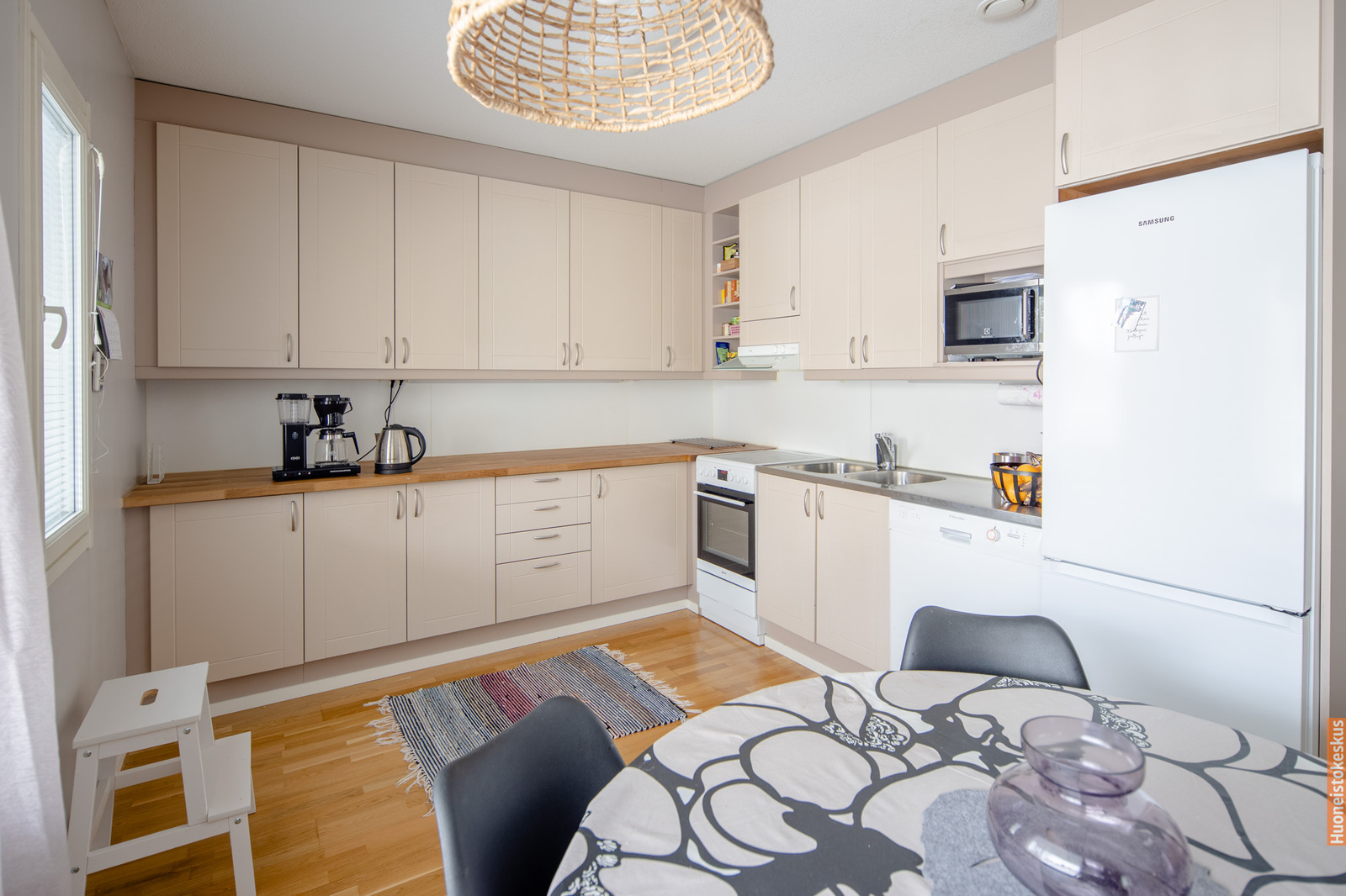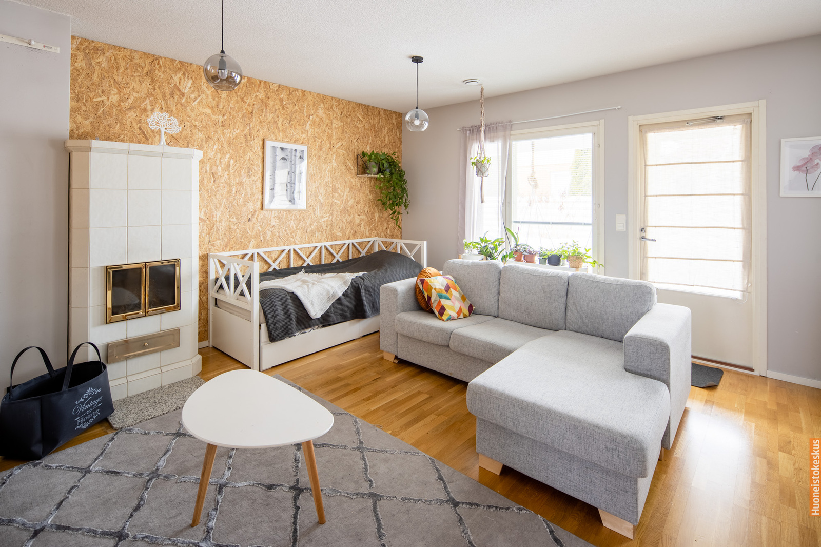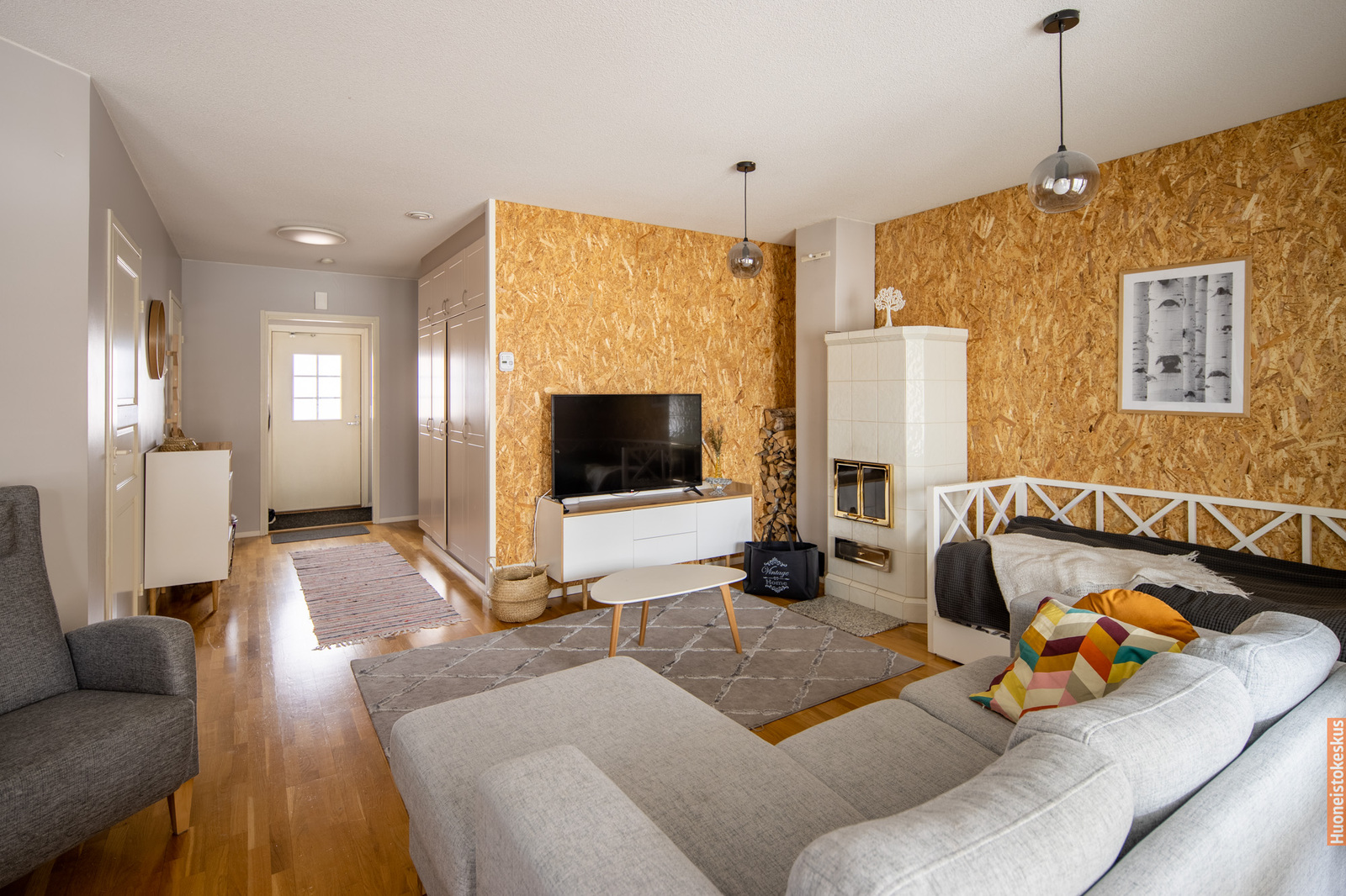 Avara olohuone, jossa tyylikäs kaakelitakka lisälämmön lähteenä. Keittiössä runsaasti säilytys- ja laskutilaa. Kodinkoneita ja kalusteita päivitetty muutama vuosi sitten.