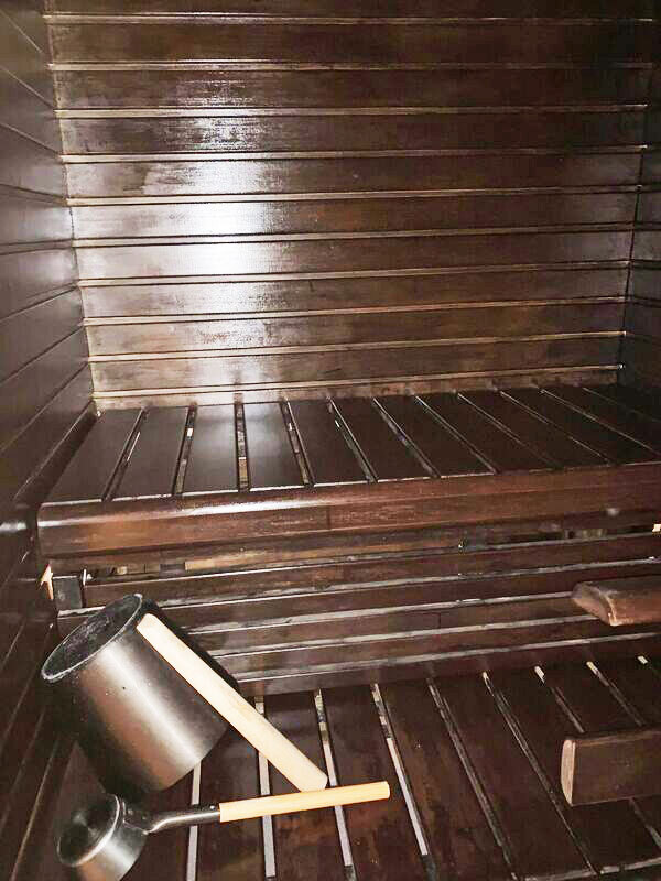 Seinät (puu), Sähkökiuas, Lattialaattojen päälle tehty akryylipinnoite 2021 (MK Floors). |