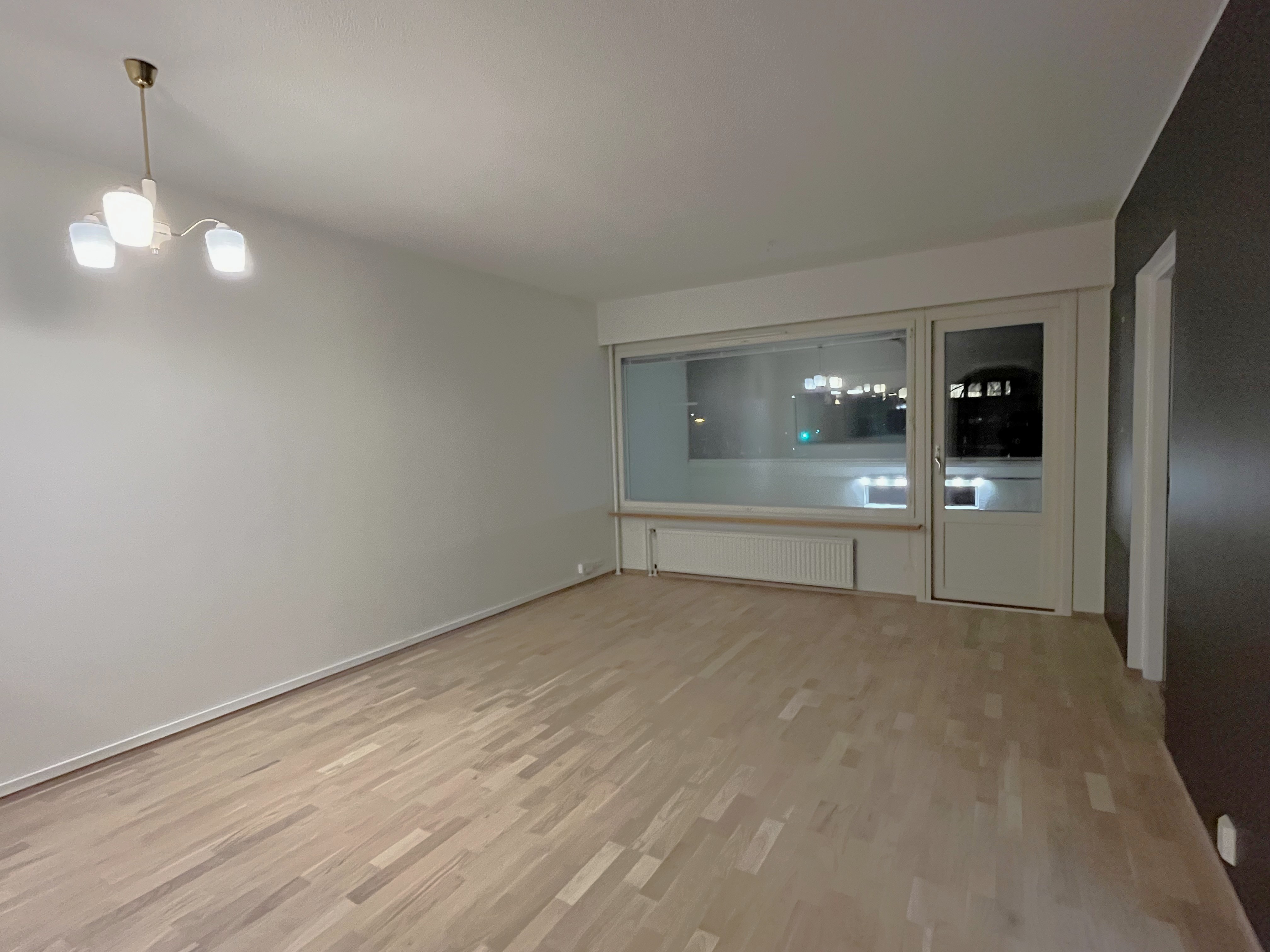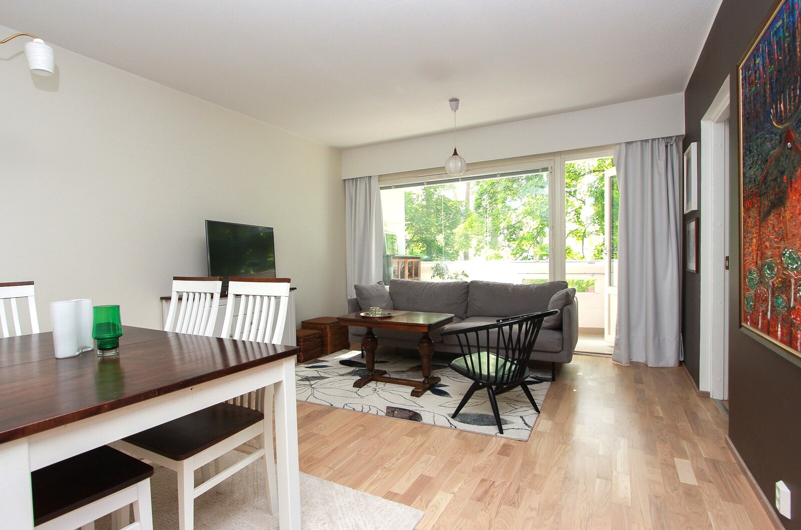 Seinät (maali ja lasikuitutapetti), lattiat (parketti), Tilava olohuone, jossa paikka isollekin ruokapöydällä. Lasitettu parveke viihtyisänä olohuoneen jatkeena. Näkymät taloyhtiön piha-alueelle ja viereiselle puistoalueelle. |
