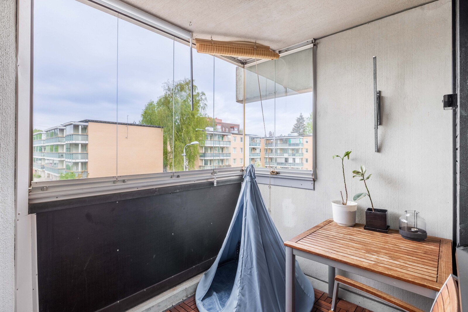 Makuuhuoneet ovat tilavia ja olohuoneen jatkeena on mukavasti työkeittiö ja ruokailutila. Olohuoneesta kulku isolle lasitetulle parvekkeelle.