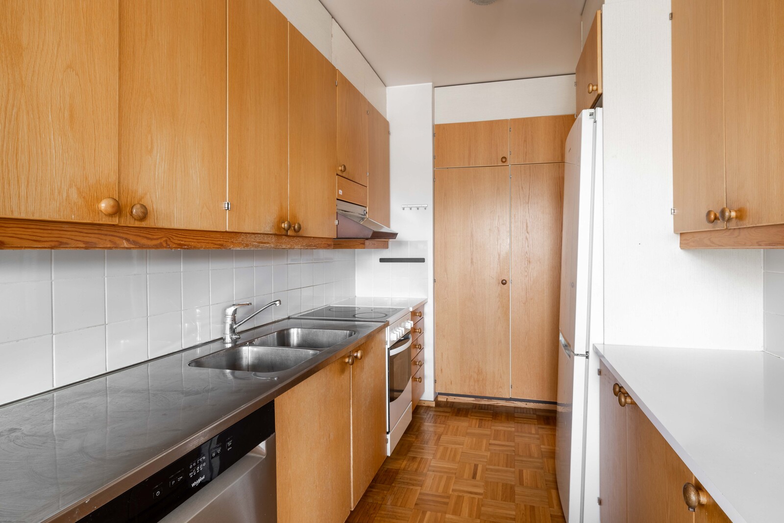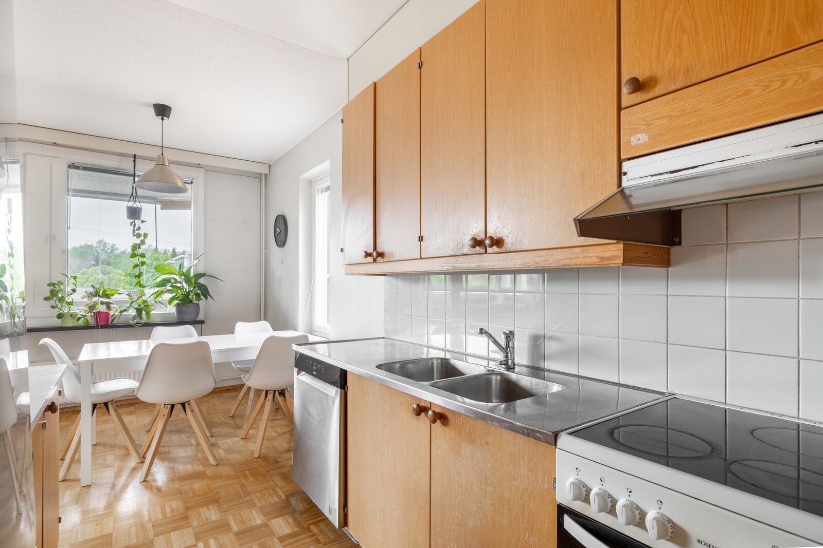 | Keittiön kuvaus | Liesi (Keraaminen liesi), työtasot (laminaatti), seinät (maali), lattiat (parketti), astianpesukone, liesituuletin ja jääkaappipakastin |