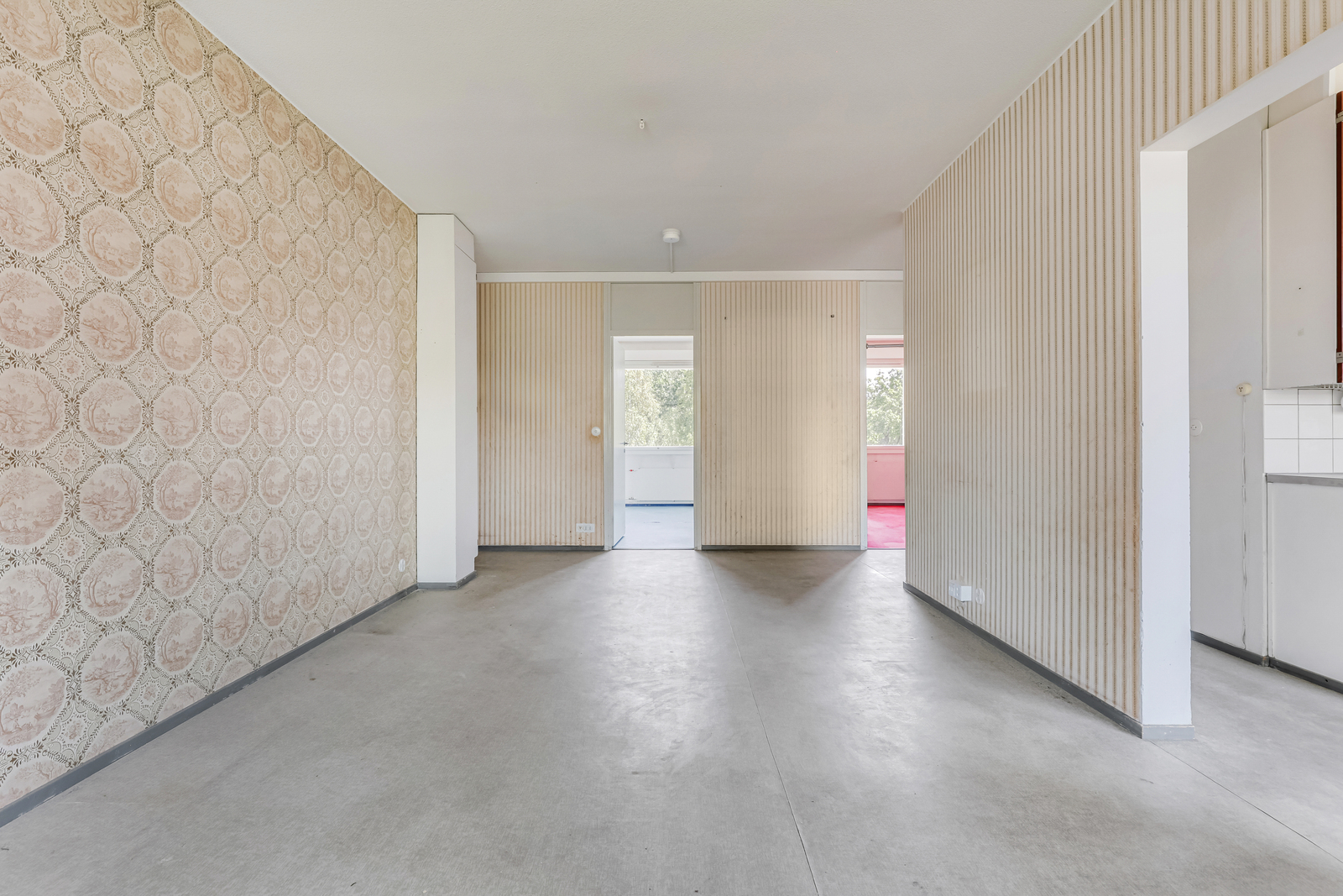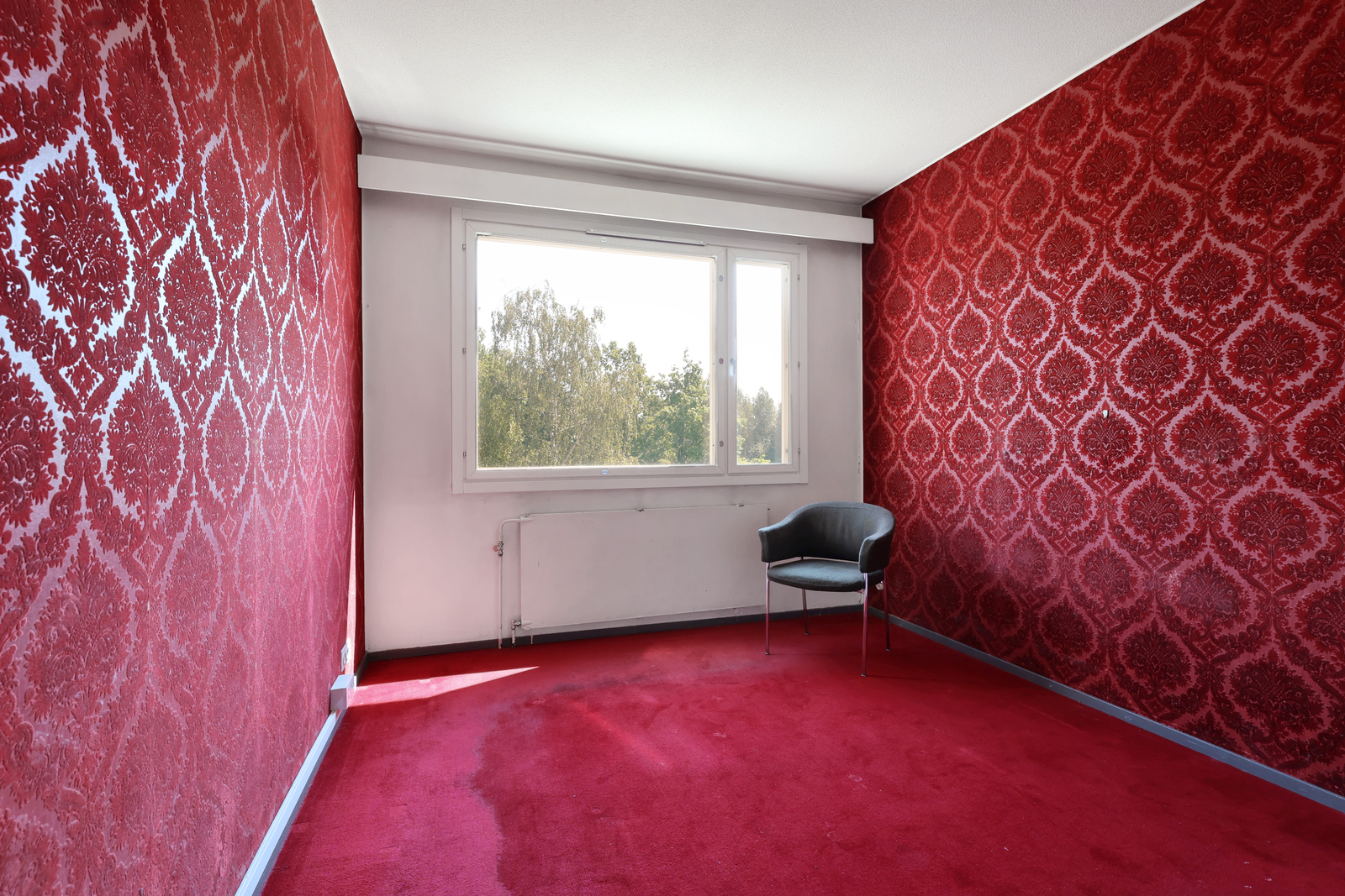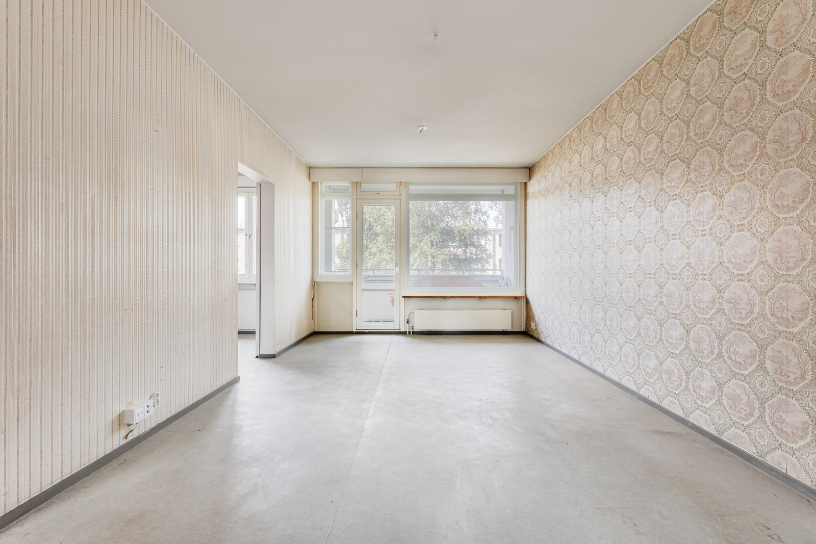 | Olohuoneen kuvaus | Seinät (tapetti), lattiat (muovimatto) |