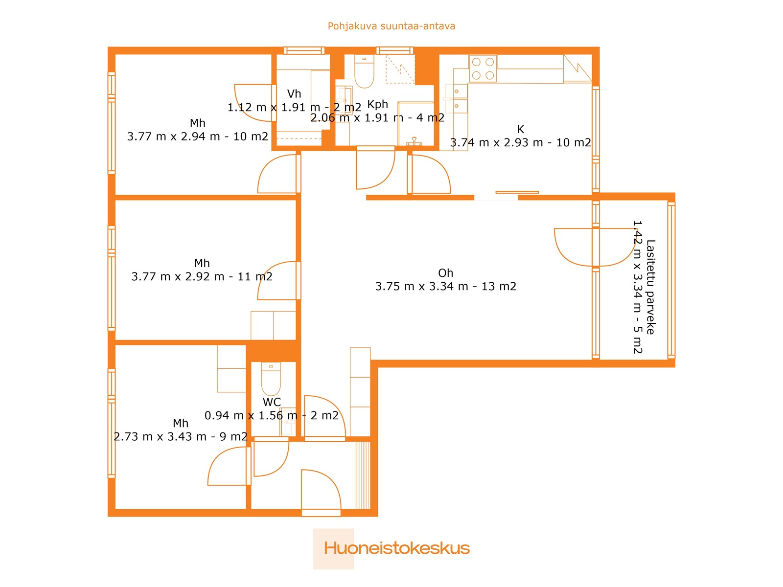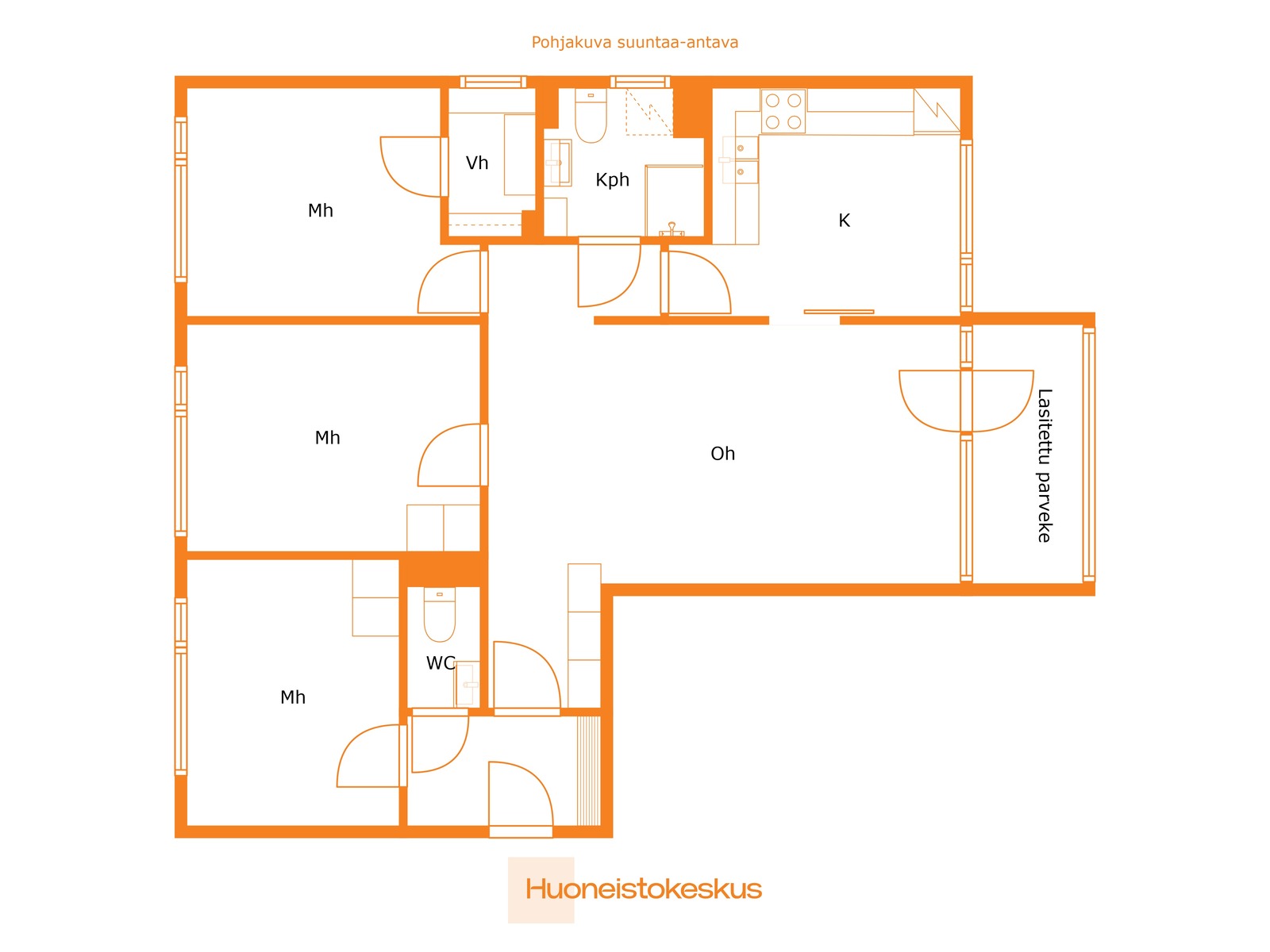 | Huoneistoselitelmä | 4 h, k, kh, 2 x wc, vh, lasitettu parveke (Yj 4 h+k) |