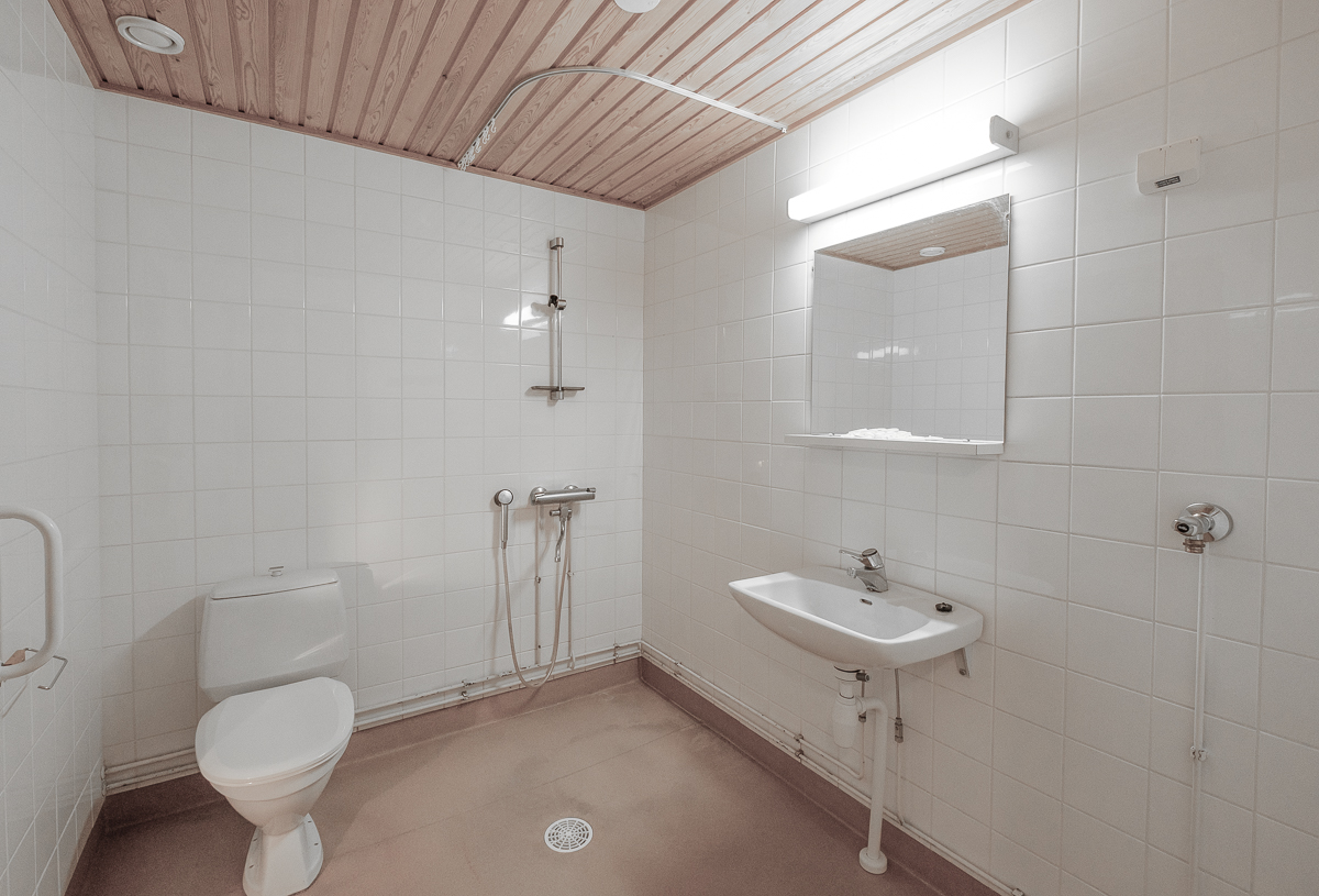 | Kylpyhuoneen kuvaus | WC-istuin, suihku, pesukoneliitäntä ja kylpyhuonekaapisto, seinät (kaakeli), lattiat (muovimatto) |