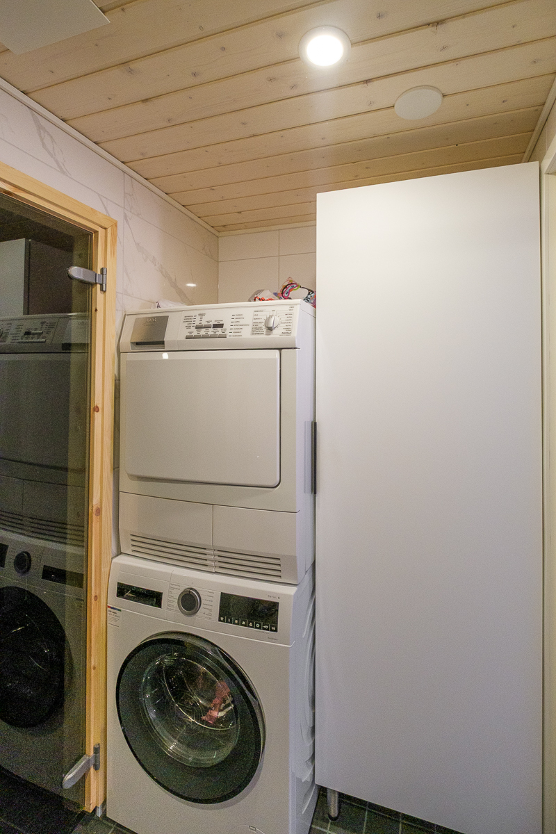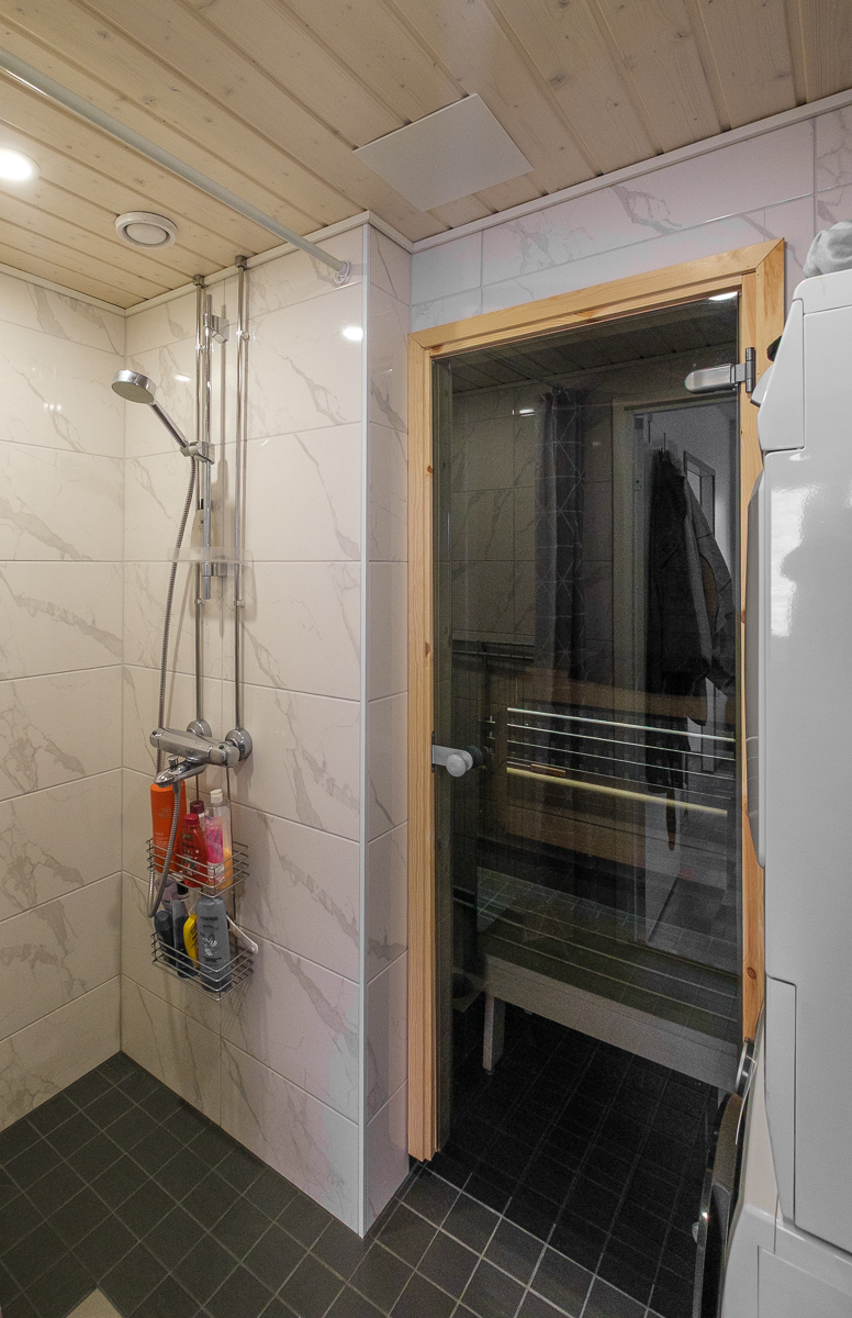 Suihku ja pesukoneliitäntä, seinät (kaakeli), lattiat (laatta) |