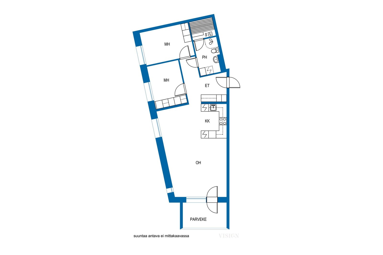 | Huoneistoselitelmä | 3 h, avokeittiö, s, pesutilat, vh, iso lasitettu parveke. |