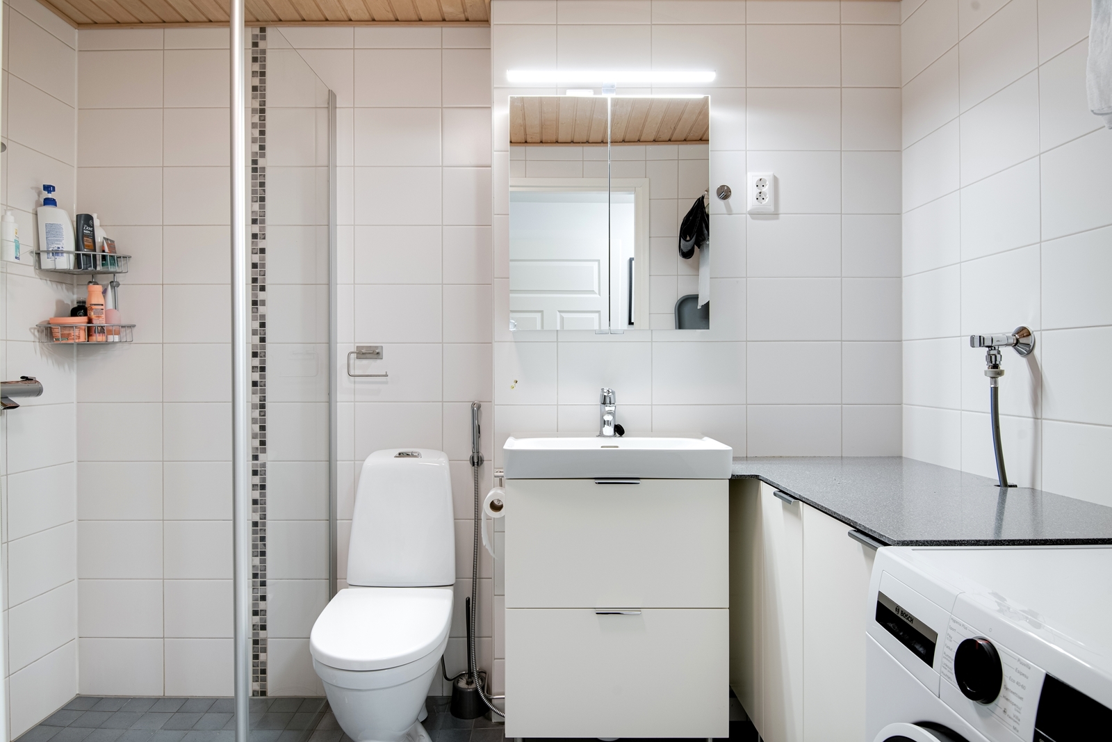 | Kylpyhuoneen kuvaus | WC-istuin, lattialämmitys, pesukoneliitäntä ja kiinteät valaisimet, lattiat (laatta) |