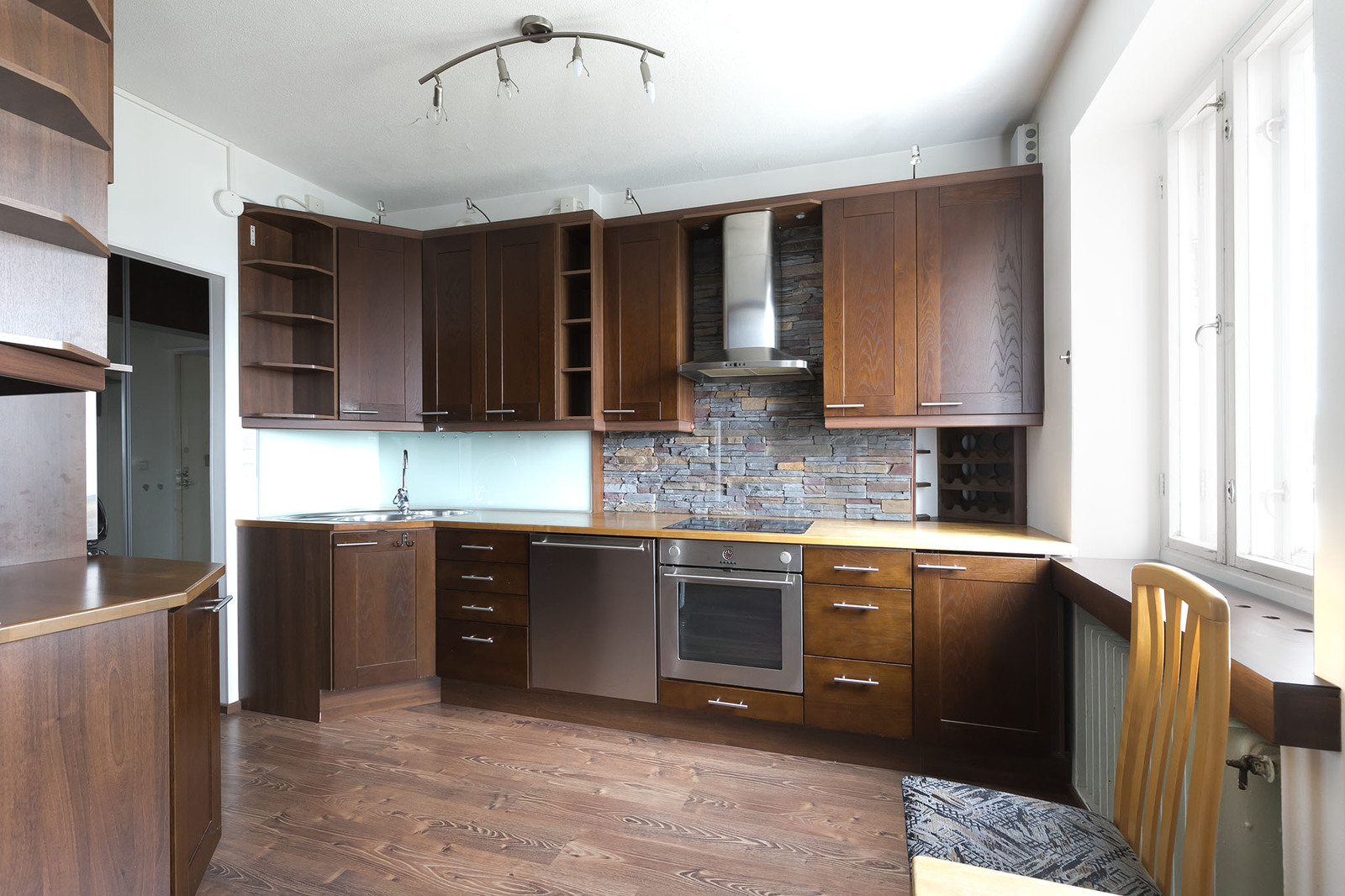 | Keittiön kuvaus | Liesi (erillisuuni, liesitaso), seinät (maali), lattiat (laminaatti), astianpesukone, erillisuuni, jääkaappipakastin, liesituuletin ja kiinteät valaisimet, liesitaso |