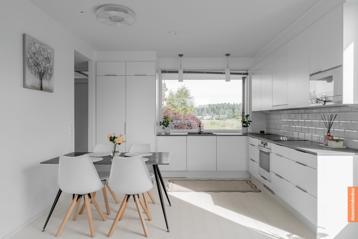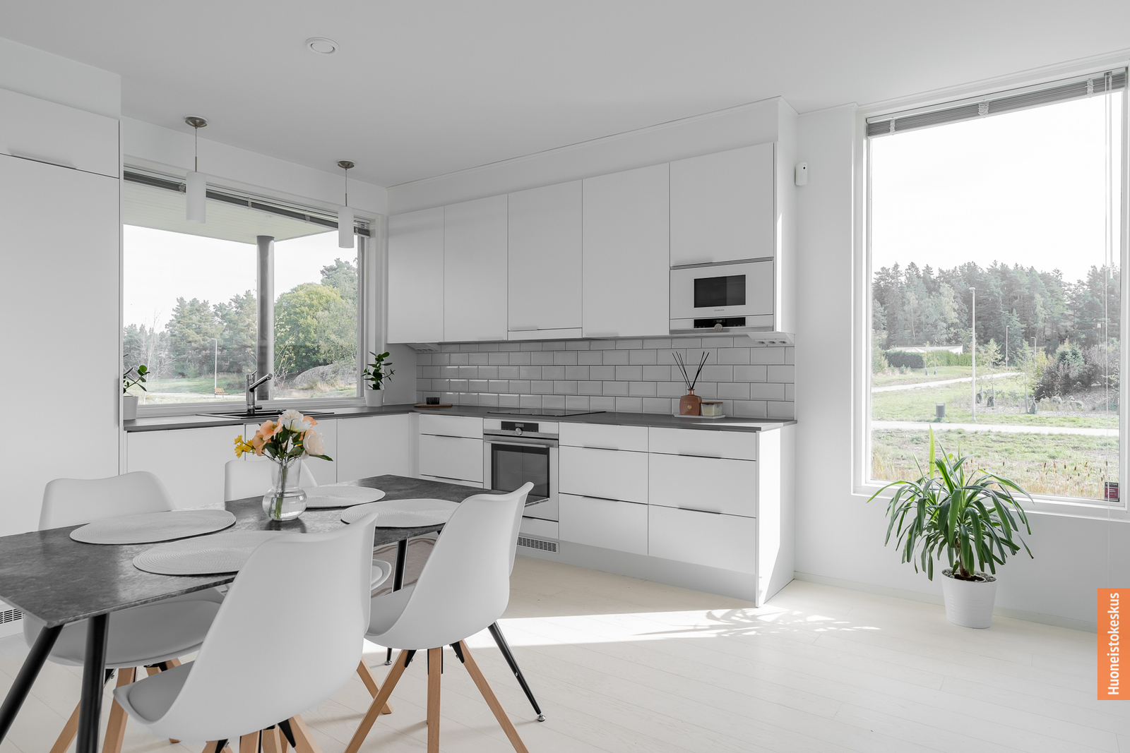 | Keittiön kuvaus | Liesi (Induktioliesi ja erillisuuni), työtasot (laminaatti), seinät (maali ja osalaatoitus), lattiat (parketti), astianpesukone, erillisuuni, erillinen pakastin, liesi, jääkaappi, mikroaaltouuni ja liesituuletin / hormi |