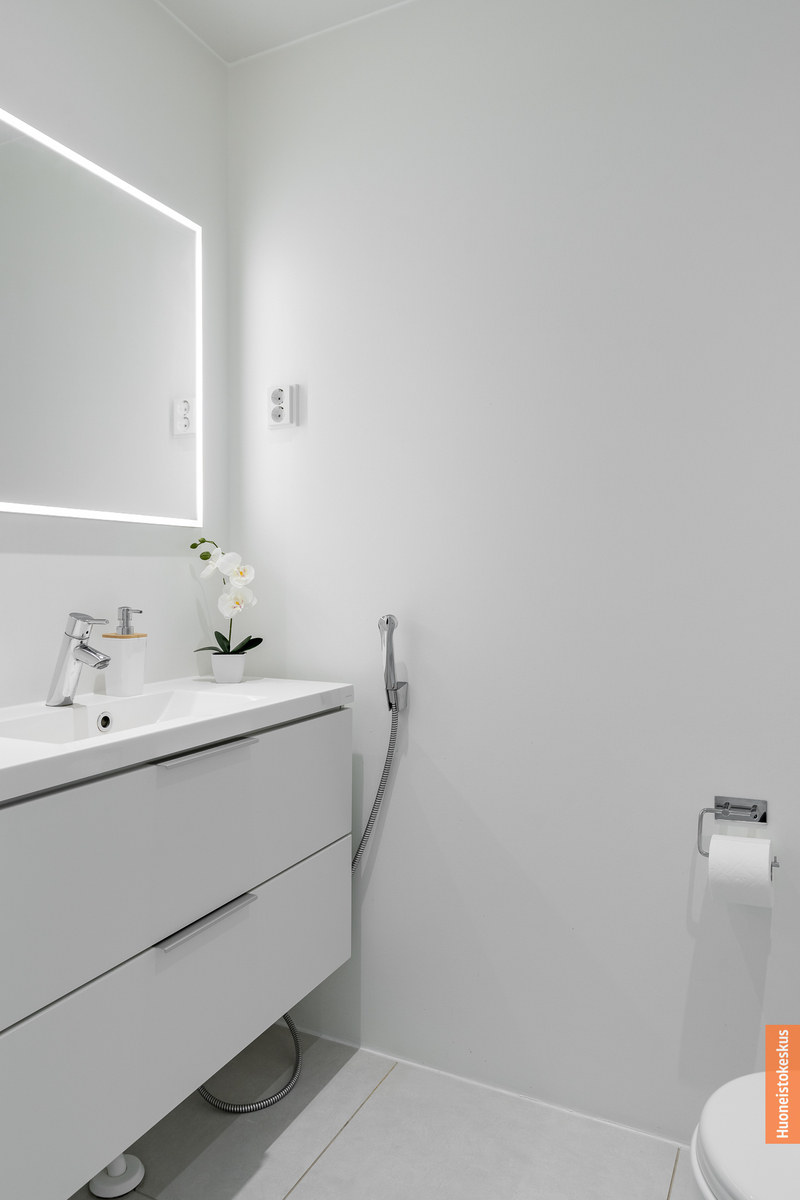| Kylpyhuoneen kuvaus | Allaskaappi, lattialämmitys, peilikaappi, suihku, suihkuseinä ja wc-istuin, seinät (kaakeli), lattiat (laatta) |
