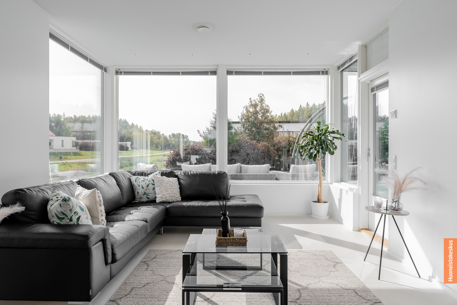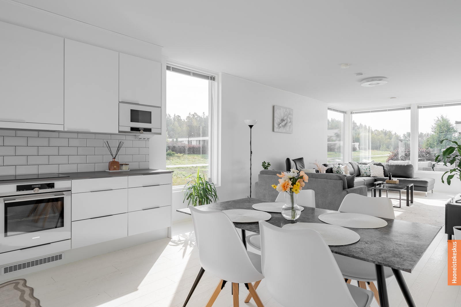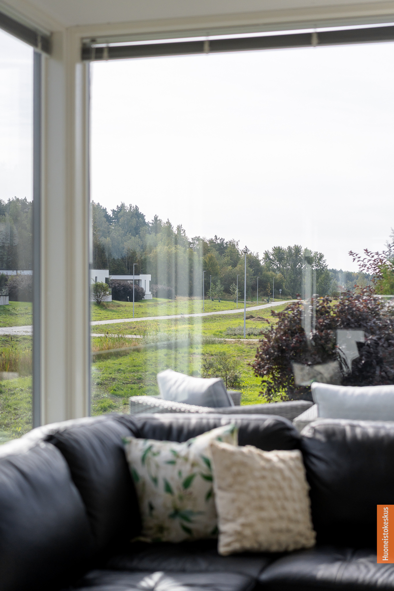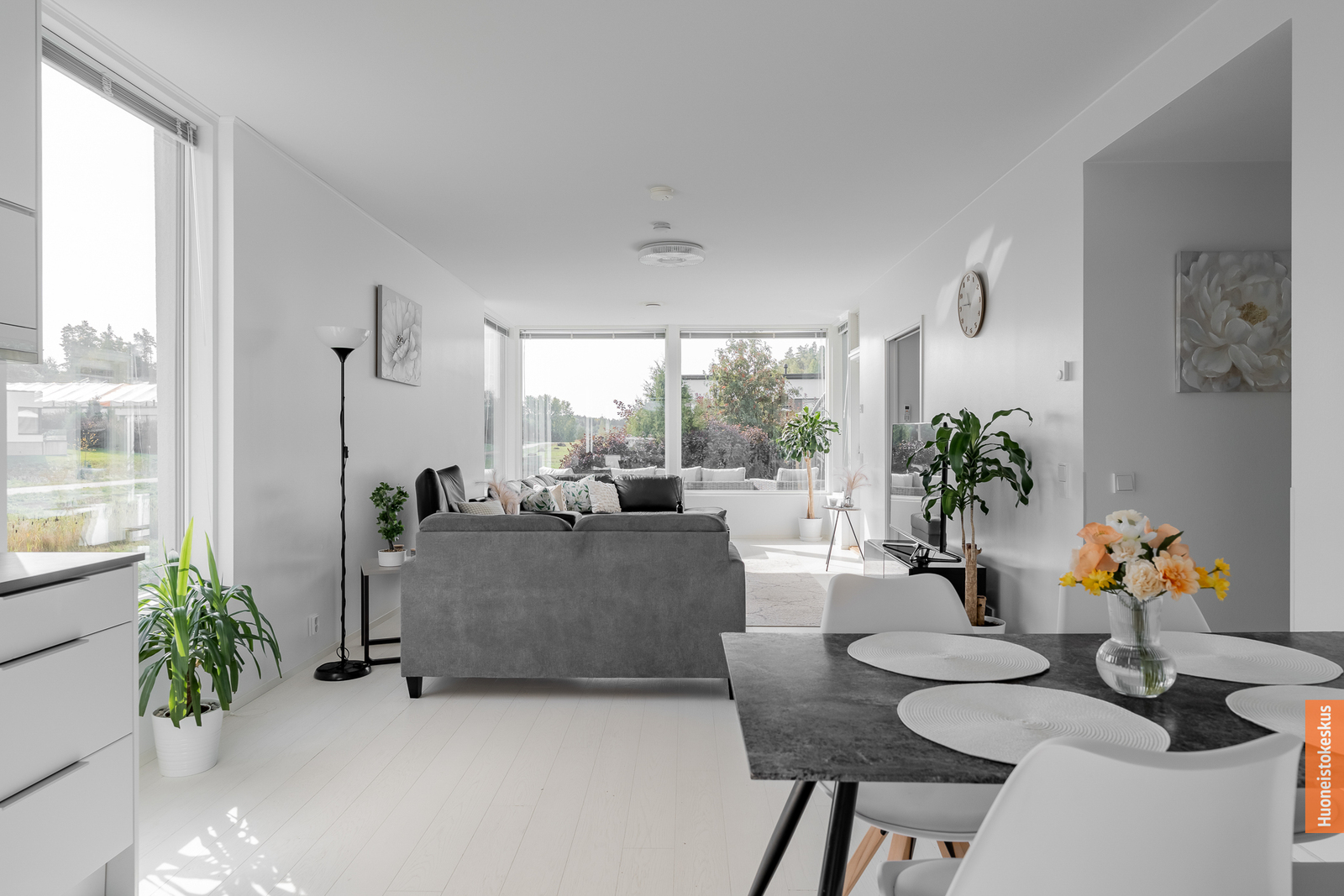 Päätyasunnon yksityisyys, luonnonvalo ja avarat tilaratkaisut kutsuvat tutustumaan tähän kauniiseen kotiin. Heti sisään astuessa huomaa, kuinka ilmavuus ja harmoninen värimaailma luovat rauhallisen tunnelman. Suuret ikkunapinnat avaavat näkymät vehreään ympäristöön ja tuovat sisään valoa vuodenajasta toiseen.