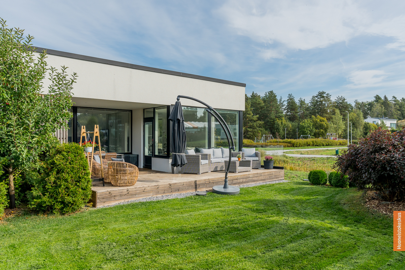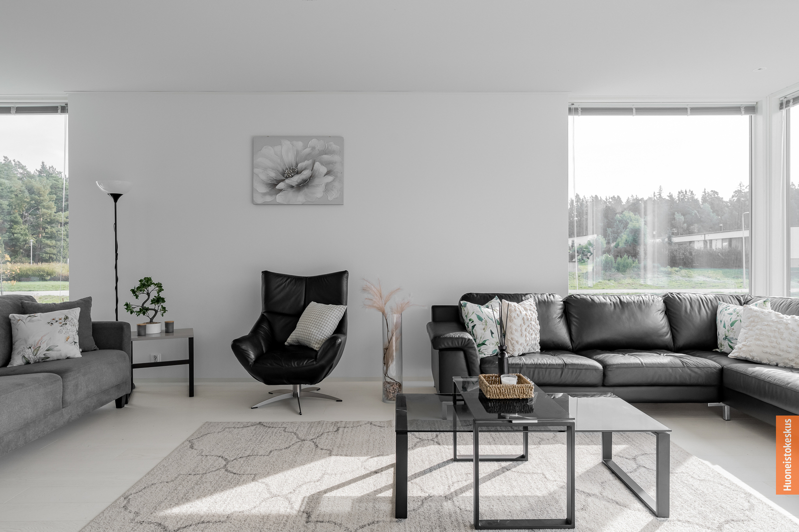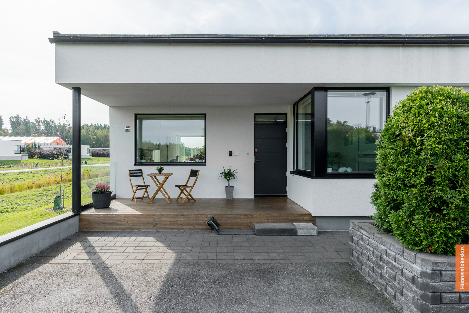 Päätyasunnon yksityisyys, luonnonvalo ja avarat tilaratkaisut kutsuvat tutustumaan tähän kauniiseen kotiin. Heti sisään astuessa huomaa, kuinka ilmavuus ja harmoninen värimaailma luovat rauhallisen tunnelman. Suuret ikkunapinnat avaavat näkymät vehreään ympäristöön ja tuovat sisään valoa vuodenajasta toiseen.