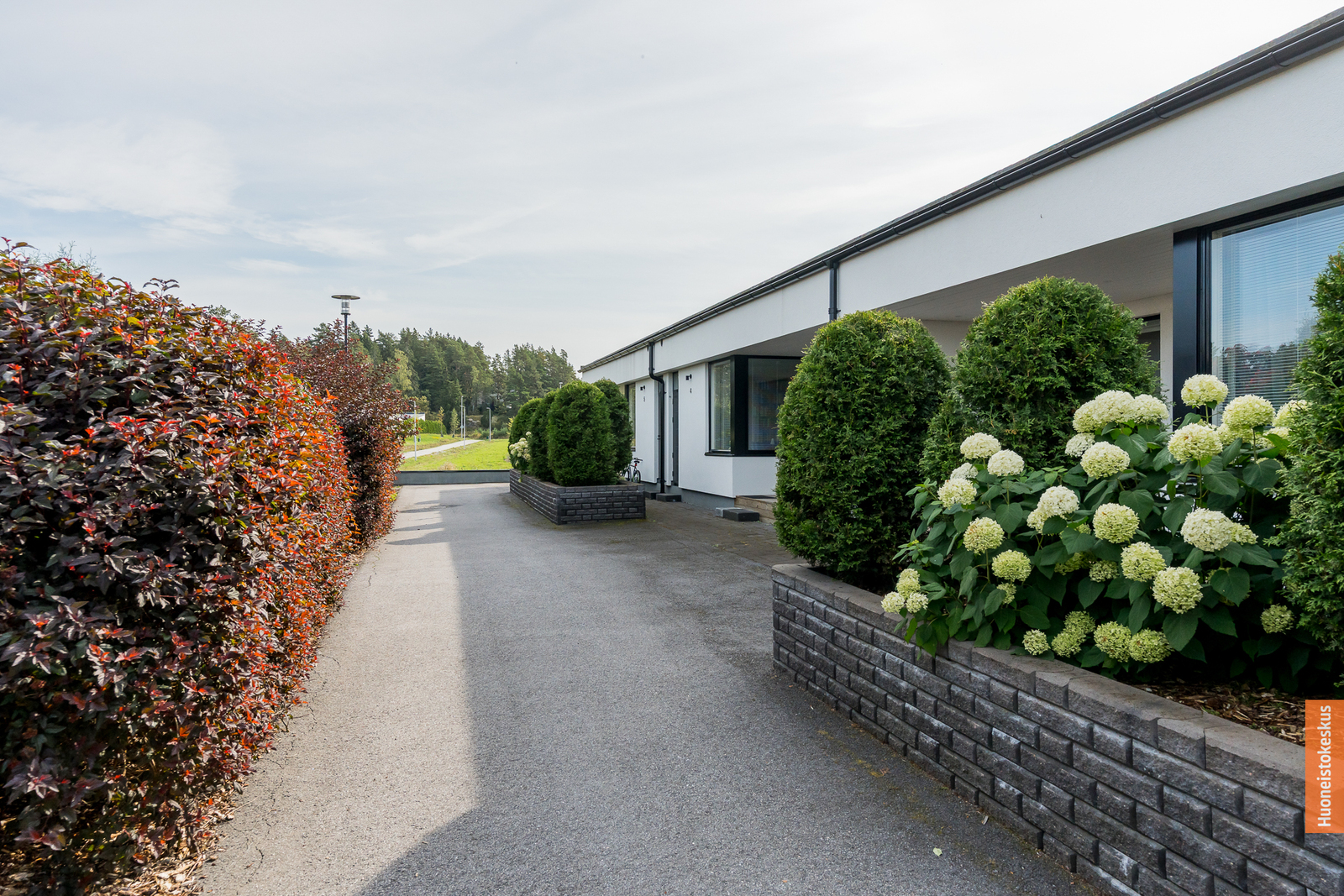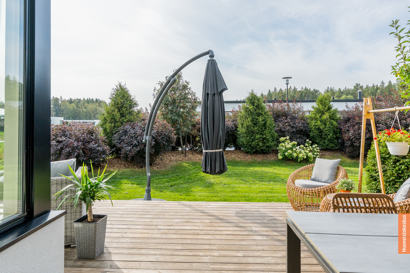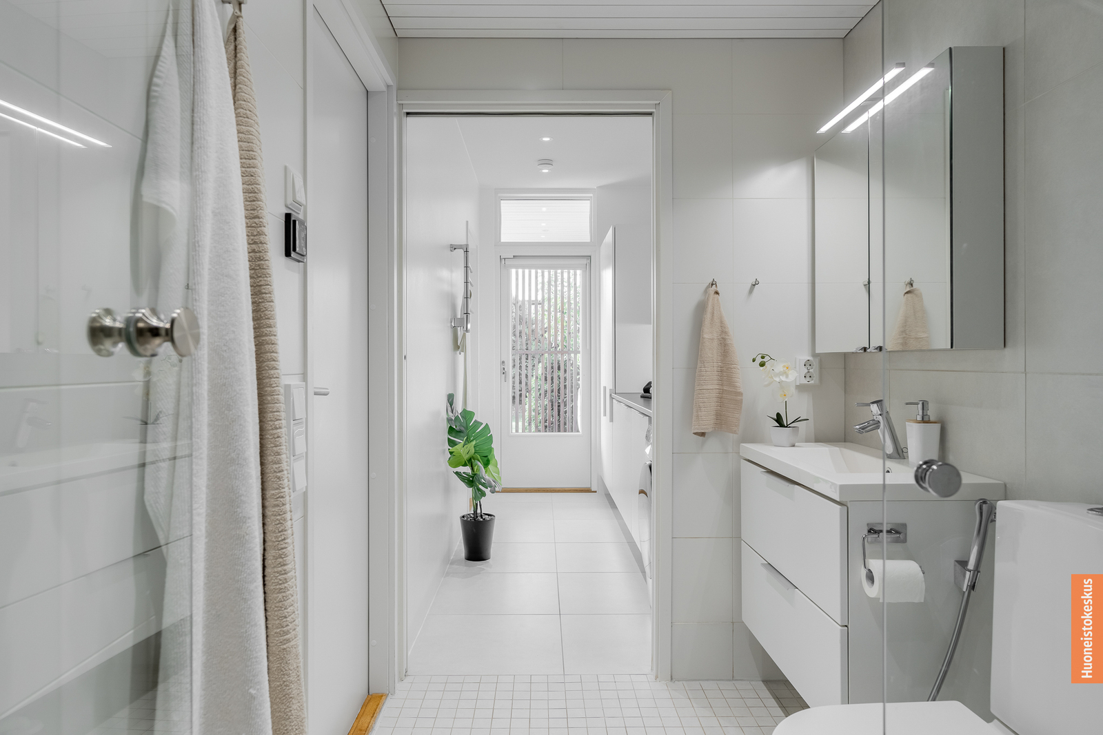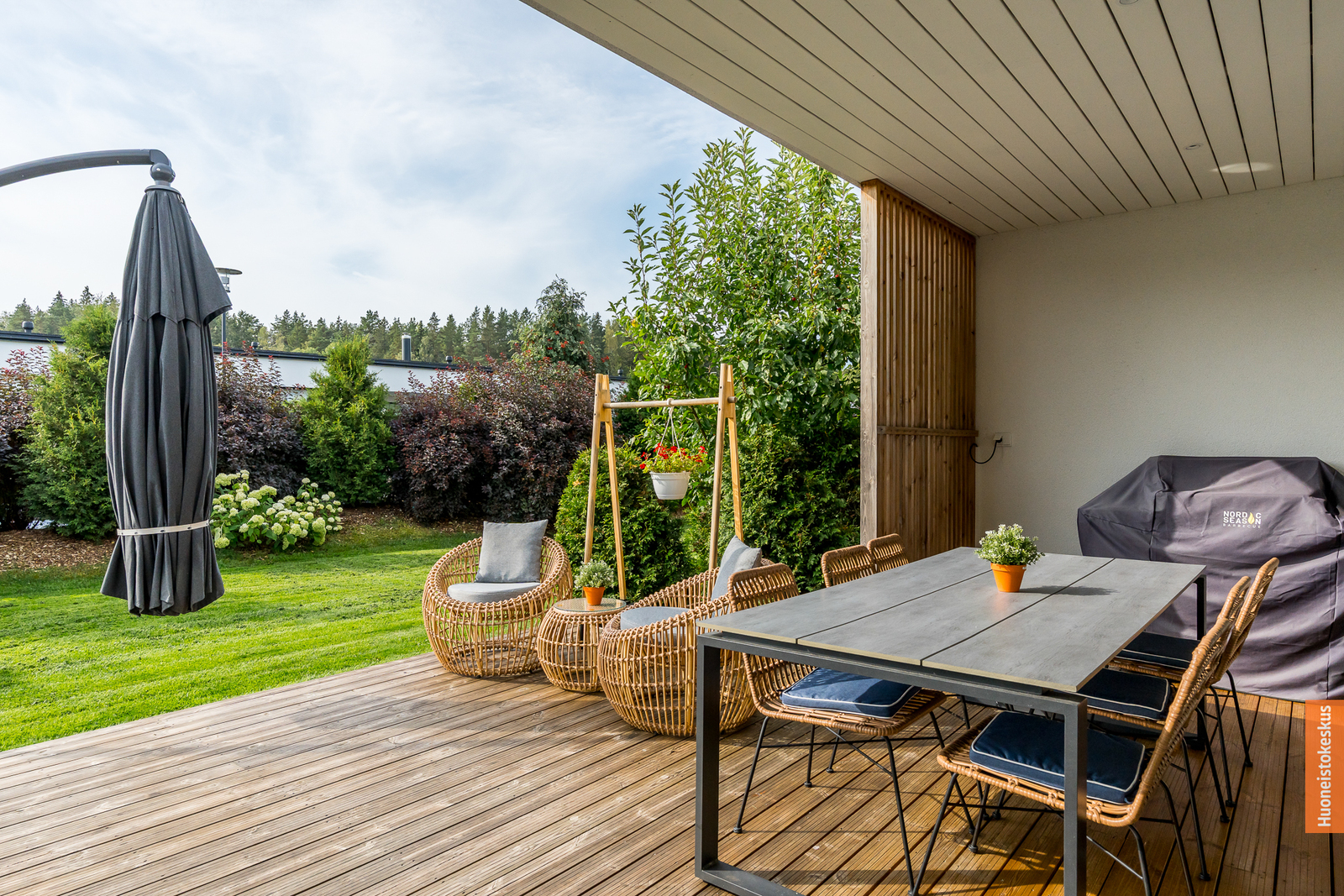 Päätyasunnon yksityisyys, luonnonvalo ja avarat tilaratkaisut kutsuvat tutustumaan tähän kauniiseen kotiin. Heti sisään astuessa huomaa, kuinka ilmavuus ja harmoninen värimaailma luovat rauhallisen tunnelman. Suuret ikkunapinnat avaavat näkymät vehreään ympäristöön ja tuovat sisään valoa vuodenajasta toiseen.