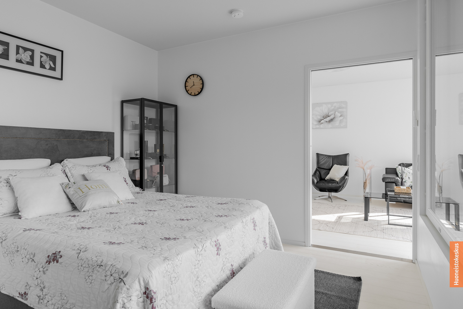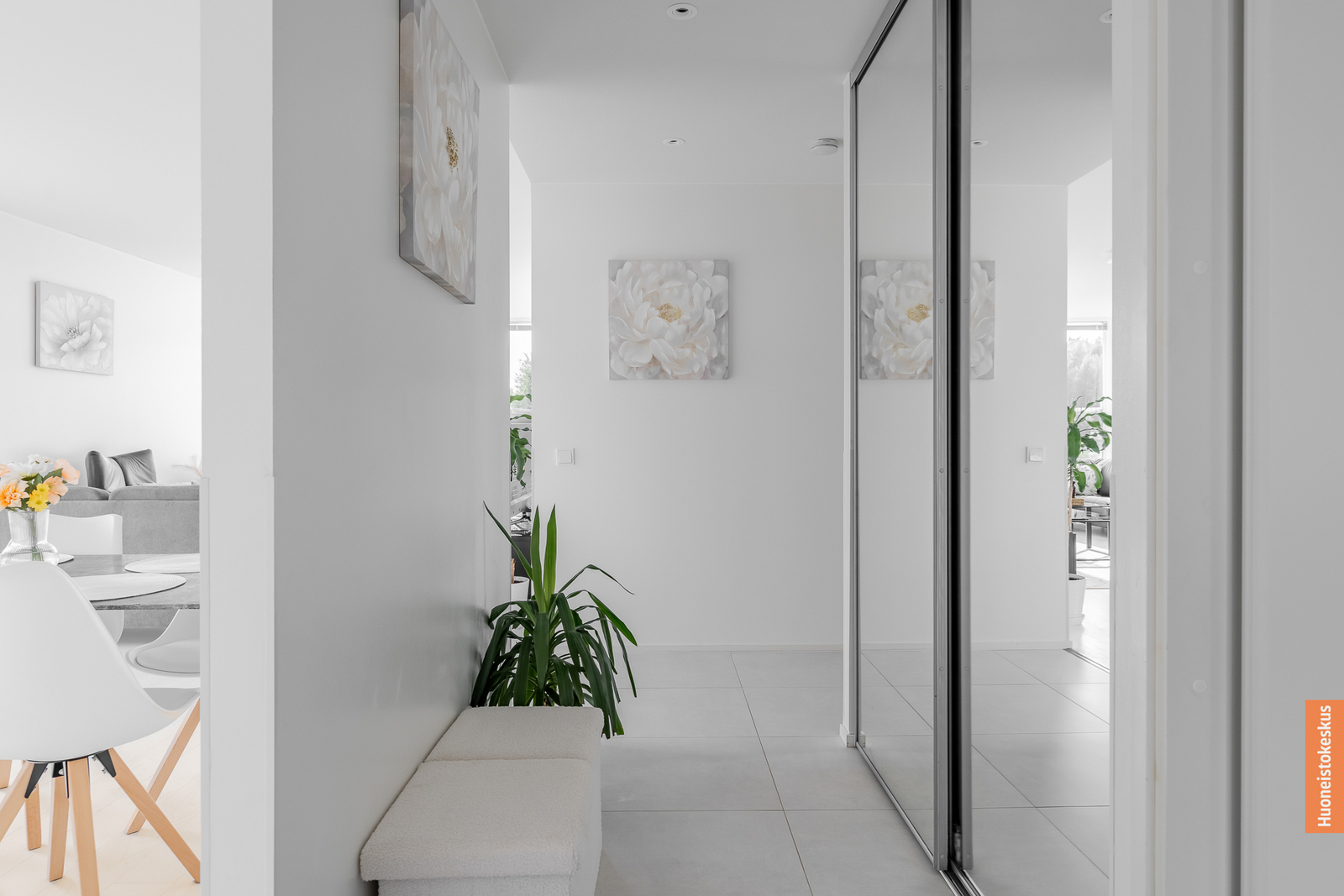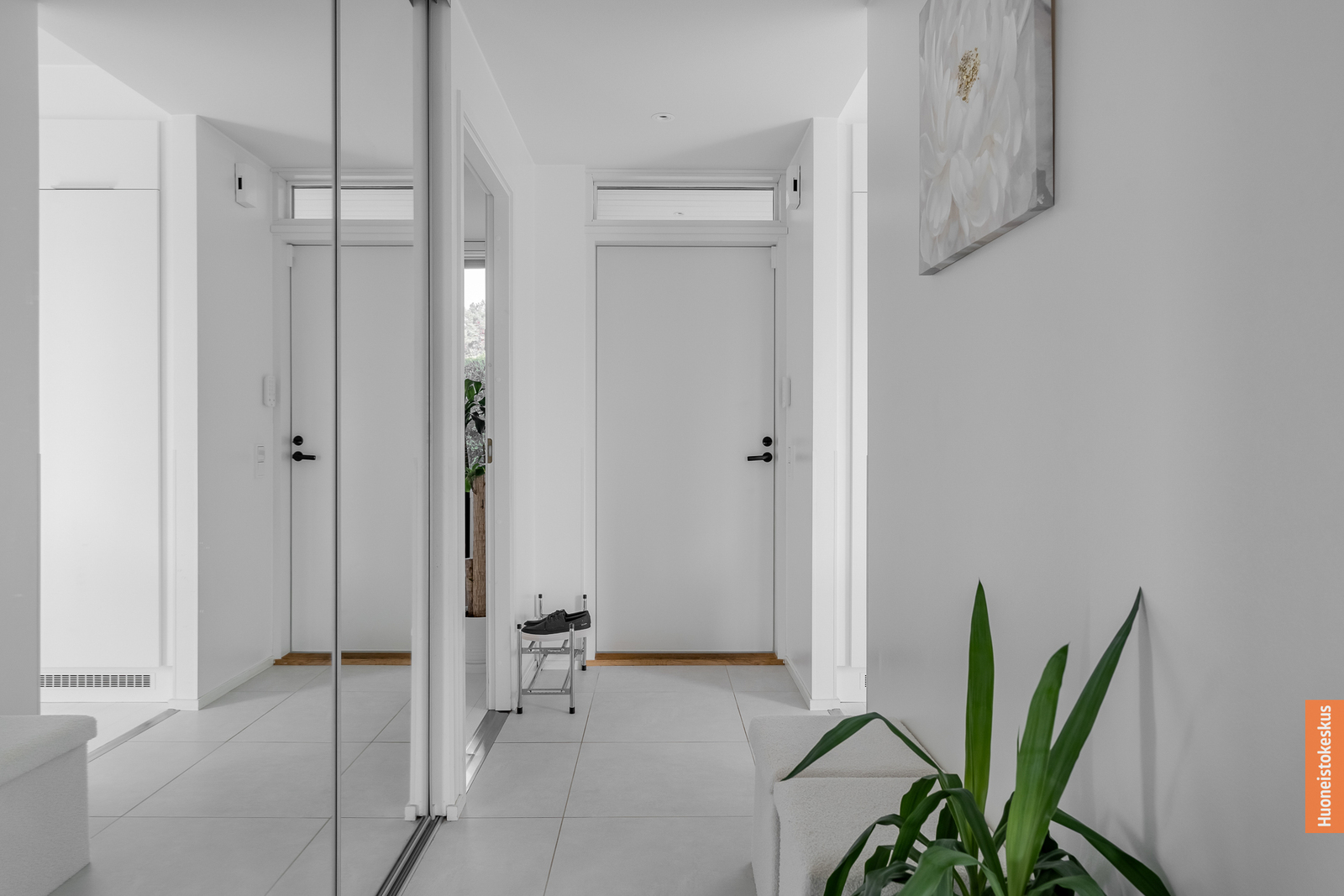 Säilytystilaa löytyy hyvin. Makuuhuoneissa on korkeat liukuovikaapistot, jotka tarjoavat runsaasti tilaa vaatteille ja tekstiileille. Myös eteinen on varustettu käytännöllisillä kaapeilla, ja kodinhoitohuoneessa kaapistorivi pitää arjen tavarat järjestyksessä. Lisäksi huoneistoon kuuluu lämmin varasto, joka tuo lisää tilaa harrastusvälineille ja kausisäilytykselle.