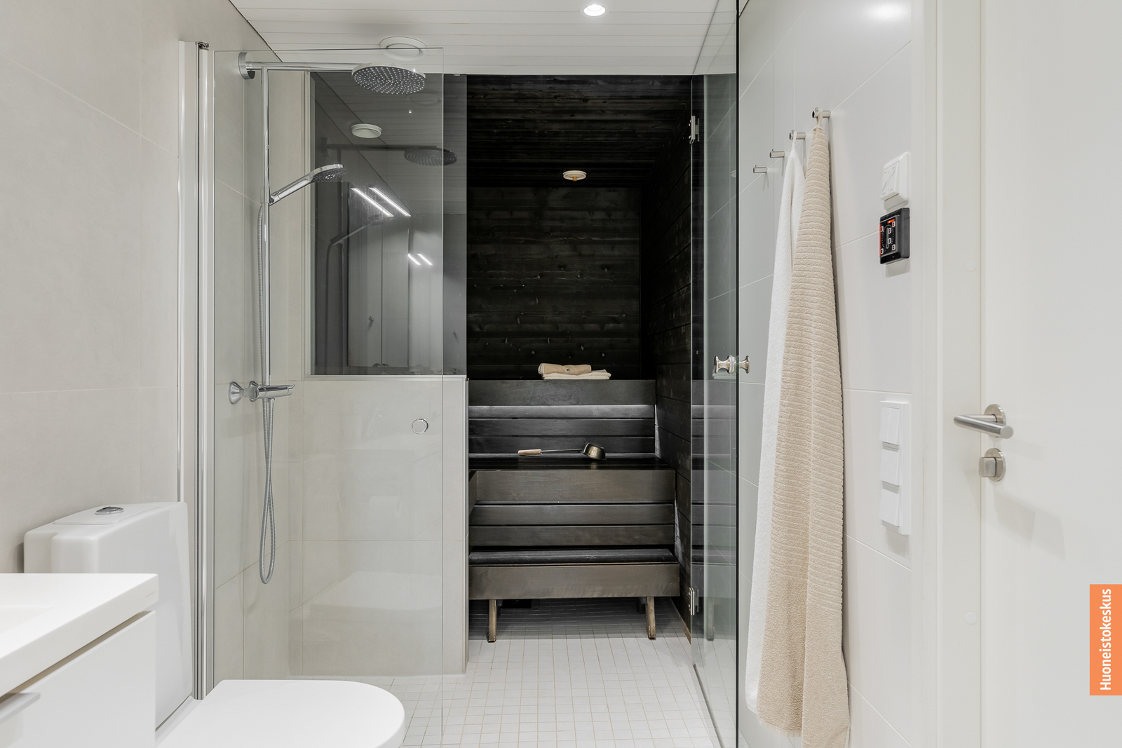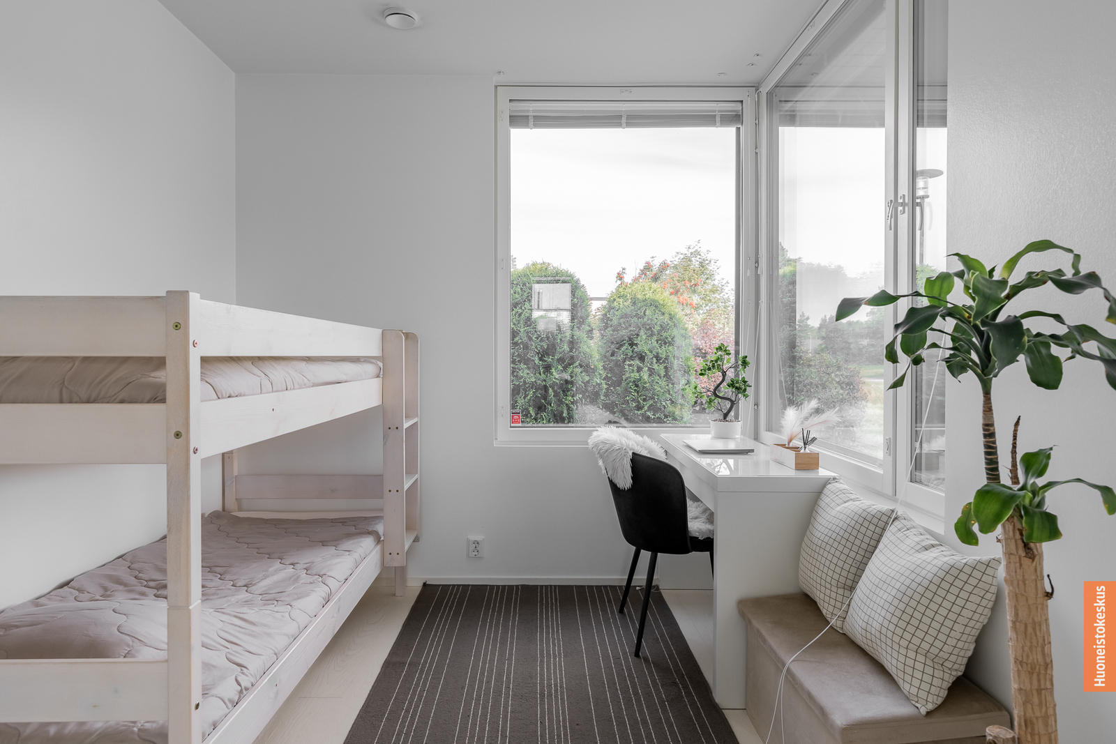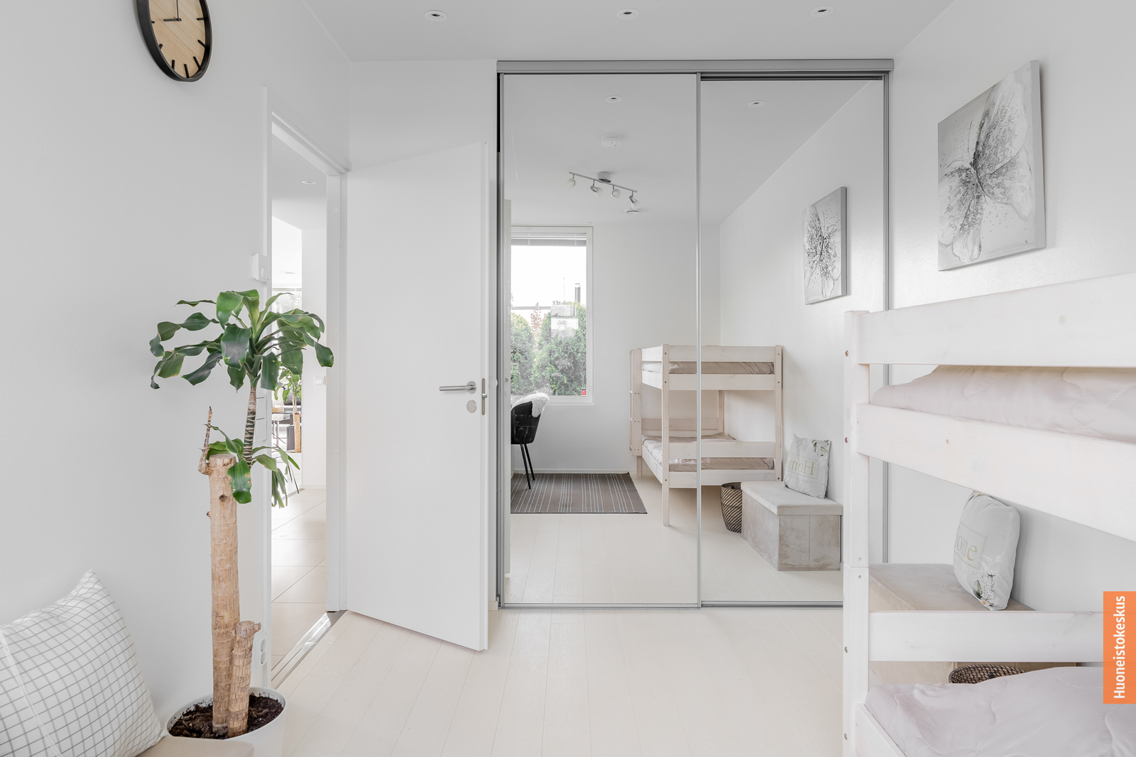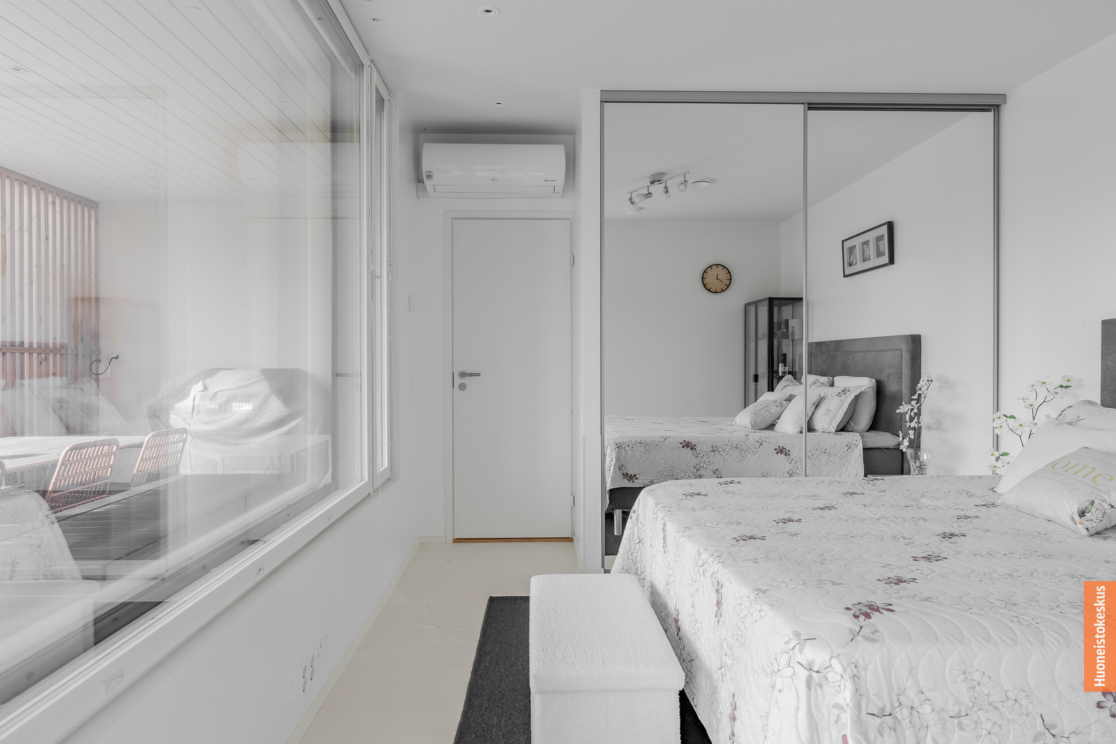 Säilytystilaa löytyy hyvin. Makuuhuoneissa on korkeat liukuovikaapistot, jotka tarjoavat runsaasti tilaa vaatteille ja tekstiileille. Myös eteinen on varustettu käytännöllisillä kaapeilla, ja kodinhoitohuoneessa kaapistorivi pitää arjen tavarat järjestyksessä. Lisäksi huoneistoon kuuluu lämmin varasto, joka tuo lisää tilaa harrastusvälineille ja kausisäilytykselle.
