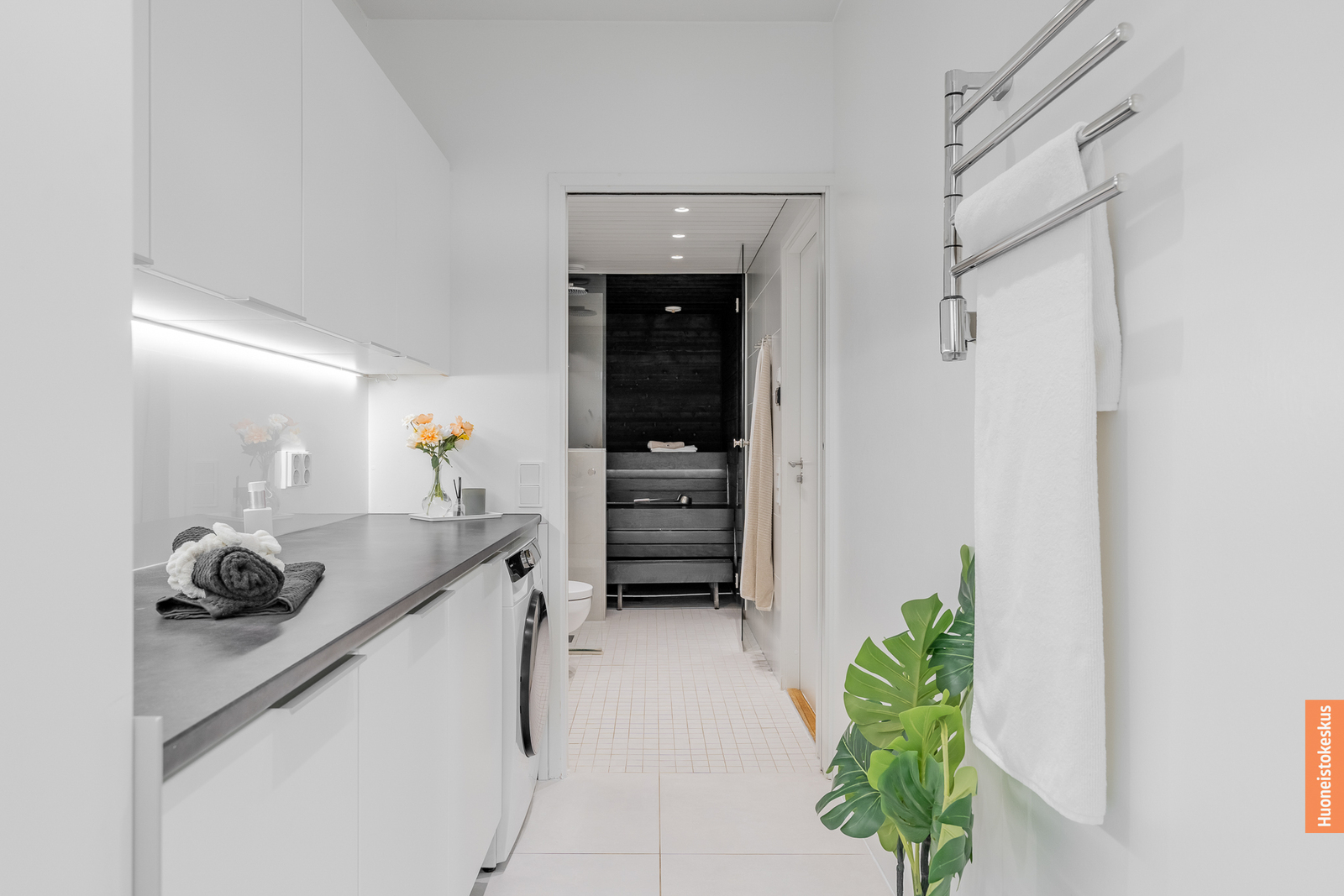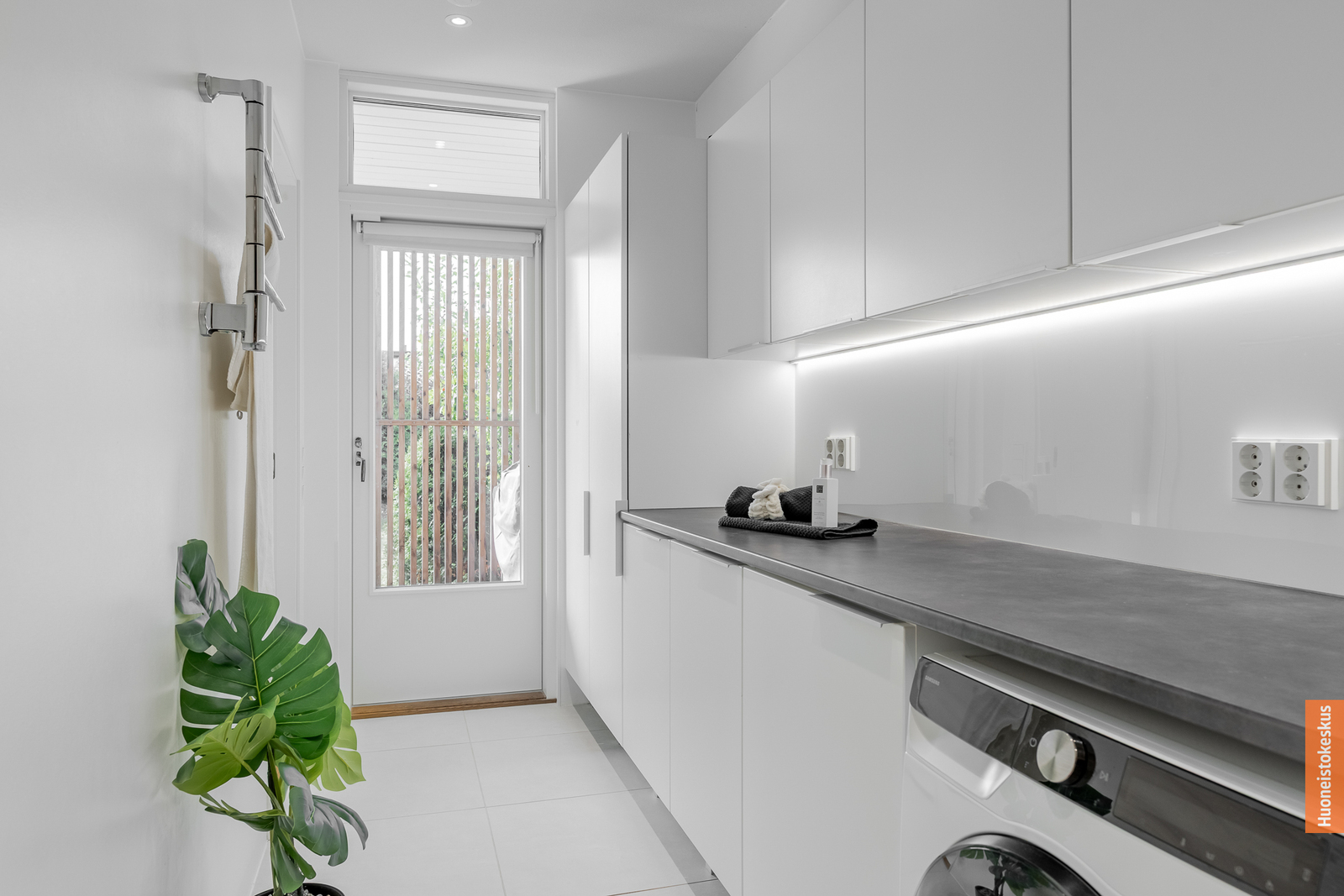 | Kodinhoitohuoneen kuvaus | Lattialämmitys, lattiakaivo, pesukoneliitäntä, pöytätaso ja pyykkikaapit, lattiat (laatta), seinät (maali) |