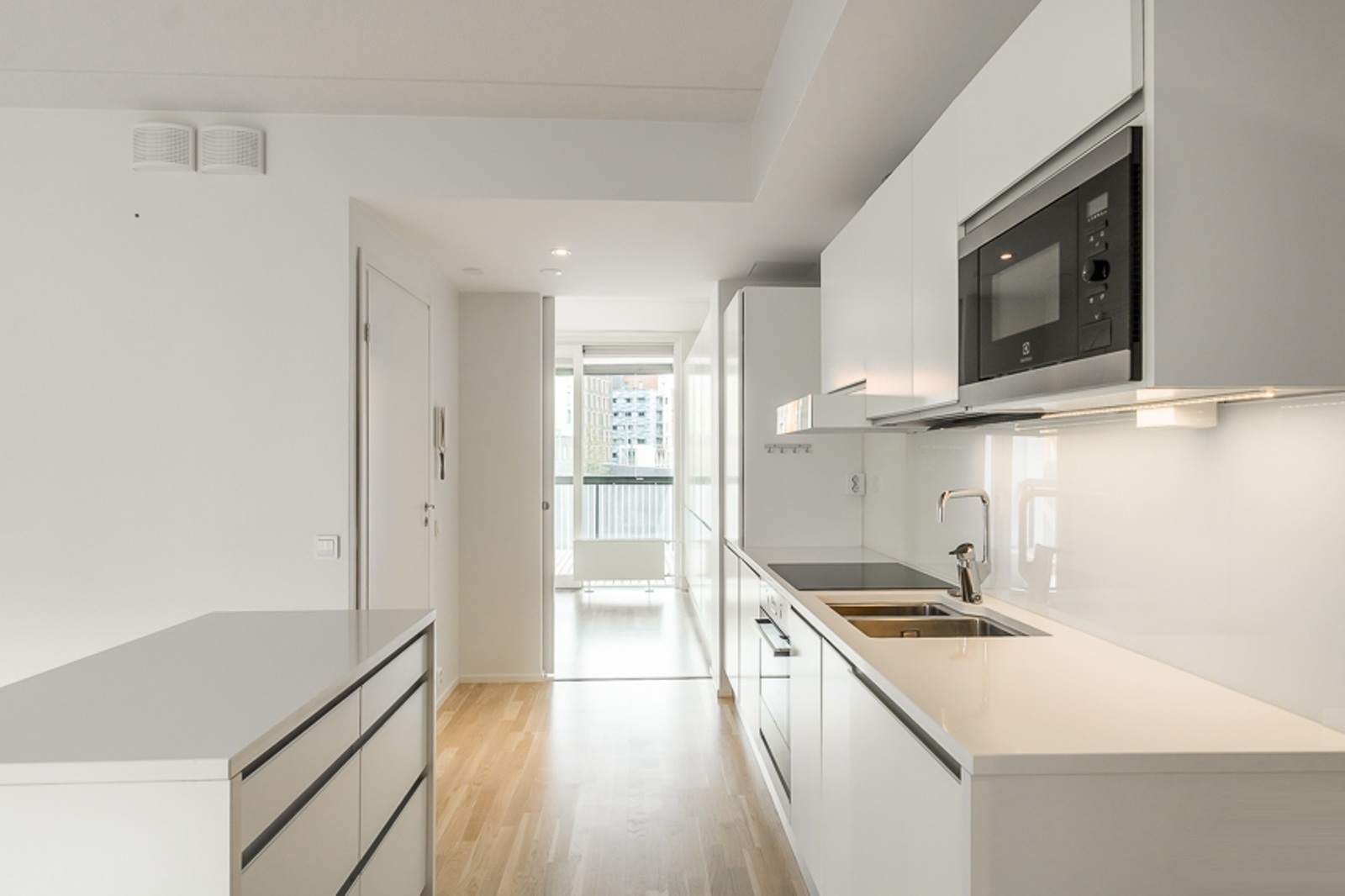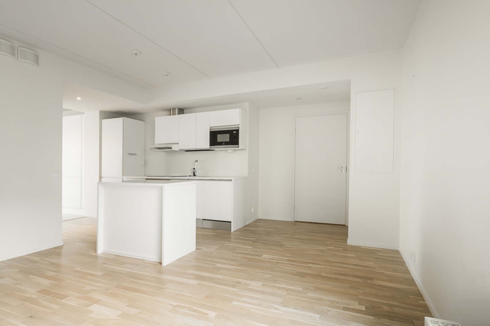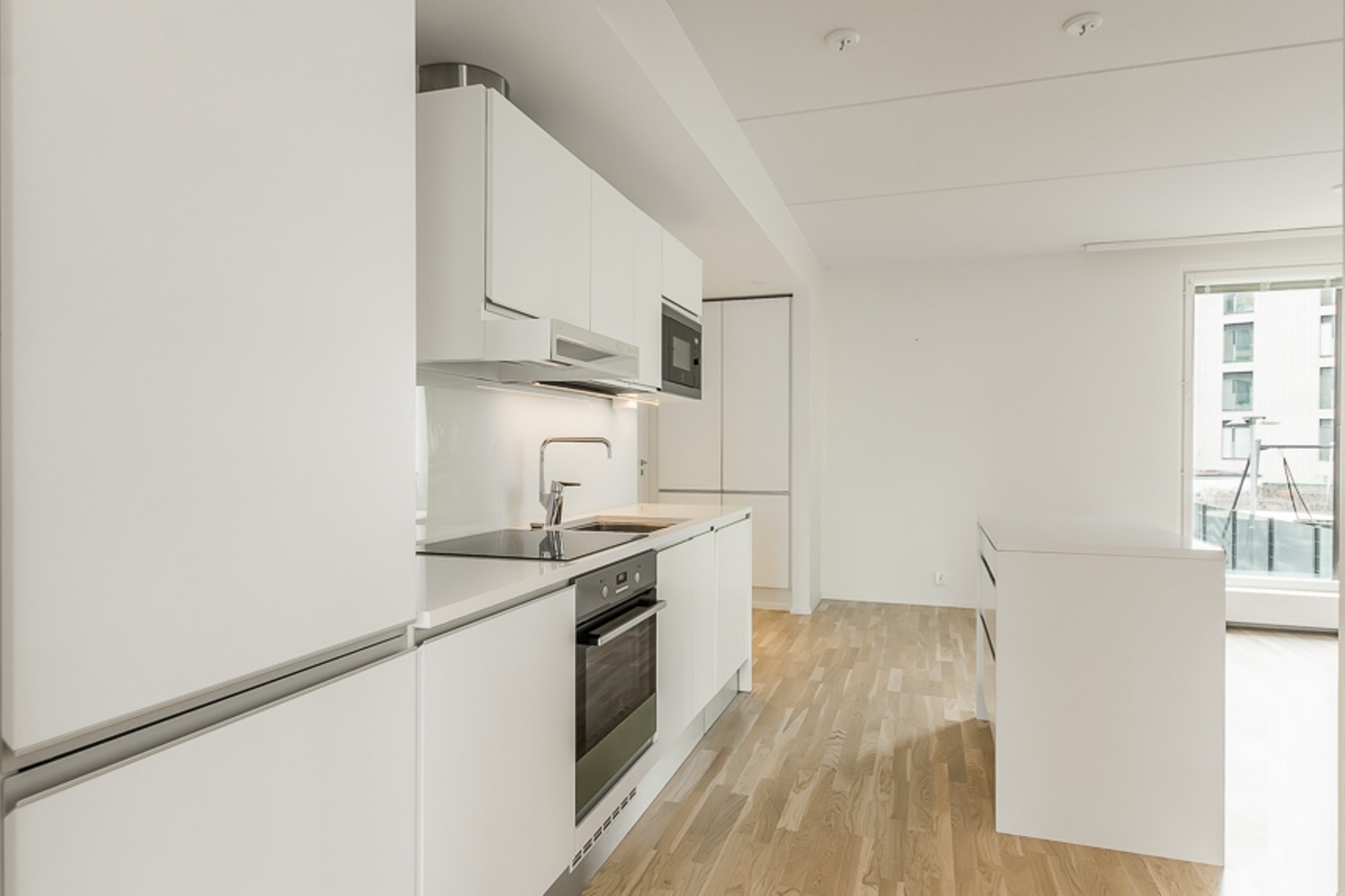 Kompaktin olohuoneen yhteydessä on siisti avokeittiö valkoisine kaapinovineen ja kivitasoineen, makuuhuoneessa on reilusti säilytystilaa ja sen yhteydessä on noin 16-neliöinen terassiparveke. Tyylikkäässä kylpyhuoneessa on tilaa pesukoneelle ja tilaa avartaa mukavasti lavuaarin yläpuolelle asennettu iso peili.