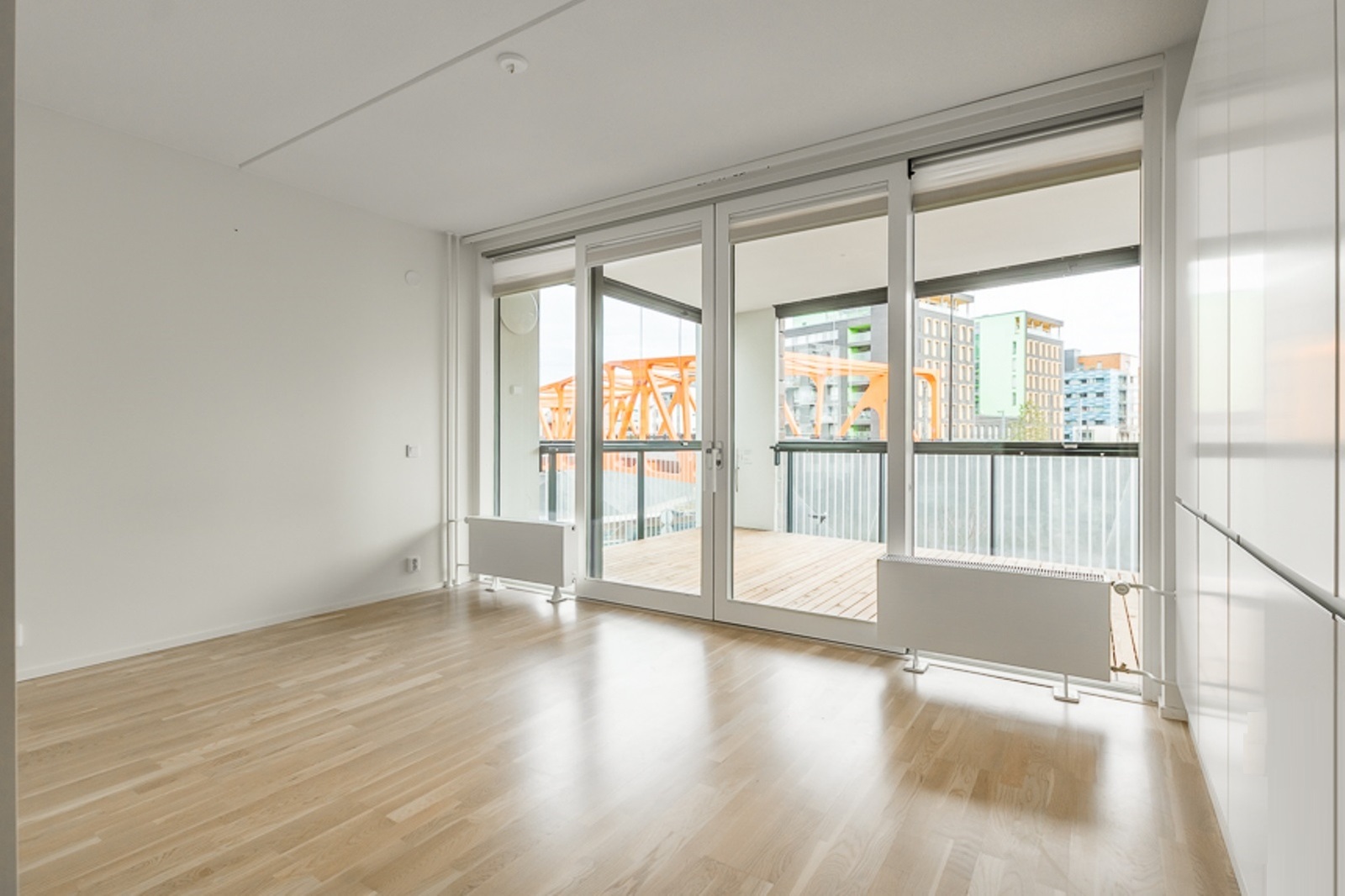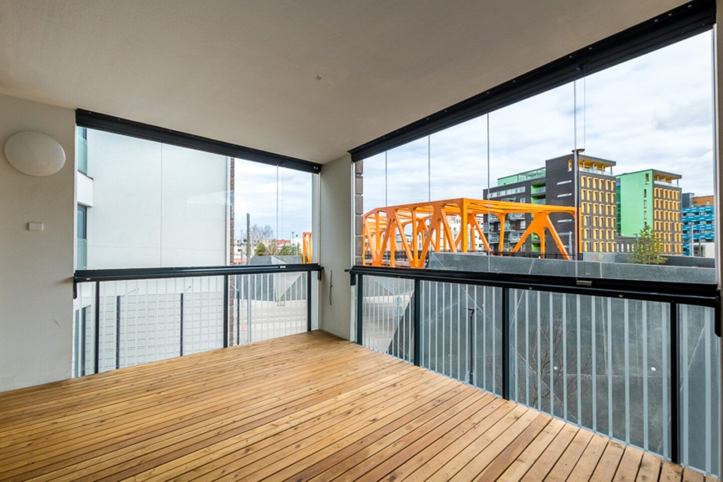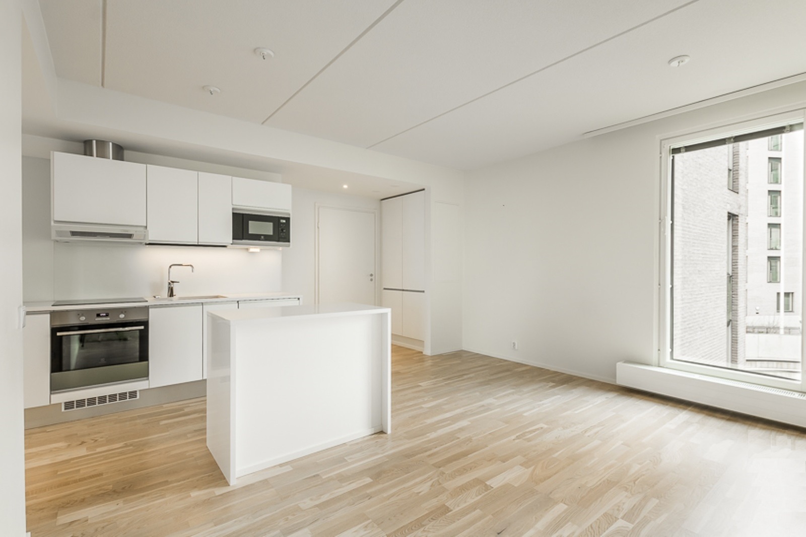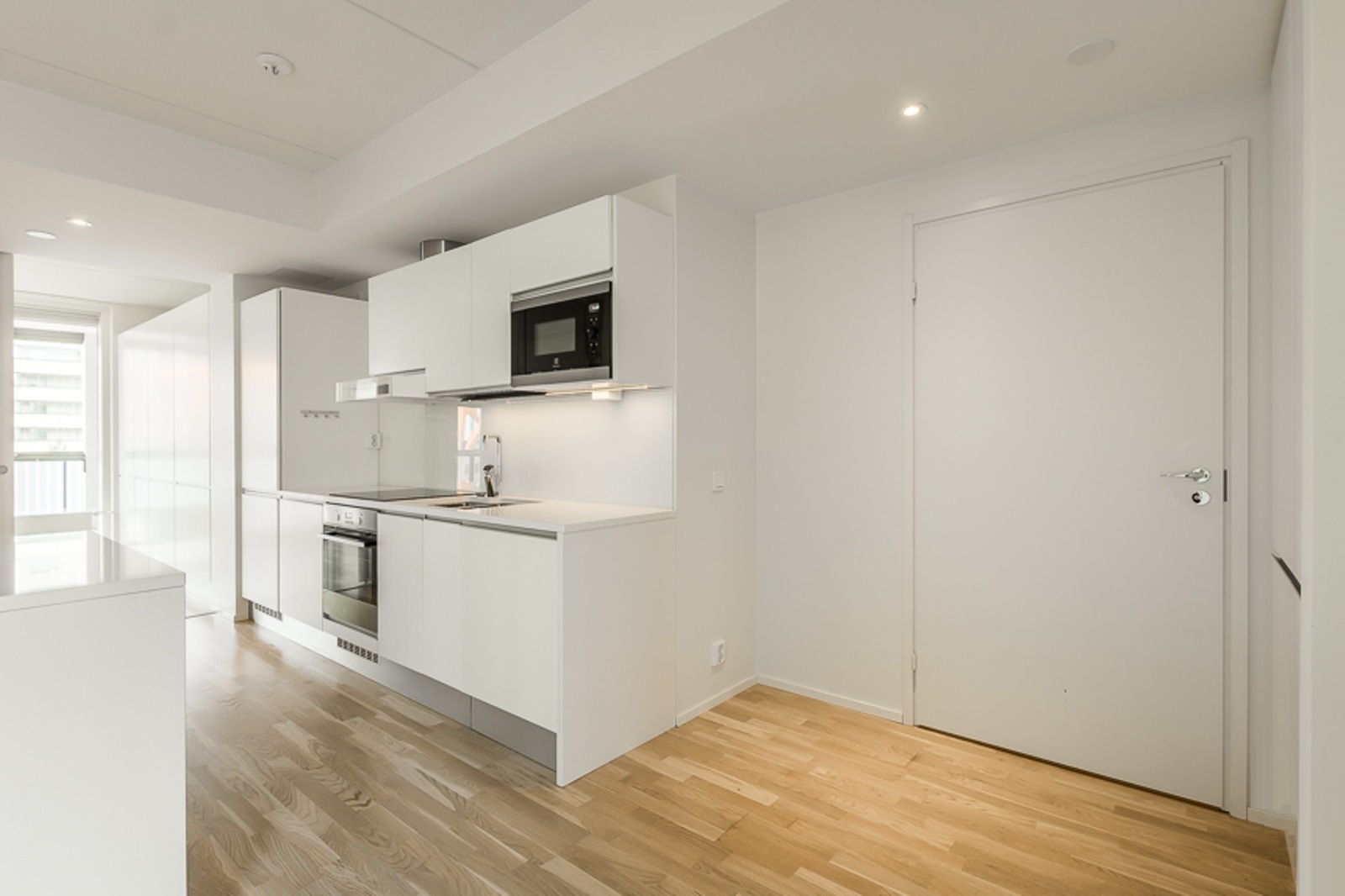Kompaktin olohuoneen yhteydessä on siisti avokeittiö valkoisine kaapinovineen ja kivitasoineen, makuuhuoneessa on reilusti säilytystilaa ja sen yhteydessä on noin 16-neliöinen terassiparveke. Tyylikkäässä kylpyhuoneessa on tilaa pesukoneelle ja tilaa avartaa mukavasti lavuaarin yläpuolelle asennettu iso peili.