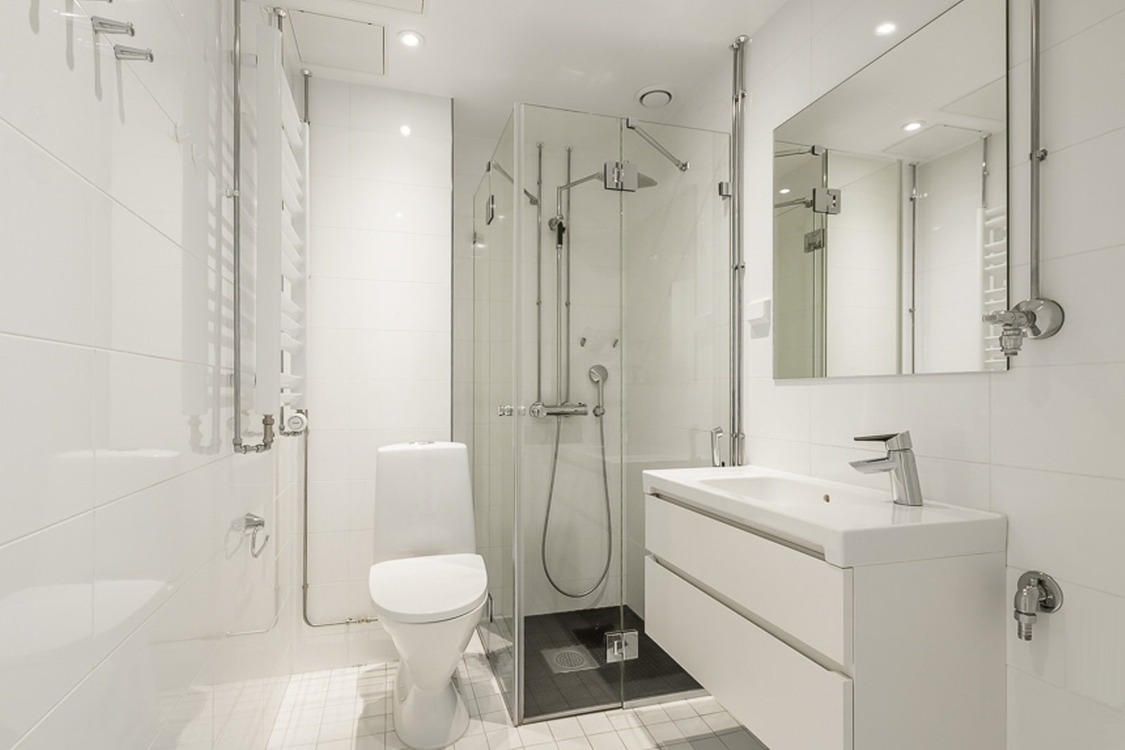 | Kylpyhuoneen kuvaus | Peili, suihkuseinä, suihku, wc-istuin, pesukoneliitäntä ja kiinteät valaisimet, seinät (kaakeli), lattiat (laatta) |
