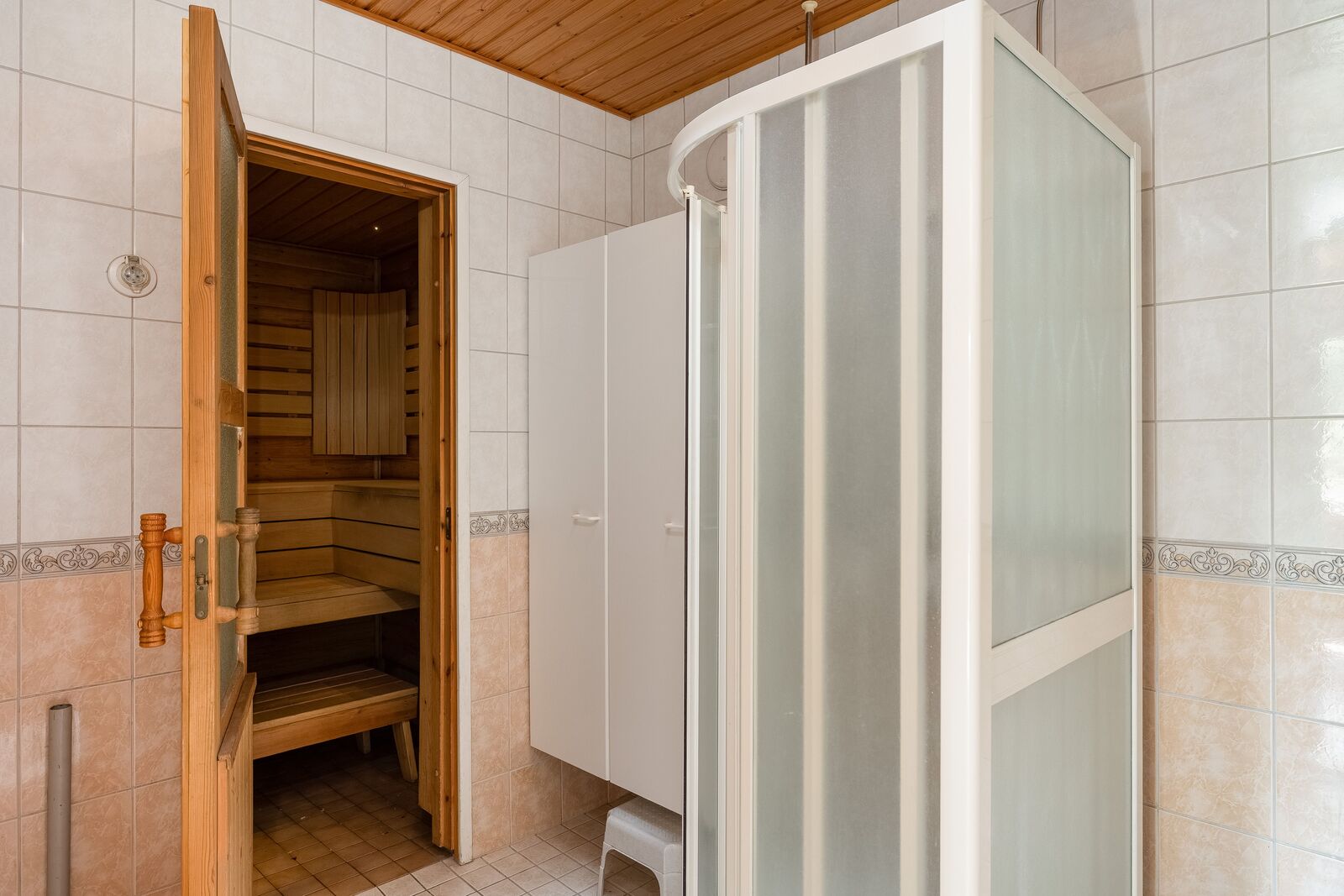 | Saunan kuvaus | Seinät (puu ja osalaatoitus), lattiat (laatta), Puukiuas |