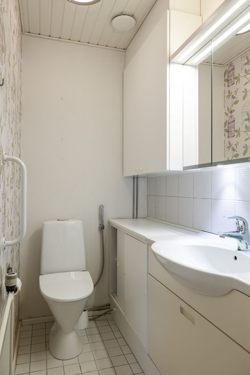 | Kylpyhuoneen kuvaus | Suihkukaappi, lattialämmitys, suihku, pesukoneliitäntä ja peili, seinät (kaakeli), lattiat (laatta) |