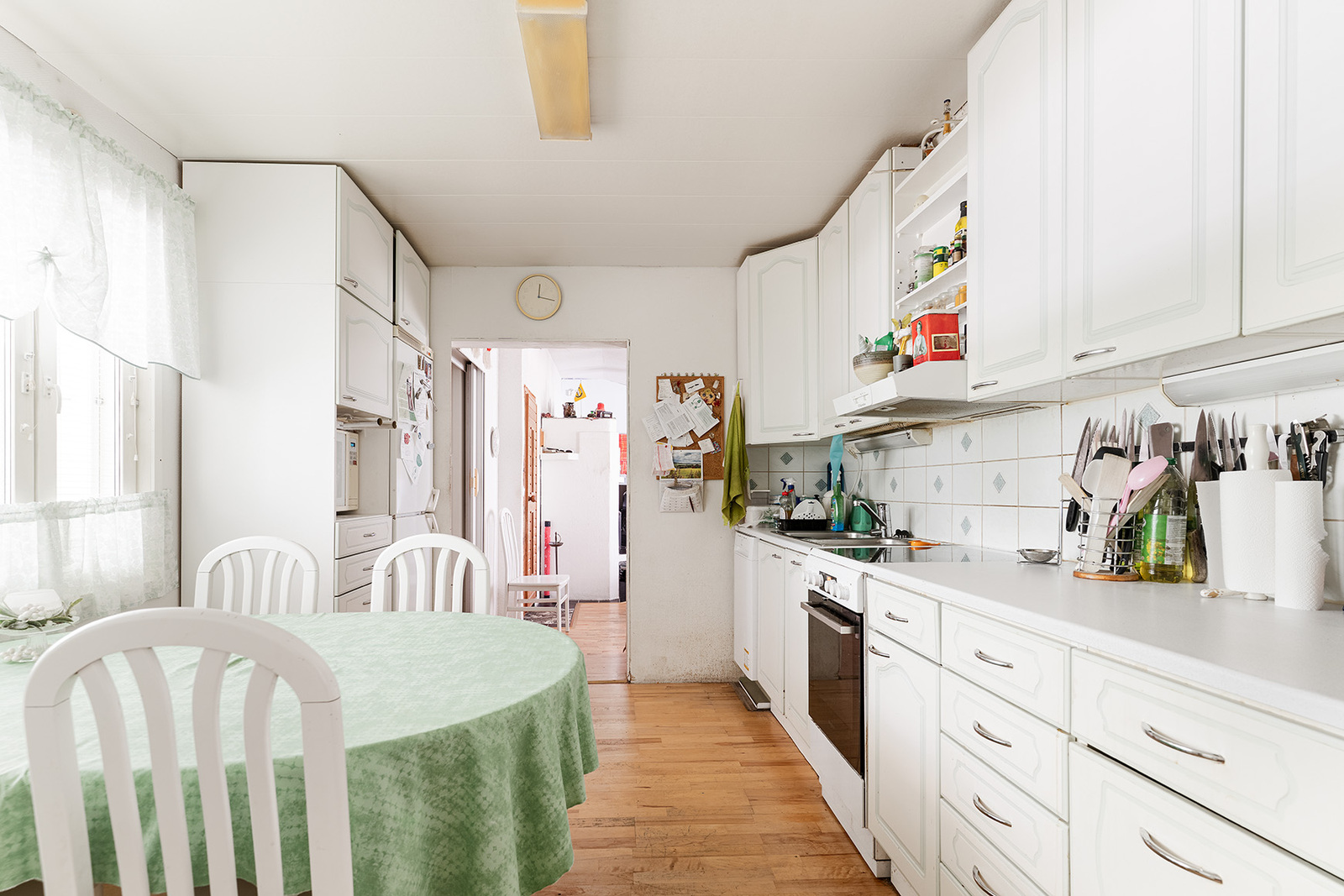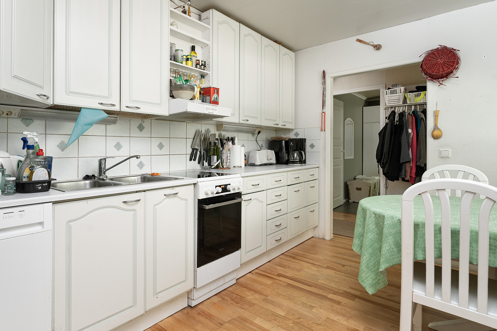 Liesi (Keraaminen liesi), seinät (maali), lattiat (parketti), jääkaappipakastin, mikroaaltouuni, astianpesukone, liesituuletin ja liesi |
