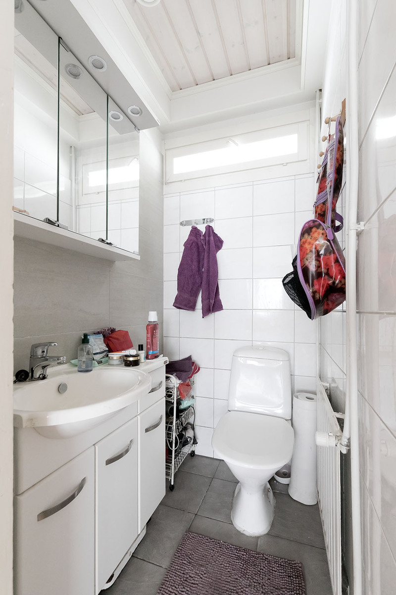 Pesukoneliitäntä, suihku ja wc-istuin, seinät (kaakeli), lattiat (laatta), Pesuhuoneen pinnat alkuperäiset. Erillinen wc rwmontoitu 2016 |