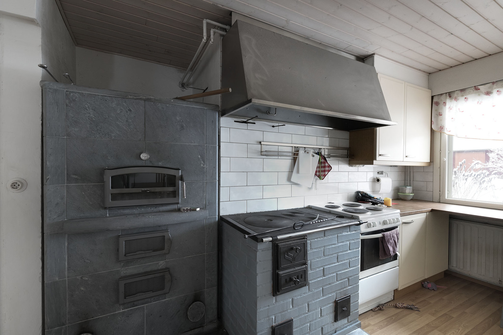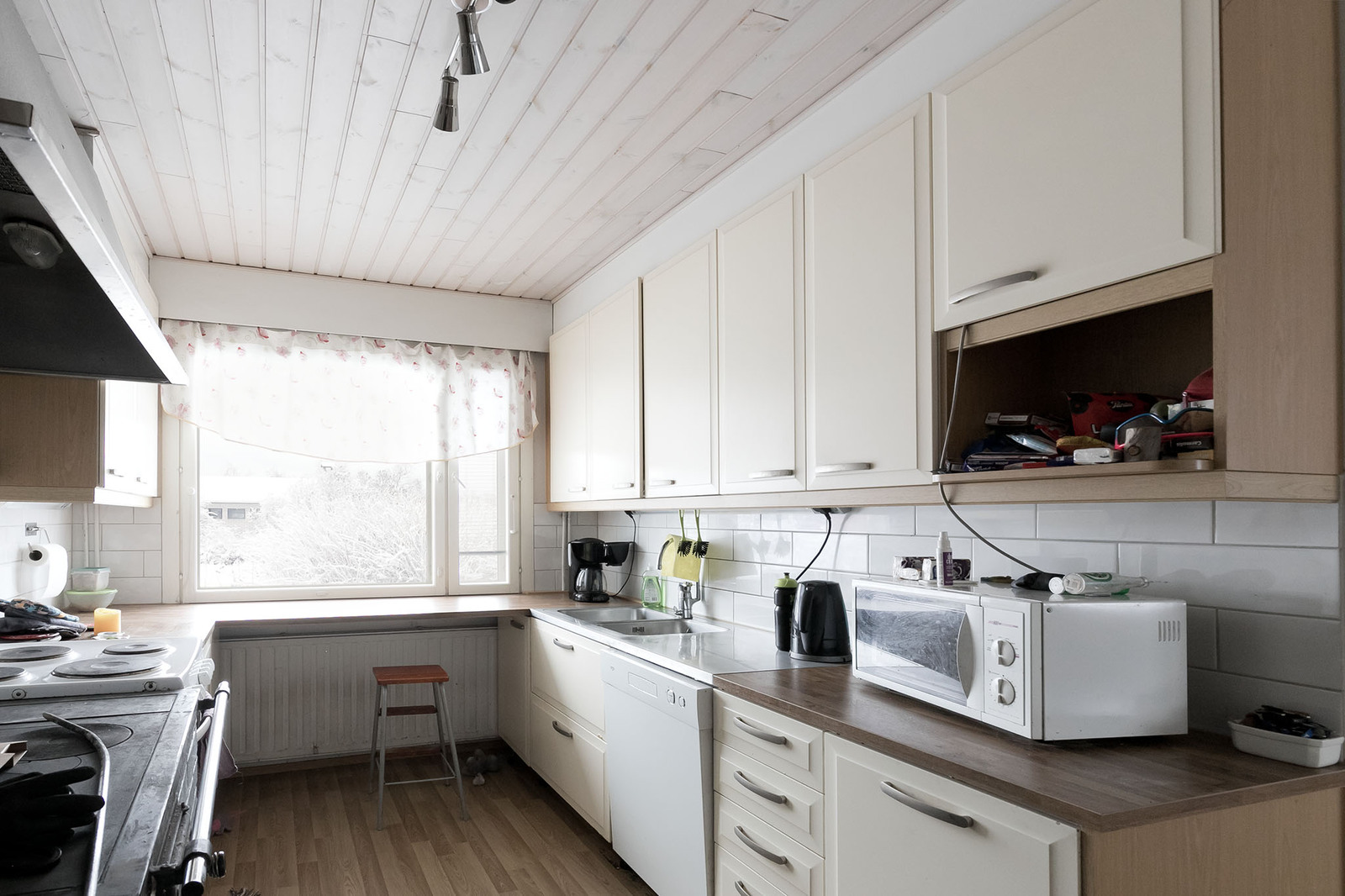 Liesi (puuliesi, sähköliesi), työtasot (laminaatti), seinät (maali), lattiat (laminaatti), mikroaaltouuni, liesi, jääkaappipakastin, astianpesukone ja kiinteät valaisimet, liesituuletin / hormi |