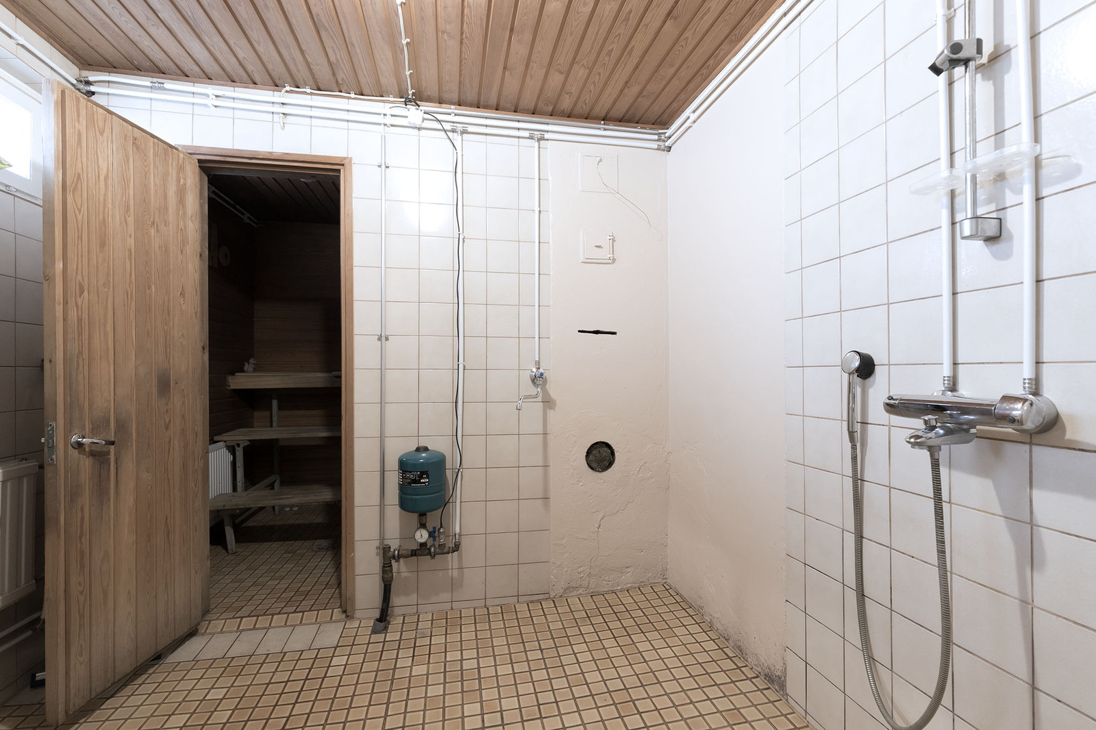 Pesukoneliitäntä, suihku ja wc-istuin, seinät (kaakeli), lattiat (laatta) |