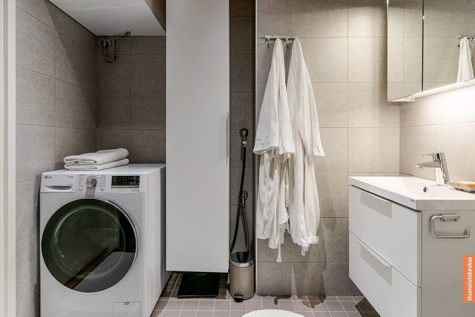 WC-istuin, pesukoneliitäntä, suihkuseinä, lattialämmitys, suihku, peilikaappi ja kiinteät valaisimet, seinät (kaakeli), lattiat (laatta) |