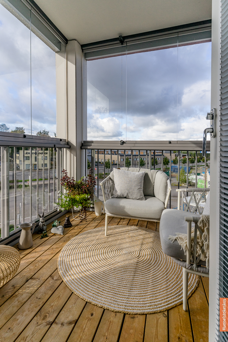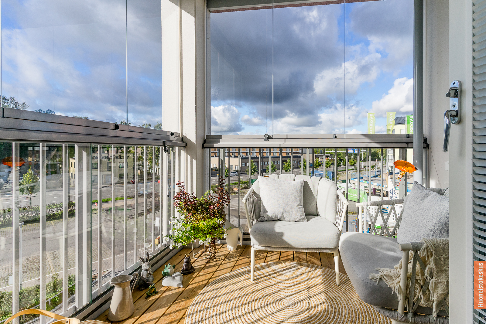 Kulmahuoneisto, jonka lasitetulta, tilavalta parvekkeelta on kauniit näkymät Turun Linnaan.