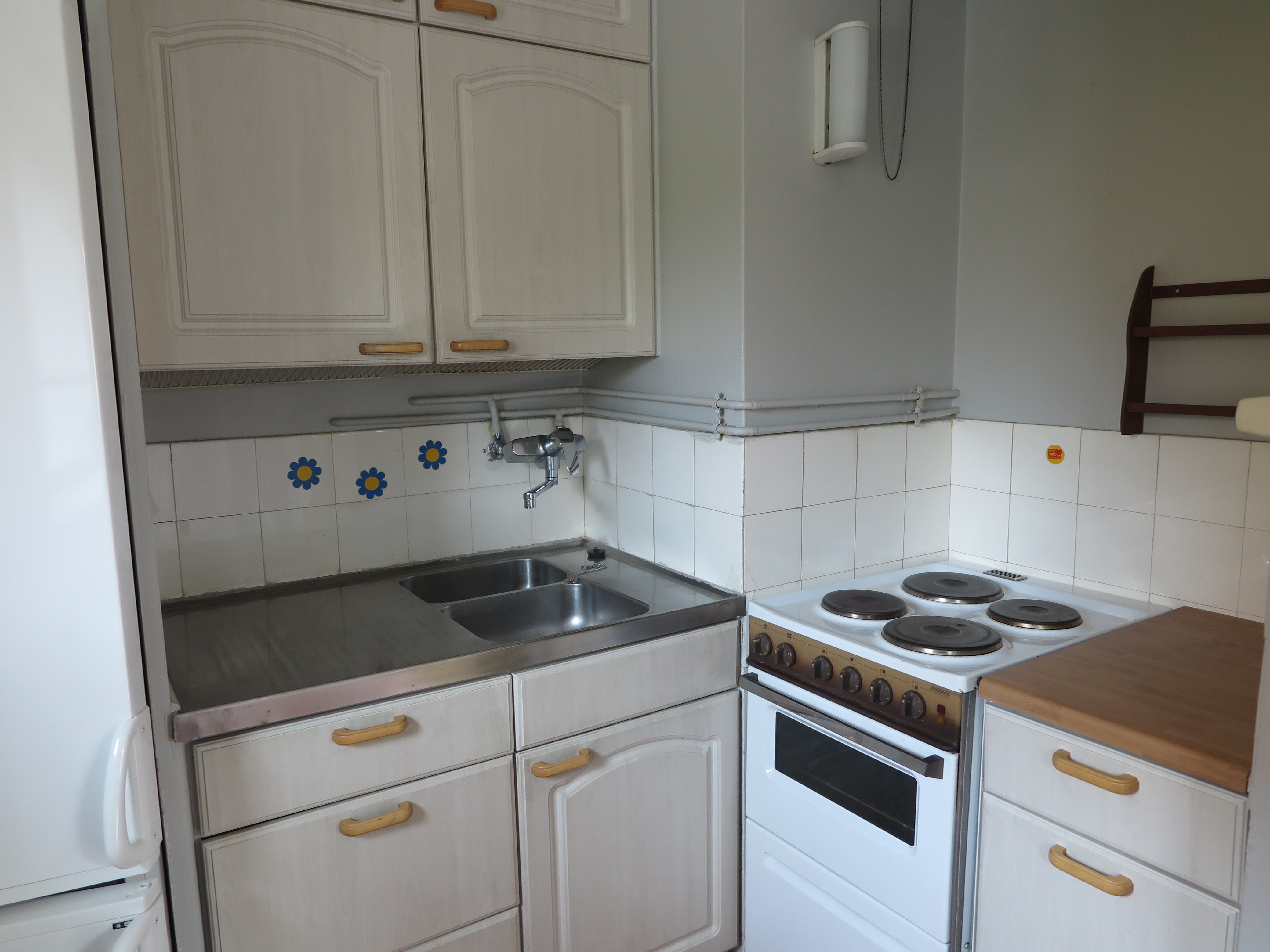 Liesi (Sähköhella), työtasot (laminaatti), seinät (maali ja kaakeli), lattiat (muovimatto), jääkaappipakastin, uuni ja liesi |