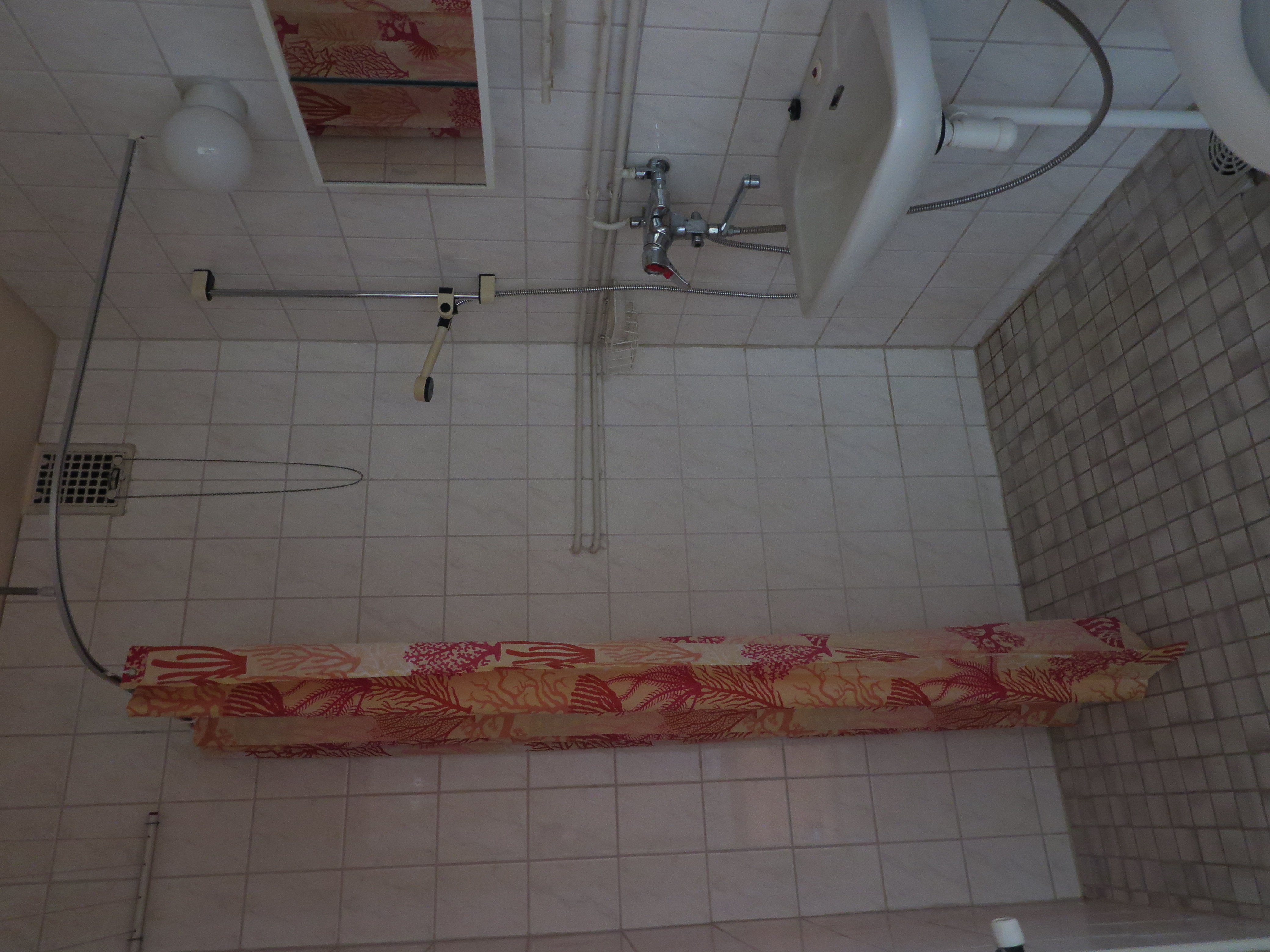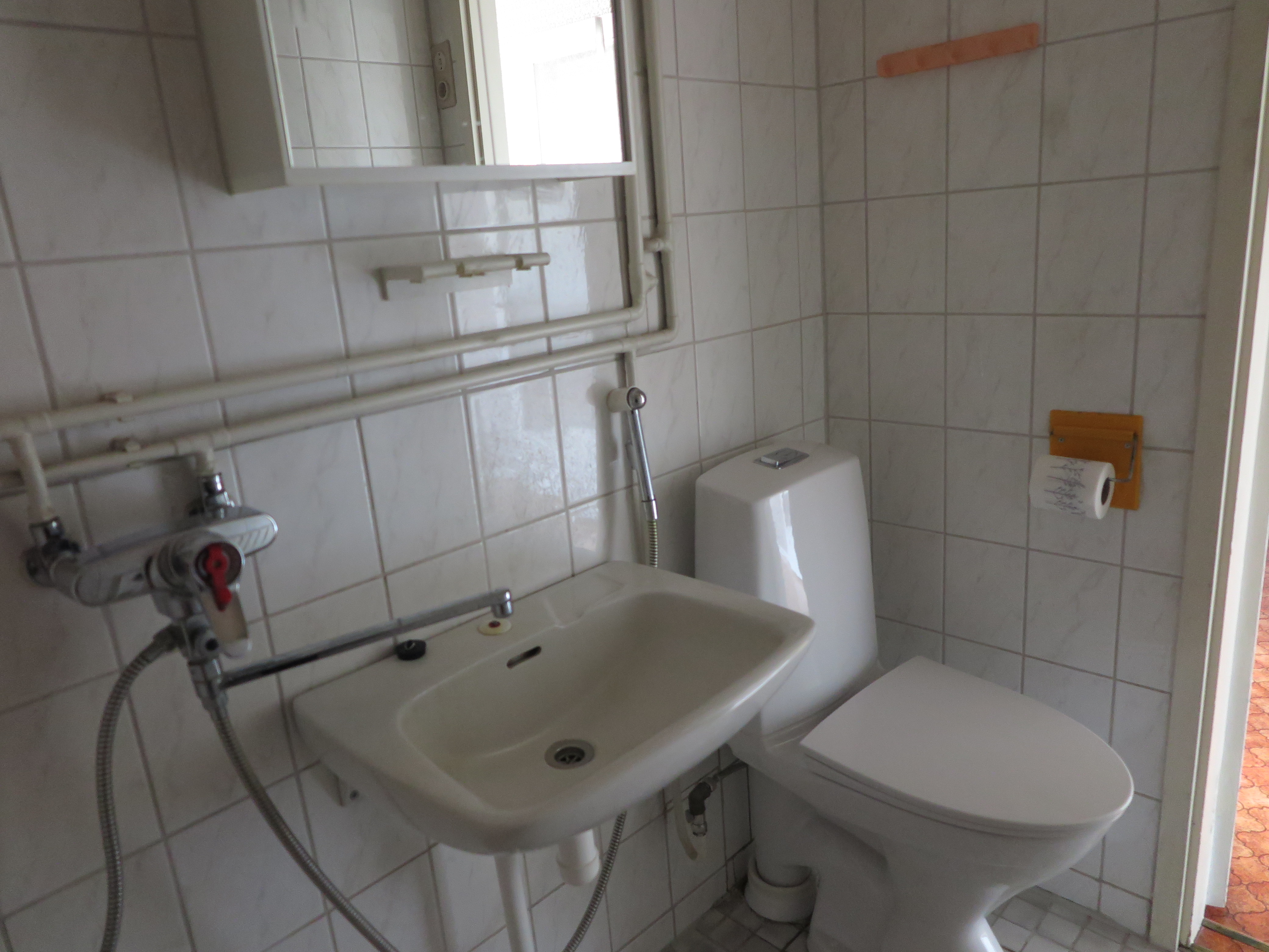 WC-istuin, suihku, pesuallas, bidee-suihku ja peilikaappi, seinät (kaakeli), lattiat (laatta) |