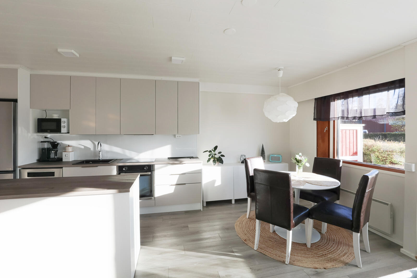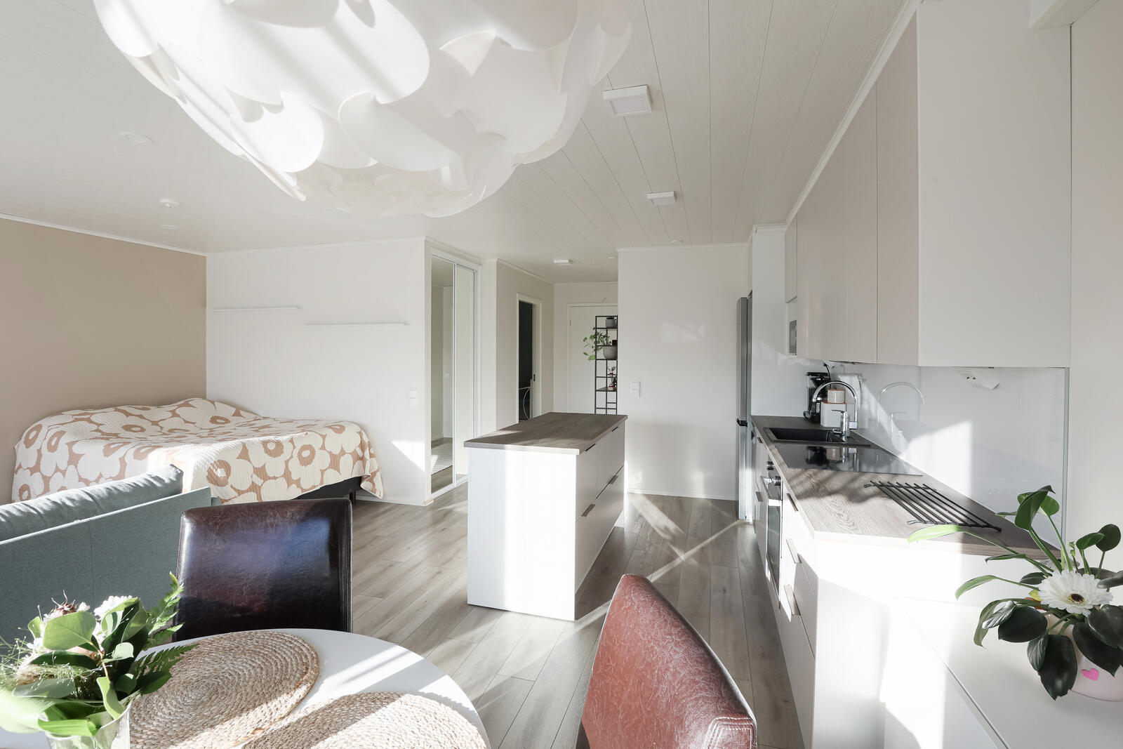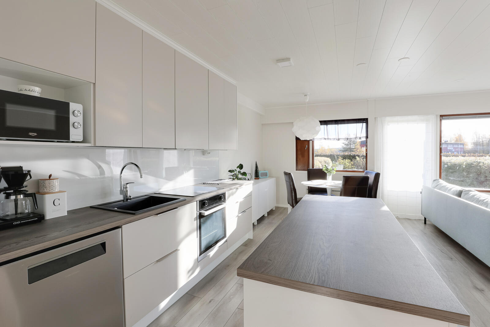 Avoin keittiö, jossa on saareke, on tyylikäs ja käytännöllinen. Olohuoneesta avautuu näkymä omalle terassille ja puutarhaan, mikä tuo lisää tilaa ja mahdollisuuksia rentoutumiseen.