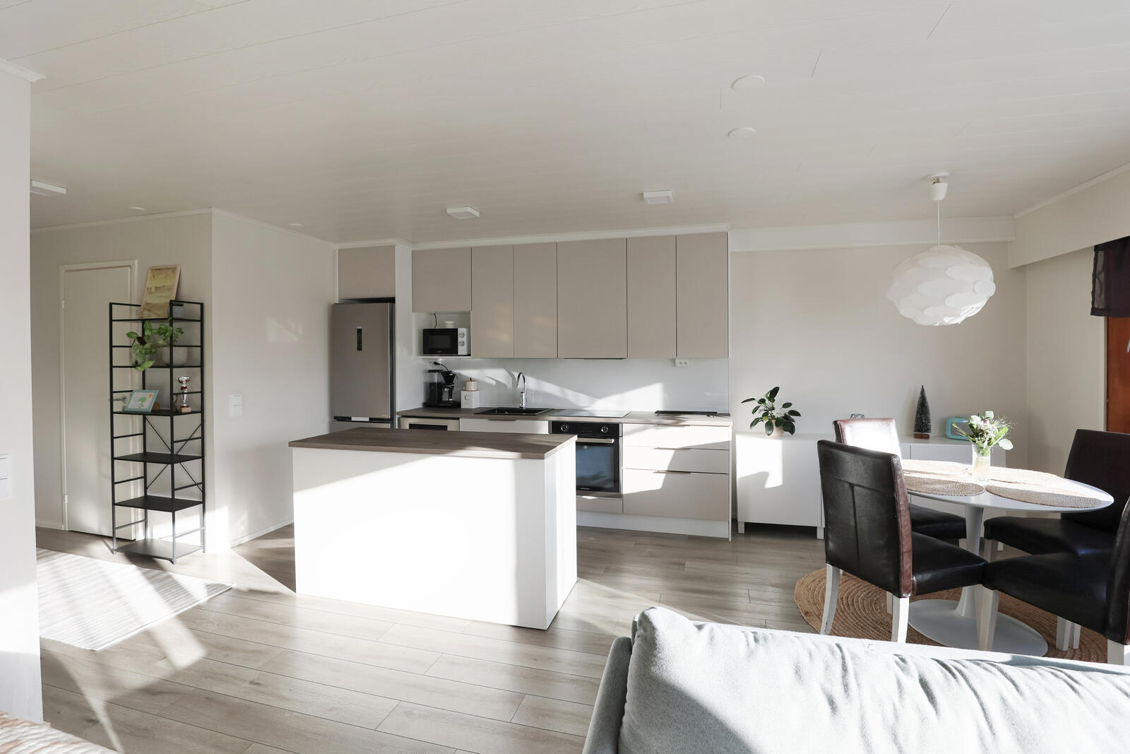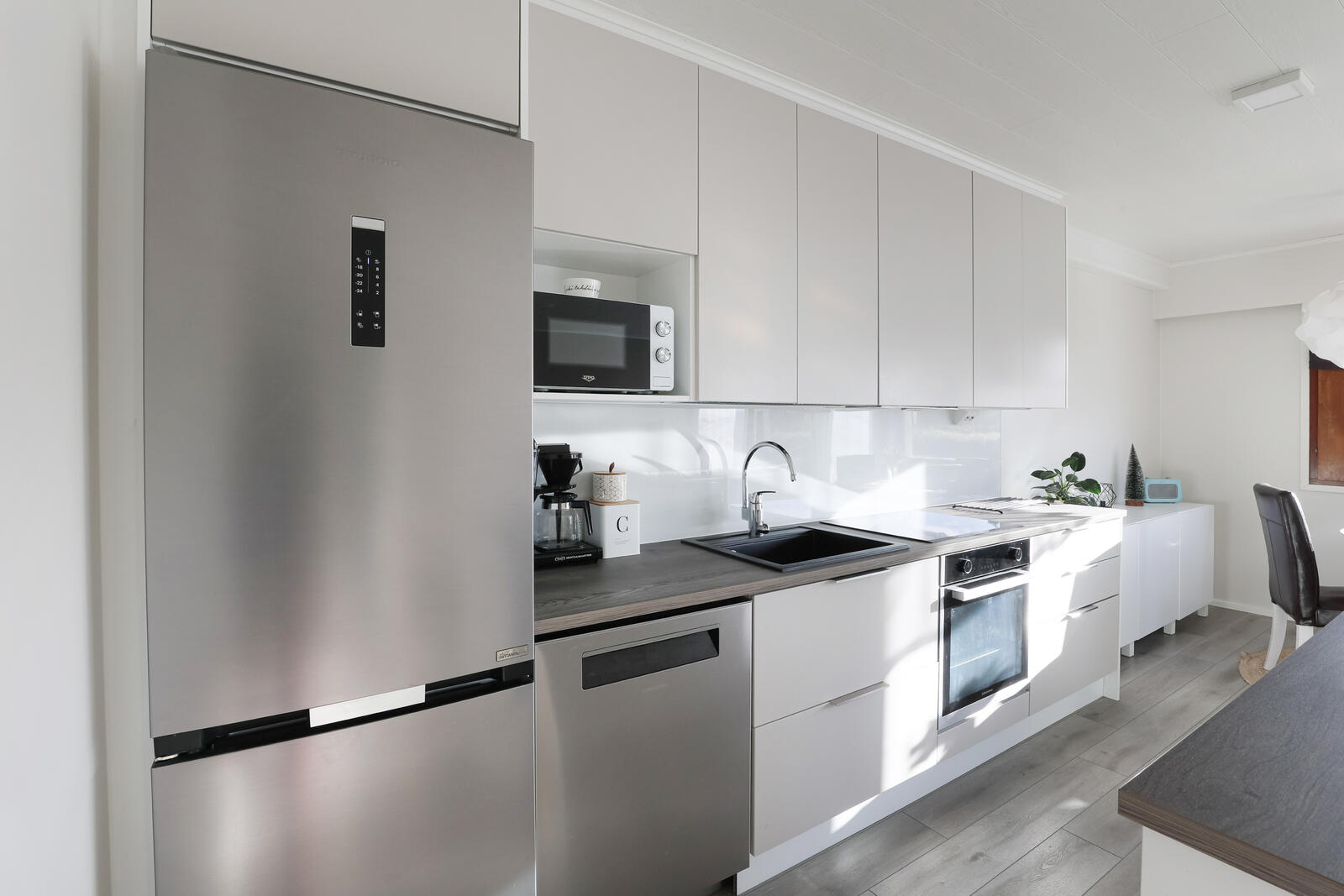 | Keittiön kuvaus | Liesi (Induktioliesi), työtasot (laminaatti), seinät (maali), lattiat (vinyyli), jääkaappipakastin (Uusittu 2023), erillisuuni (Uusittu 2023), liesituuletin (Uusittu 2023) ja liesi (Induktioliesi, uusittu 2023), Avokeittiö, jossa saareke. Vinyylilattiat, maalatut seinät ja MDF-paneeli katossa. Keittiö remontoitu täydellisesti 2023. |
